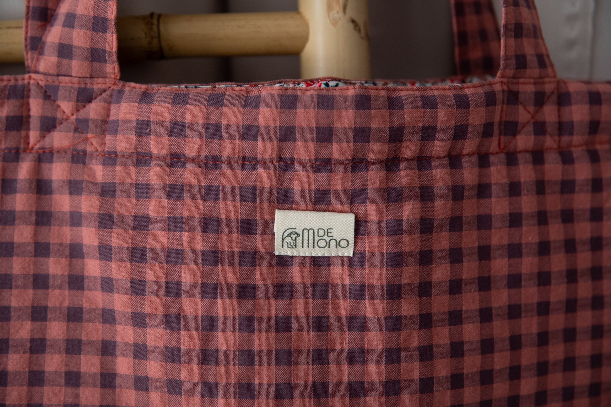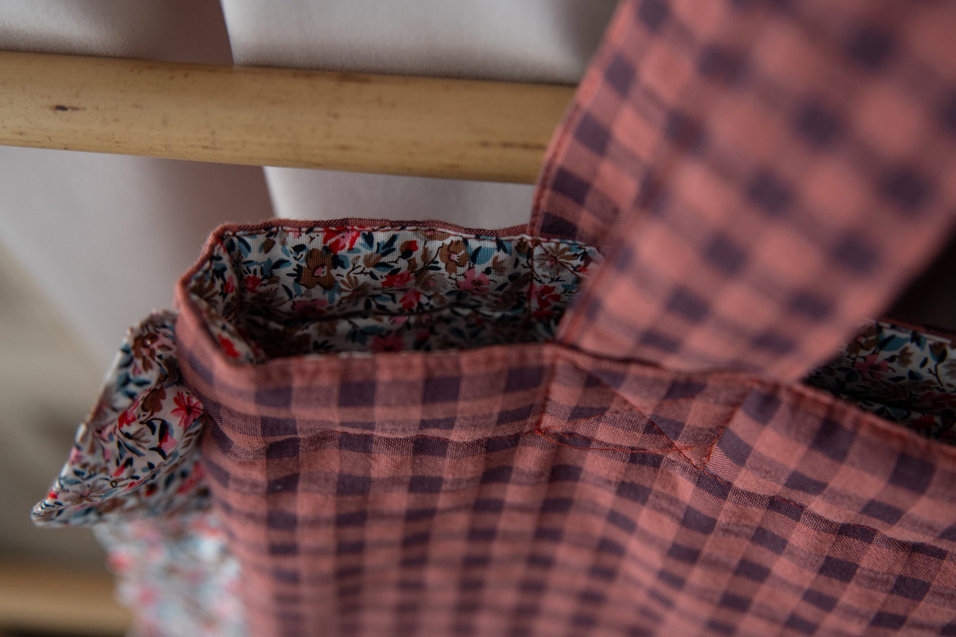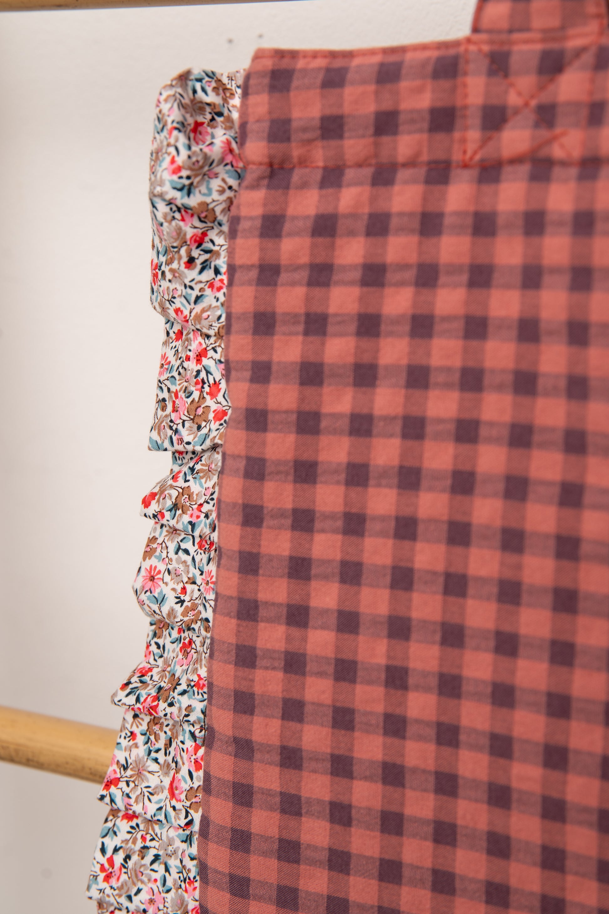 Una tote bag llena de encanto, con una combinación de texturas y estampados que la hacen única. El cuerpo de la bolsa está confeccionado en tejido seersucker de cuadros vichy en tono rosewood, ligero y con un tacto muy especial. El volante de algodón estampado floral le da ese toque femenino y romántico que no pasa desapercibido.