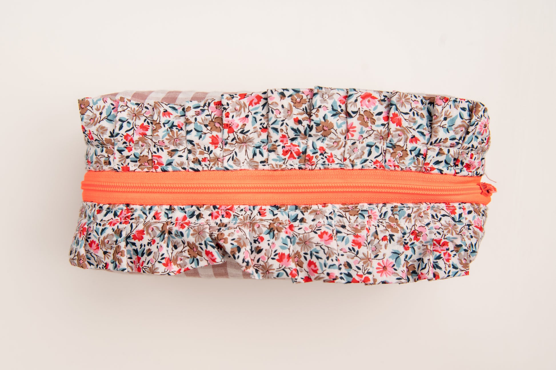 Dulce por fuera y atrevido por dentro. Este estuche en vichy rosa con cremallera naranja neón es perfecto para quienes adoran los contrastes llenos de vida. Su volante floral le da un toque romántico que lo hace aún más especial. Ideal para alegrar cualquier bolso o escritorio.