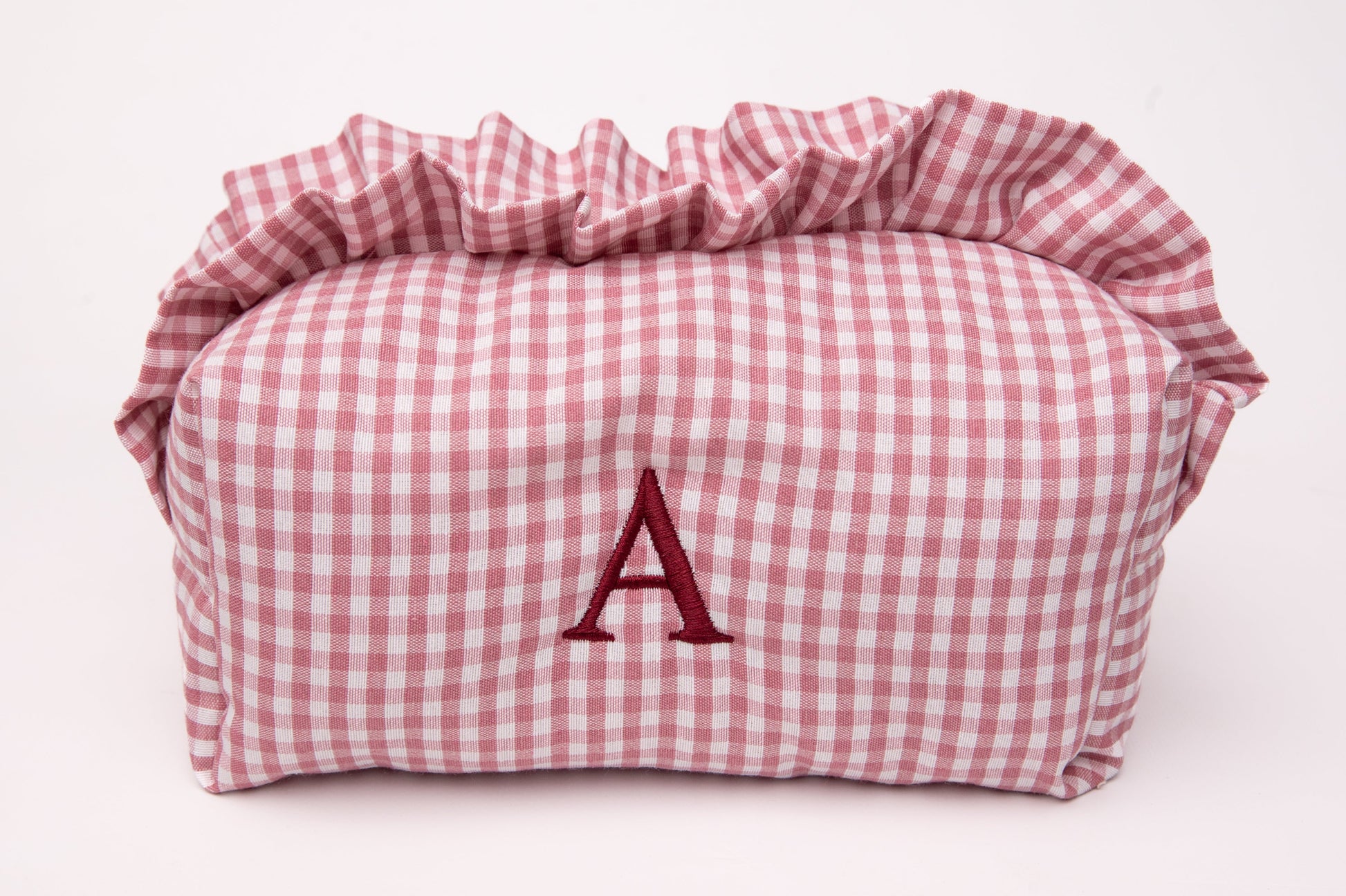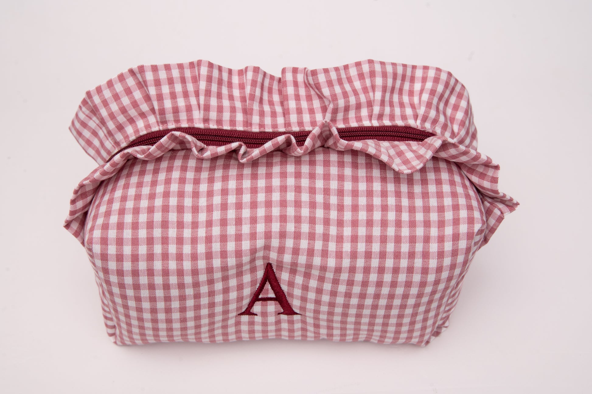 Este neceser de tamaño mediano es el accesorio ideal para llevar tus esenciales de belleza y viaje con estilo. Su diseño encantador combina un exterior de vichy en tonos rosa, con un toque sofisticado y atemporal. Los volantes decorativos añaden un aire romántico y femenino, convirtiéndolo en un complemento especial.