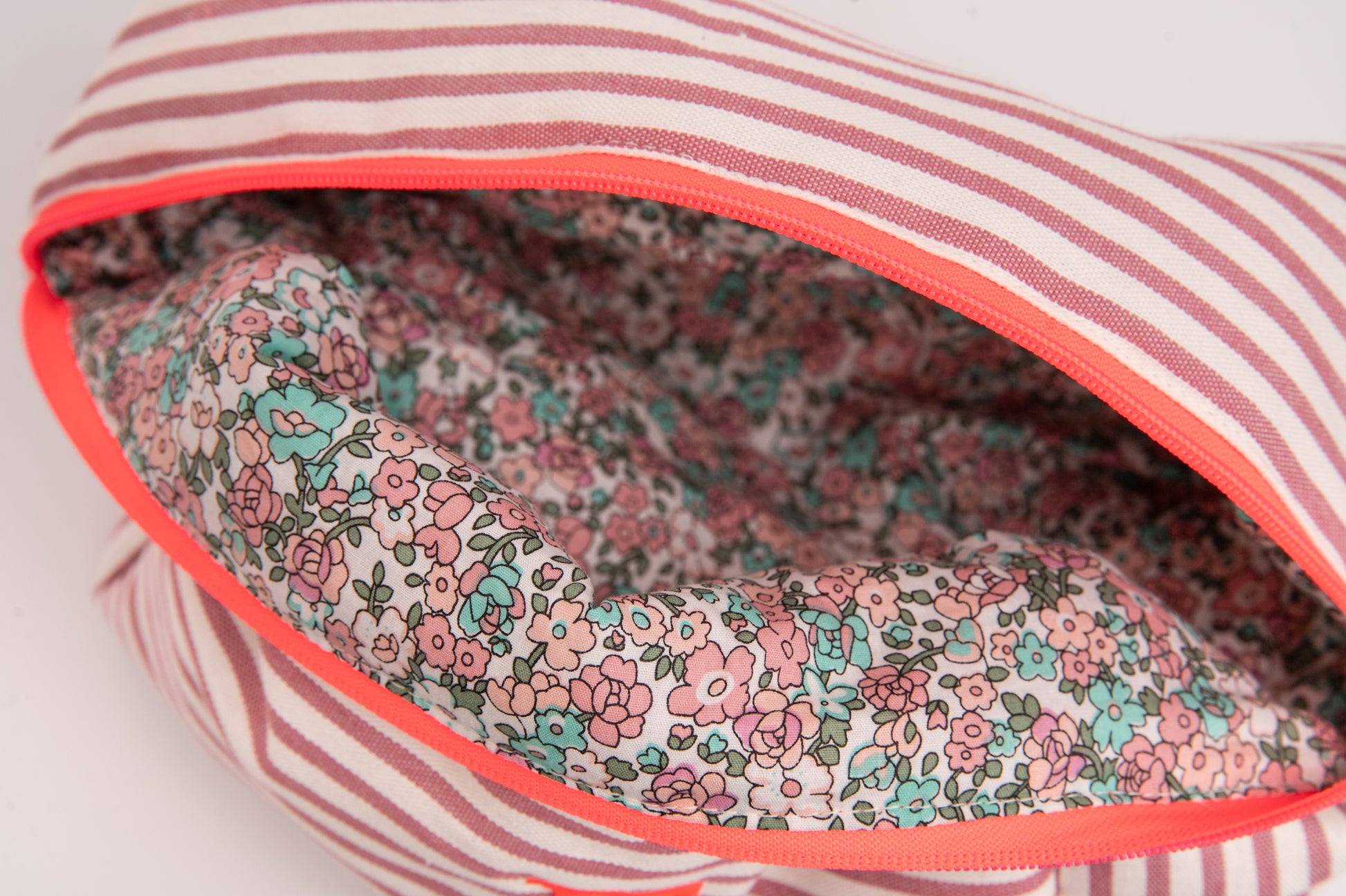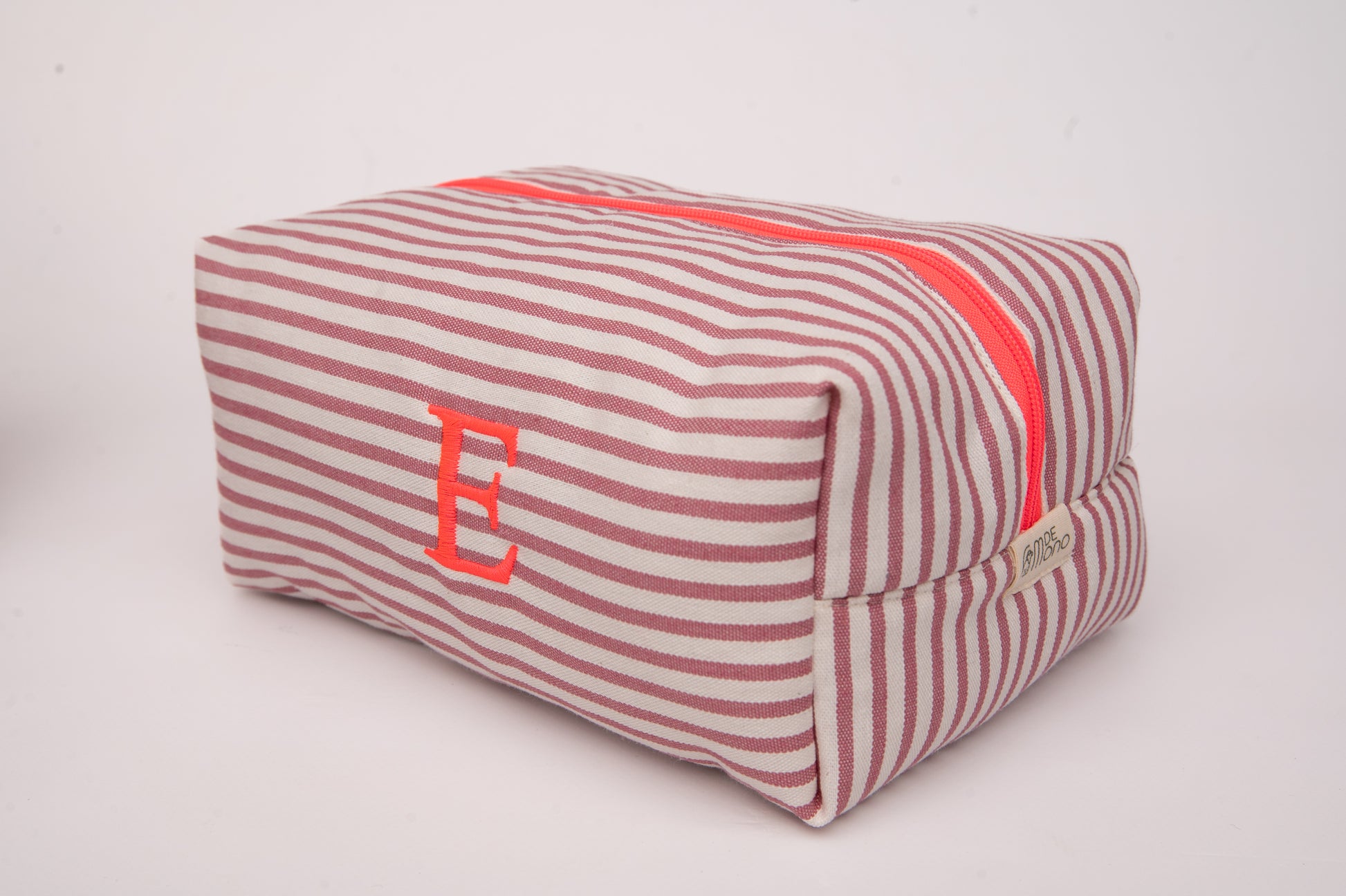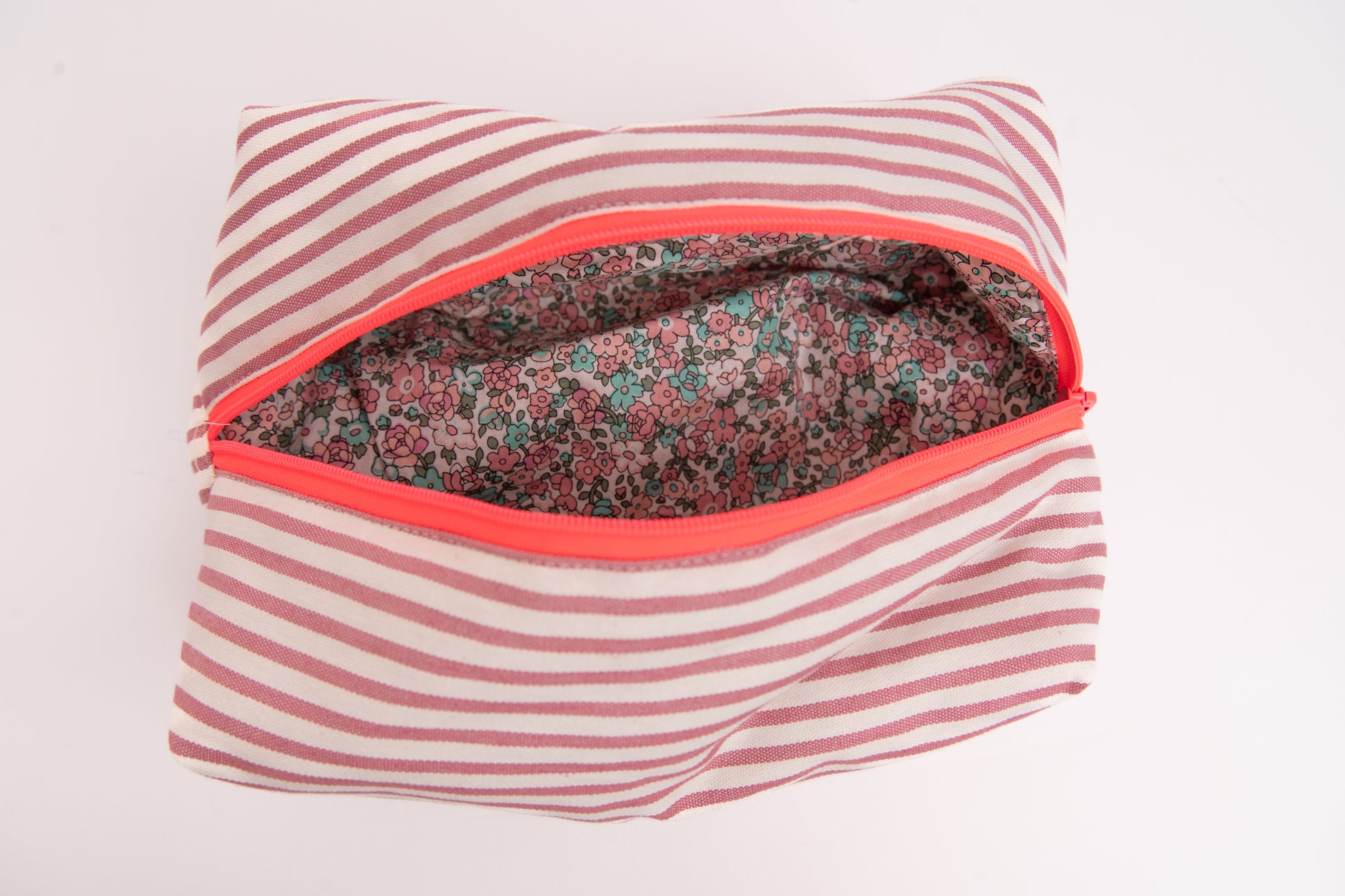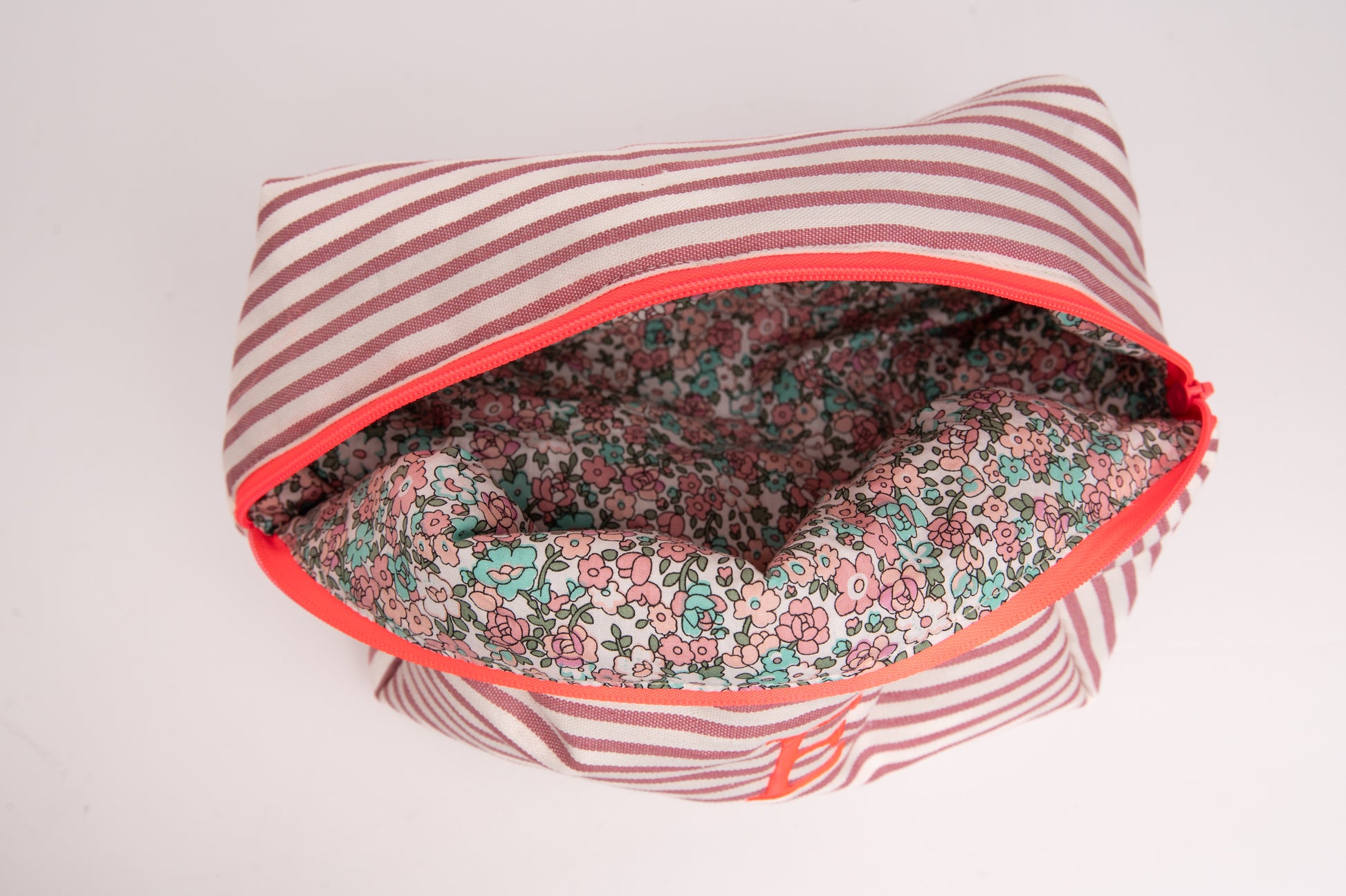 Este neceser de tamaño mediano es el accesorio ideal para llevar tus esenciales de belleza y viaje con estilo. Su diseño encantador combina un exterior de algodón con estampado de rayas en tonos rosa y crudo.
