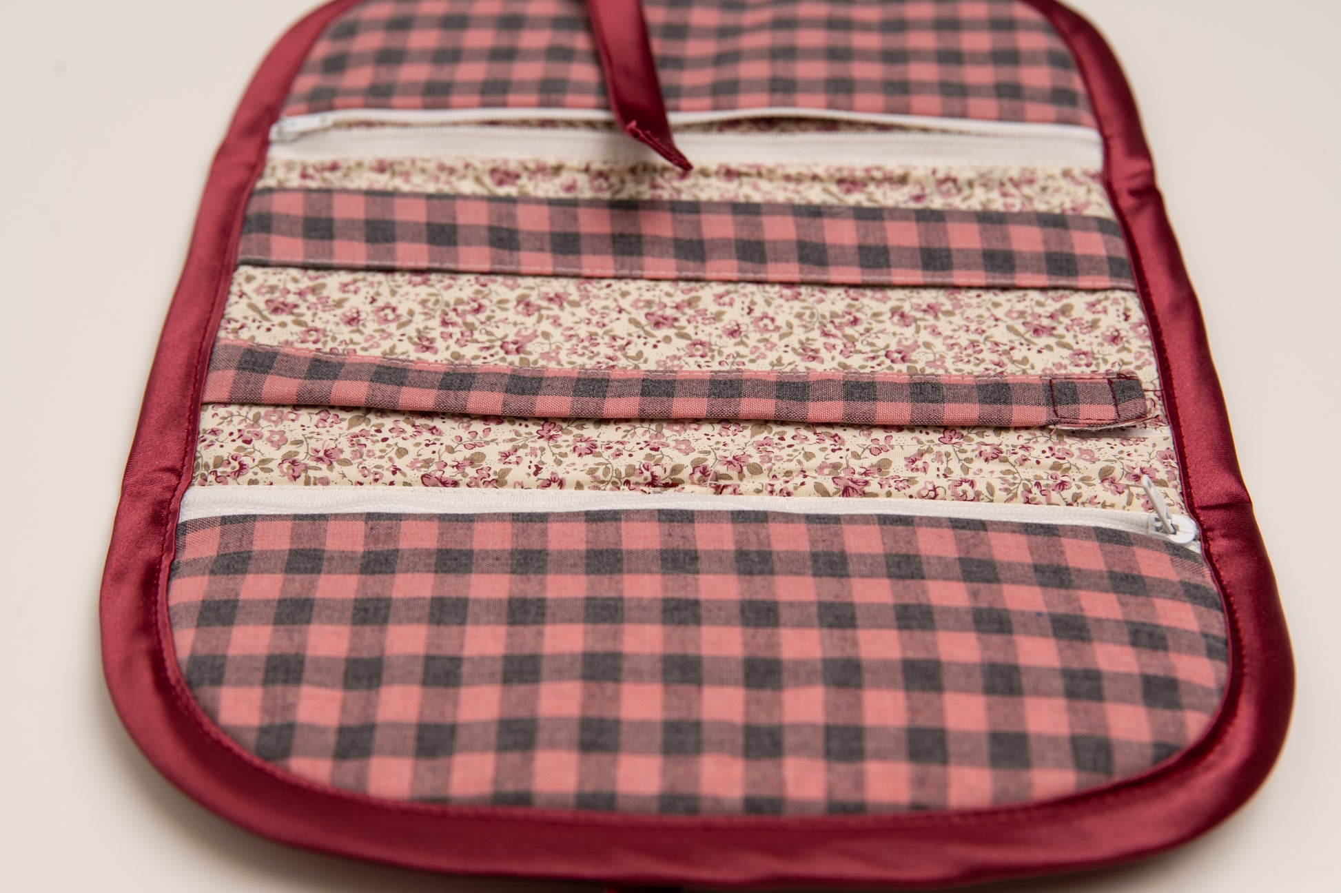 Una mezcla cálida y acogedora. El estampado vichy en tonos rosewood (un rosa-marrón sutil) junto al ribete burdeos crean una pieza con aire vintage y lleno de estilo. Perfecto para quienes aman los tonos tierra y los complementos con esencia artesanal.
