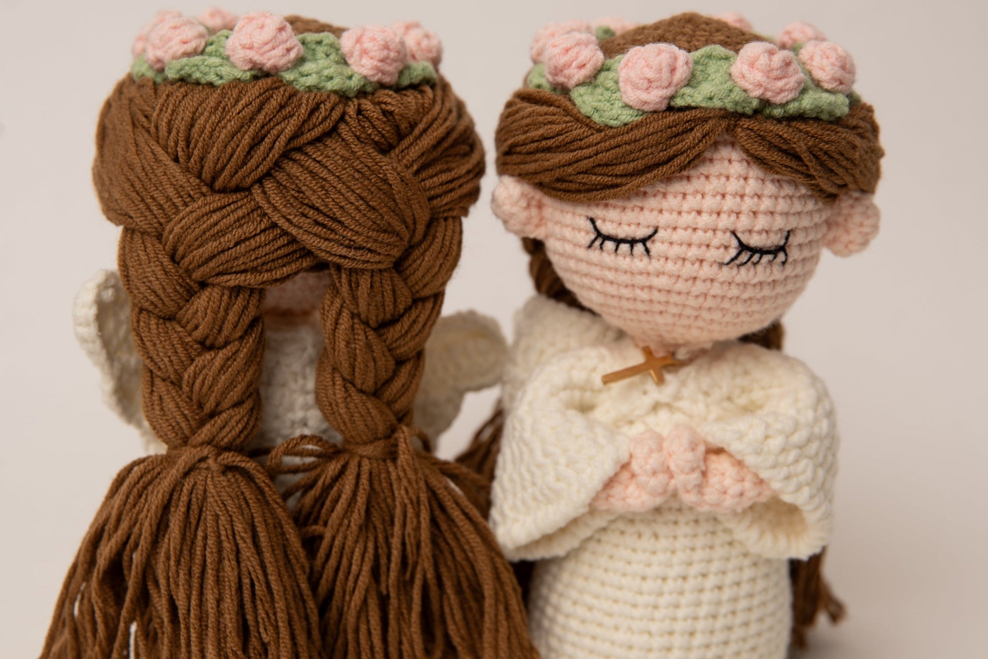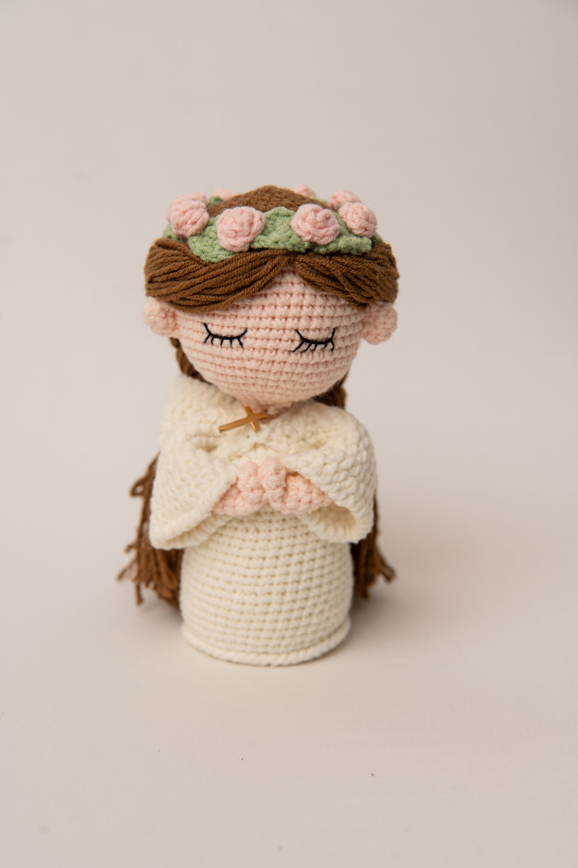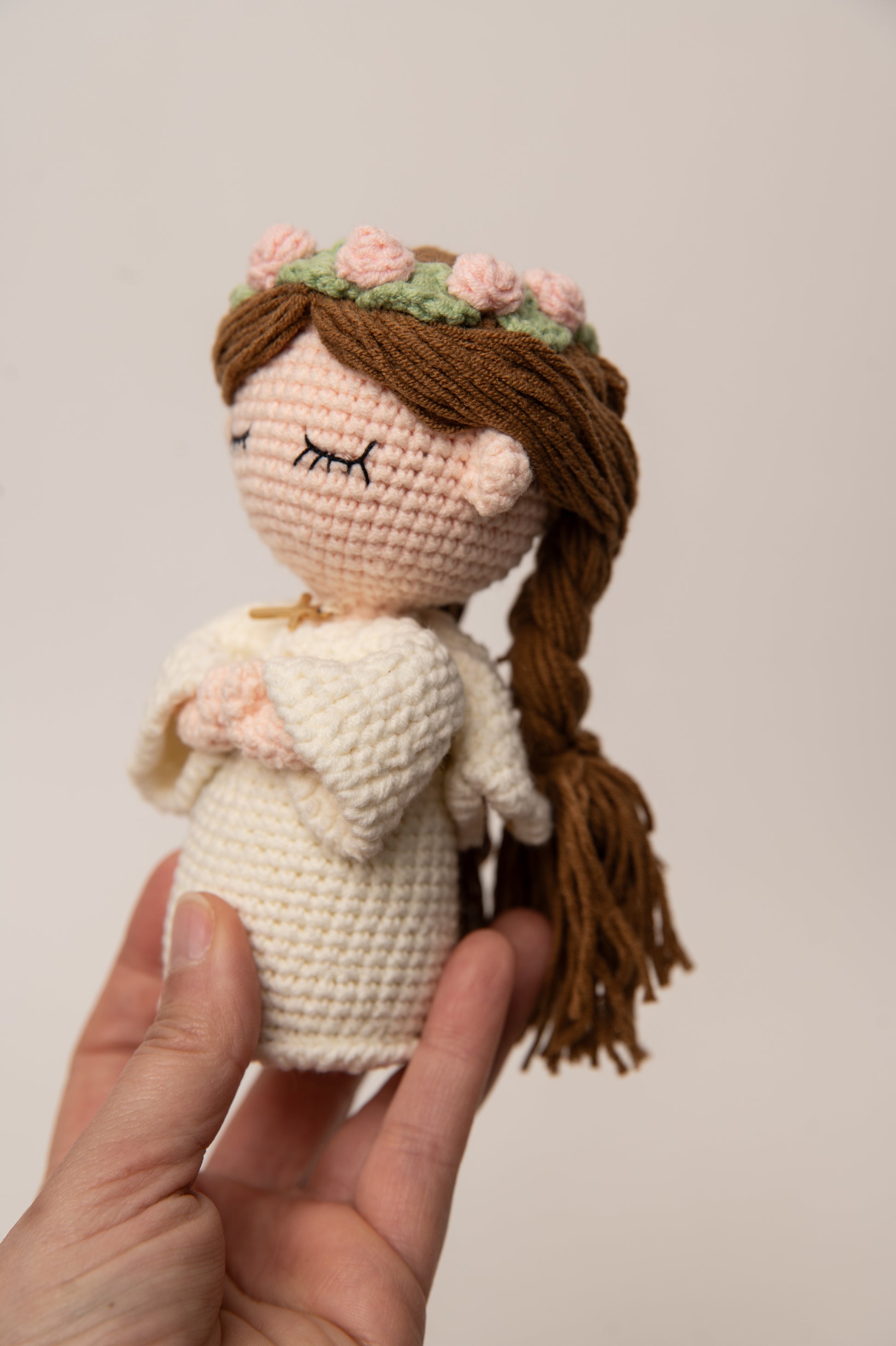 Esta muñeca de comunión es una pieza única, tejida a mano con mimo y mucha dedicación. Lleva un vestido de ganchillo en tono marfil, una delicada corona de flores tejidas y un pequeño crucifijo dorado que la hace aún más especial.