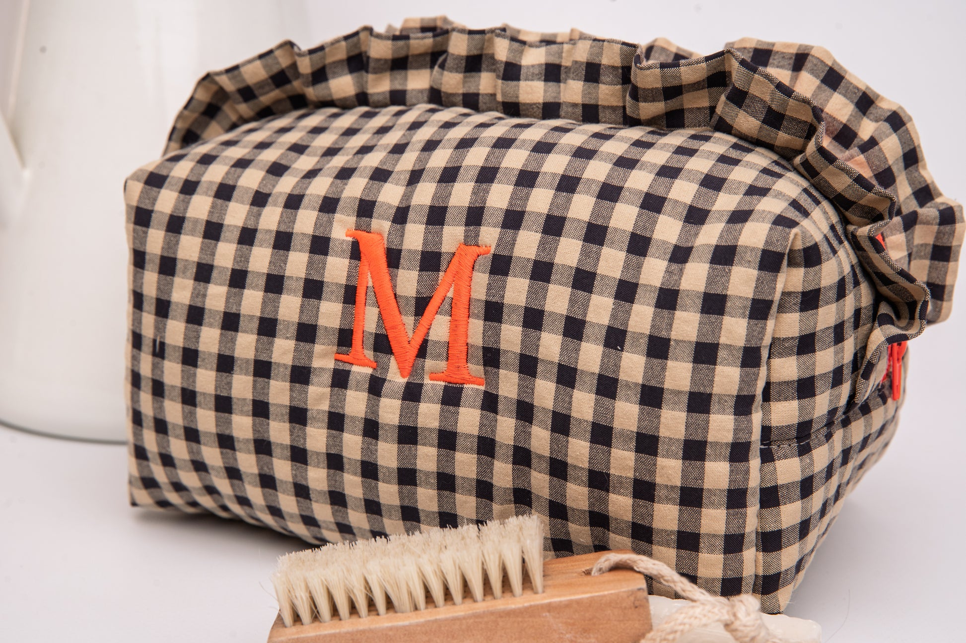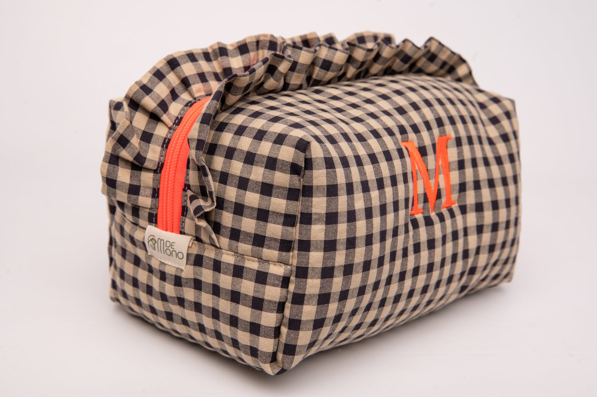 Personalizable con una inicial bordada en hilo naranja neón, a juego con la cremallera, para un acabado exclusivo.