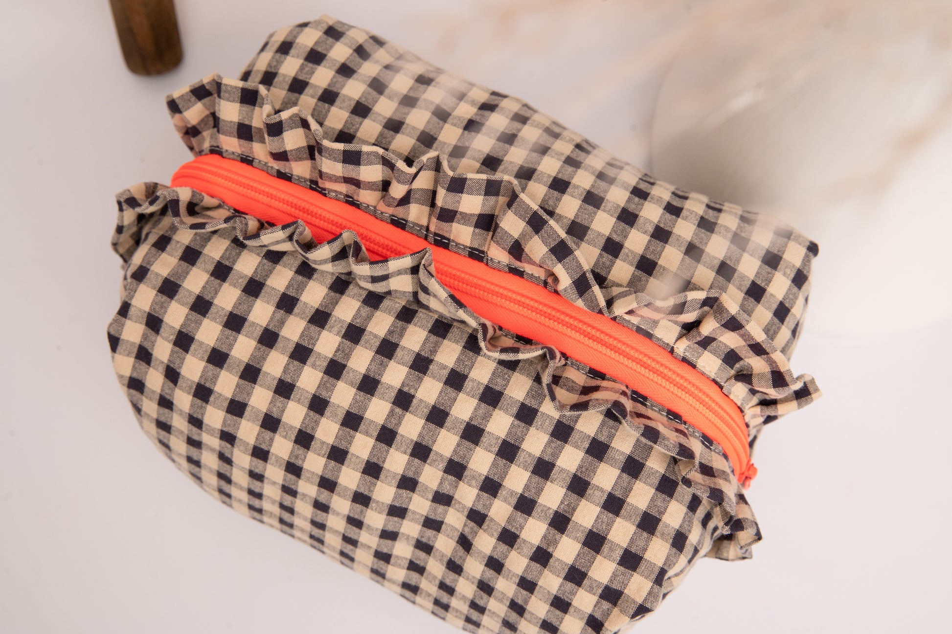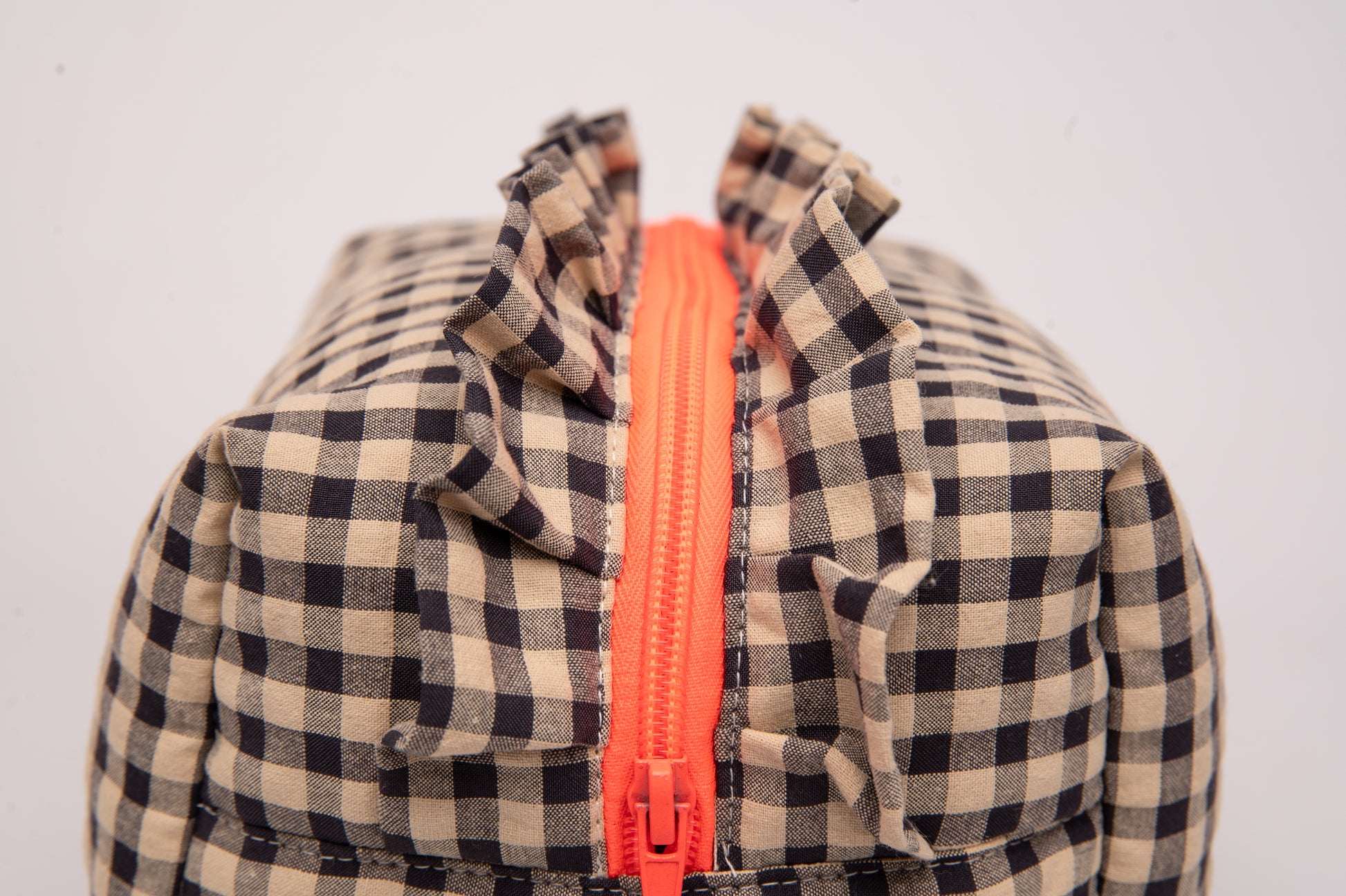 Este neceser de tamaño mediano es el accesorio ideal para llevar tus esenciales de belleza y viaje con estilo. Su diseño encantador combina un exterior de vichy seersucker en tonos heat, con un toque sofisticado y atemporal. Los volantes decorativos aportan un aire romántico y femenino, haciendo de este neceser una pieza única.