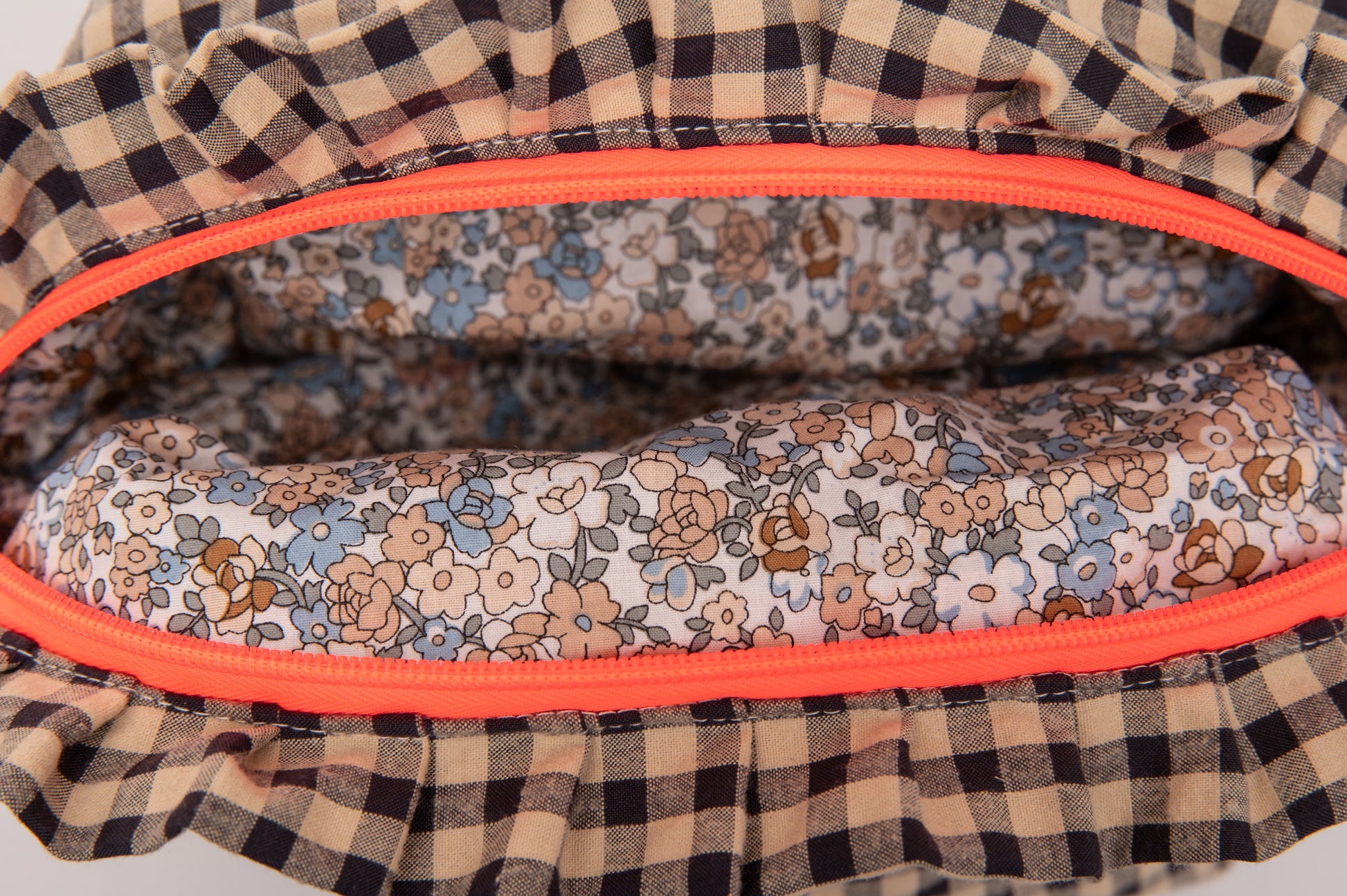 Interior acolchado con estampado floral, que protege el contenido y aporta un acabado delicado.