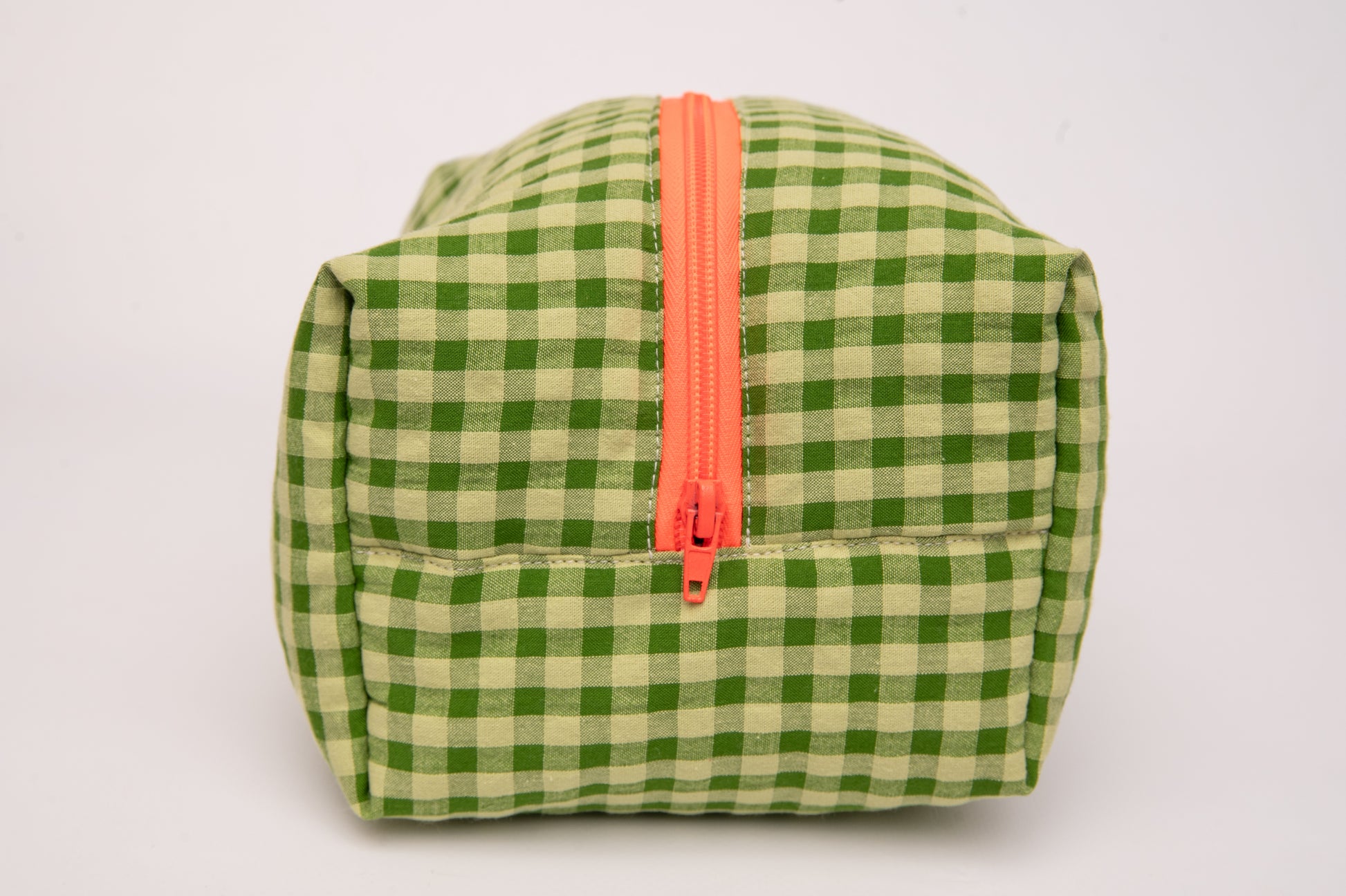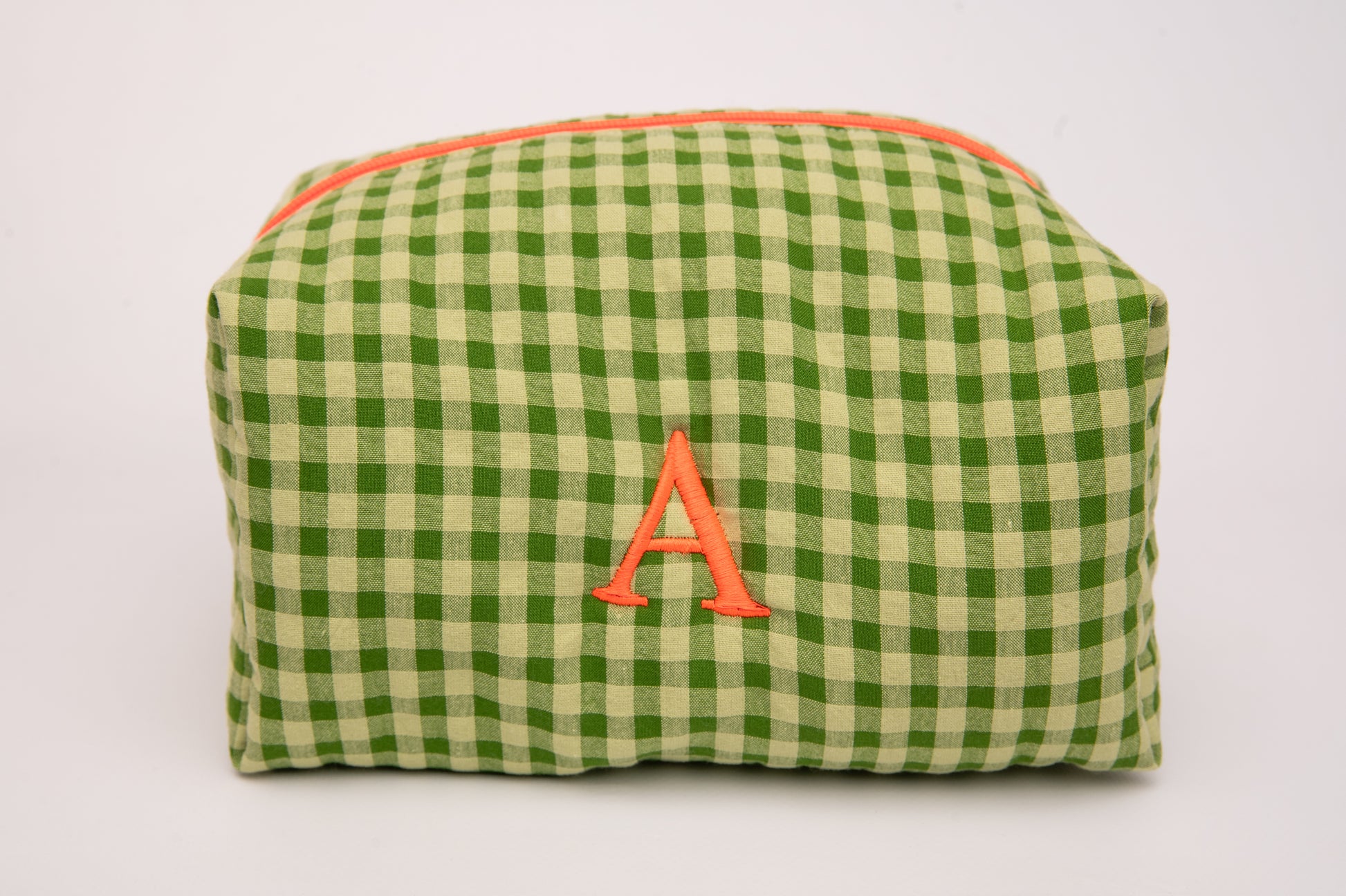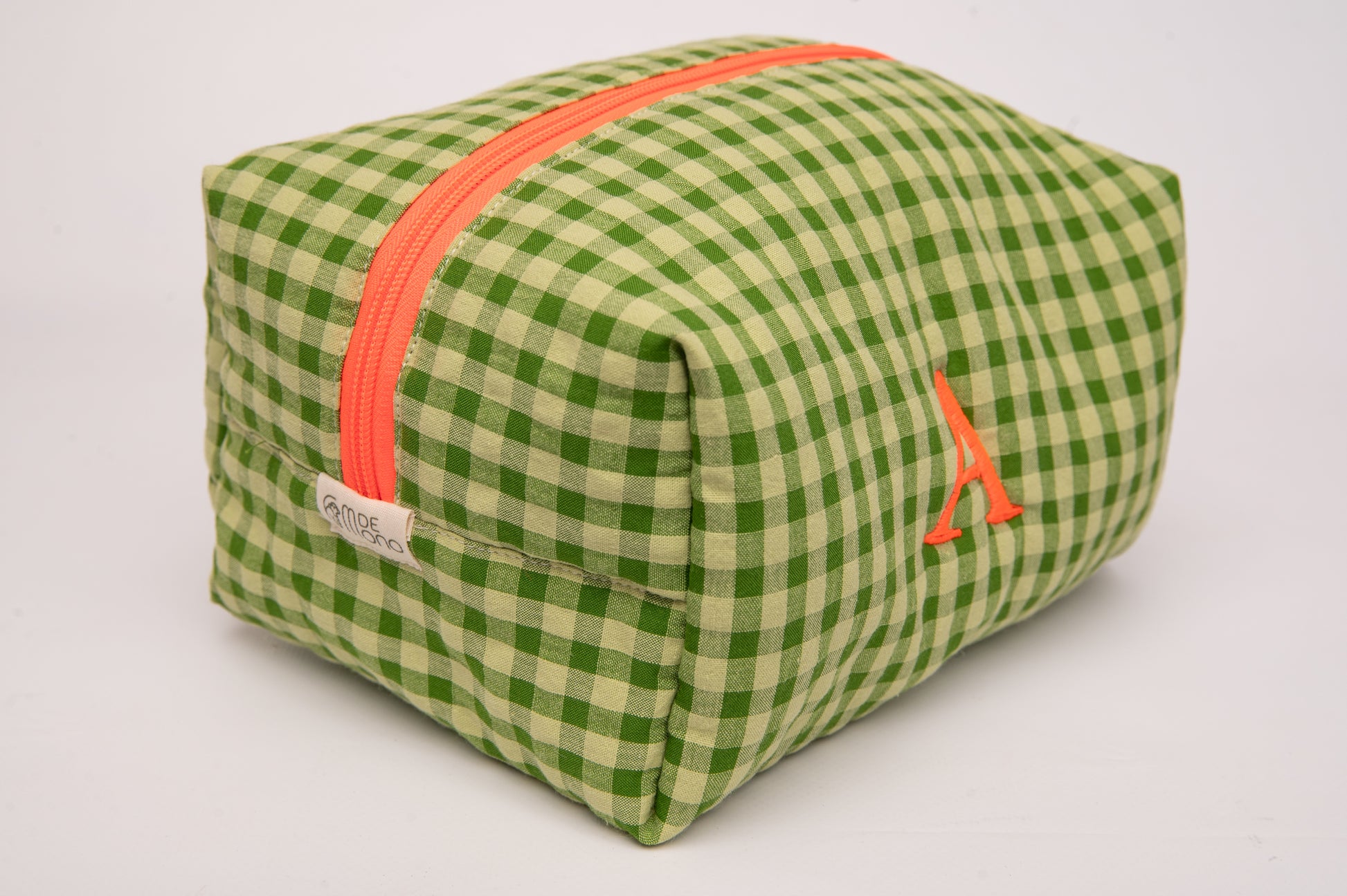 Este neceser de tamaño mediano es el accesorio ideal para llevar tus esenciales de belleza y viaje con estilo. Su diseño encantador combina un exterior de vichy seersucker color matcha green, con un toque fresco y vibrante. Su estética sencilla y versátil lo convierte en un complemento imprescindible para el día a día.