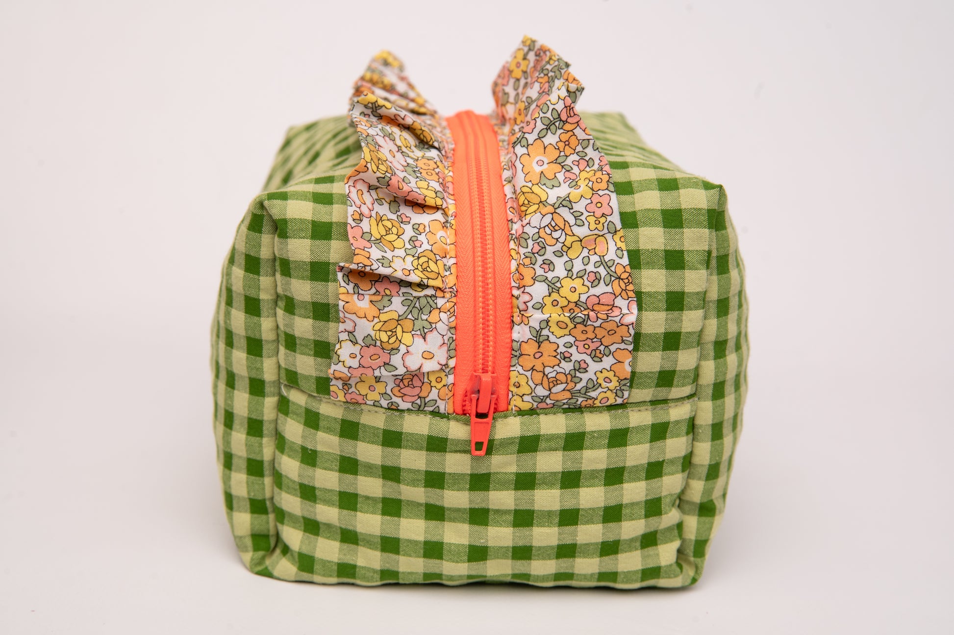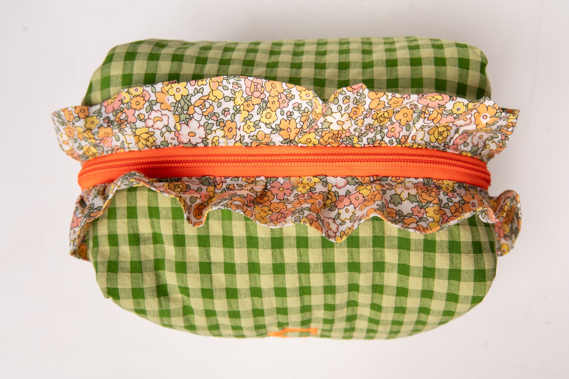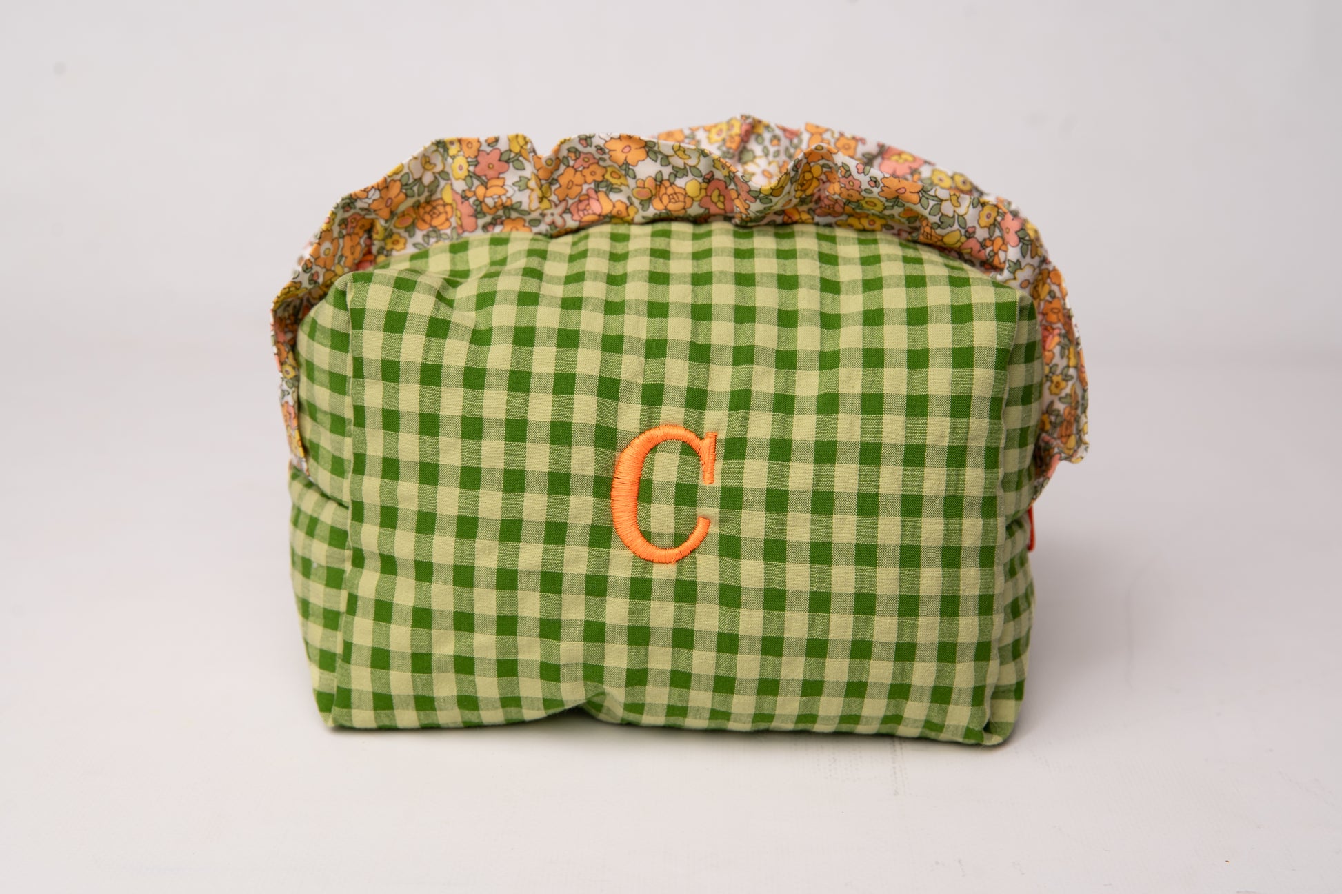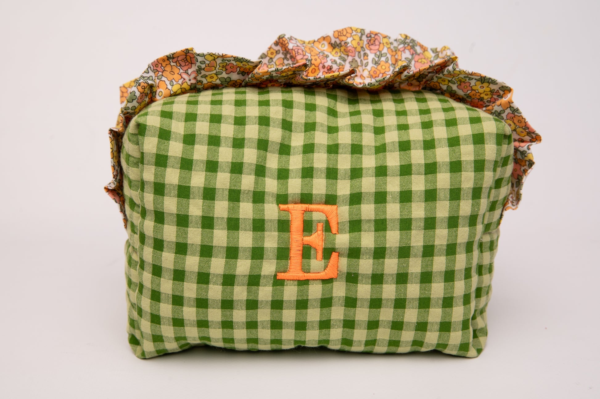 Este neceser de tamaño mediano es el accesorio ideal para llevar tus esenciales de belleza y viaje con estilo. Su diseño encantador combina un exterior de vichy seersucker en matcha green, con un toque fresco y vibrante. Los volantes estampados añaden un contraste dinámico y femenino, convirtiéndolo en un complemento especial y único.