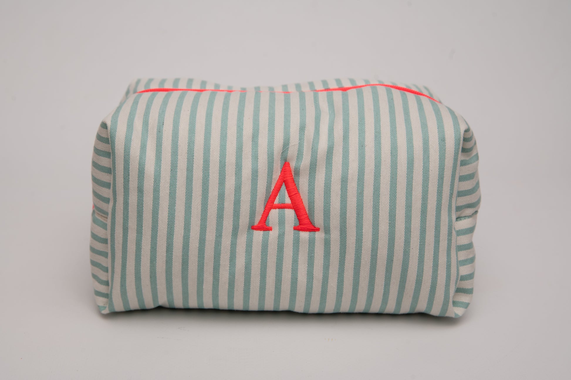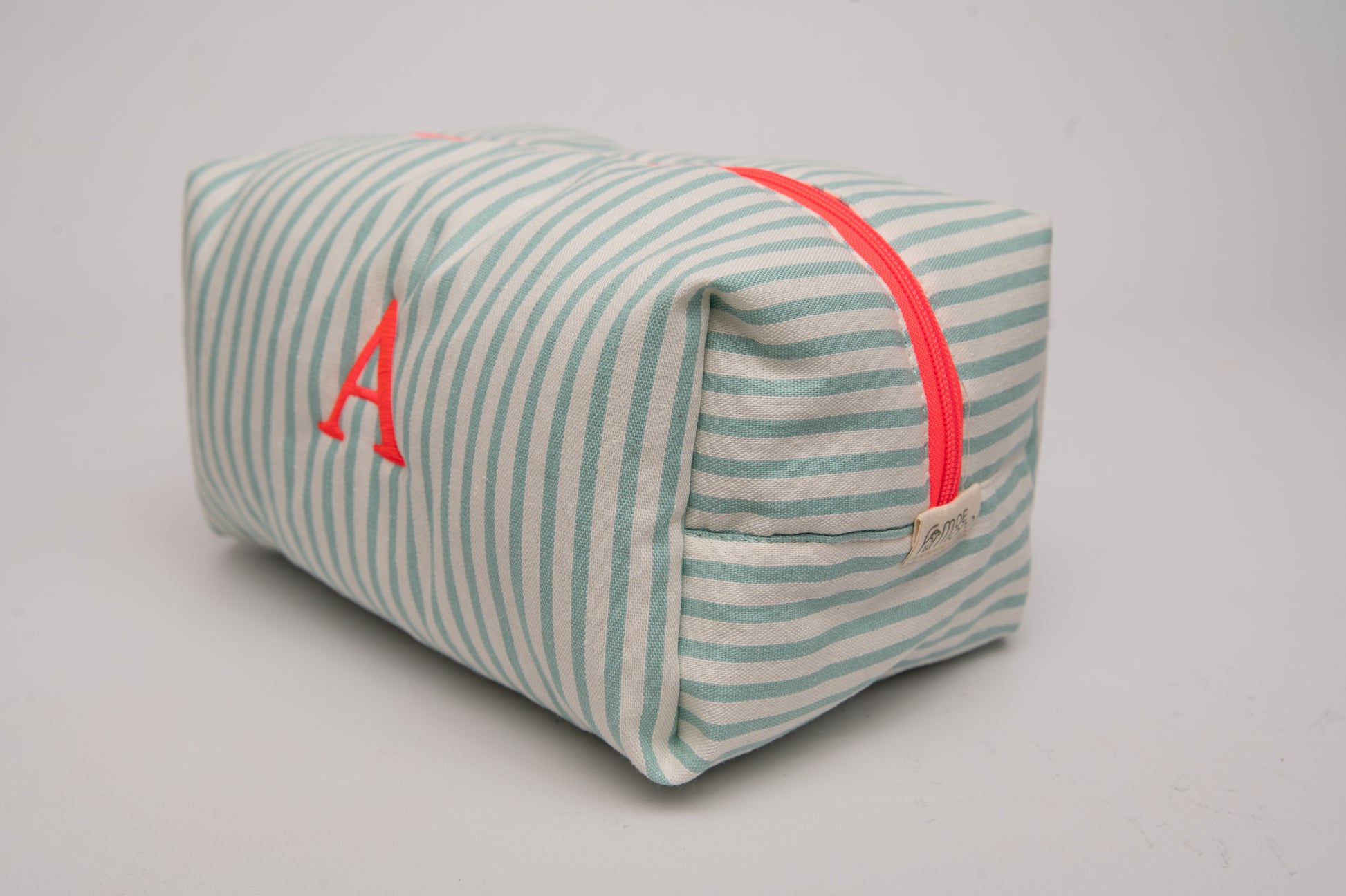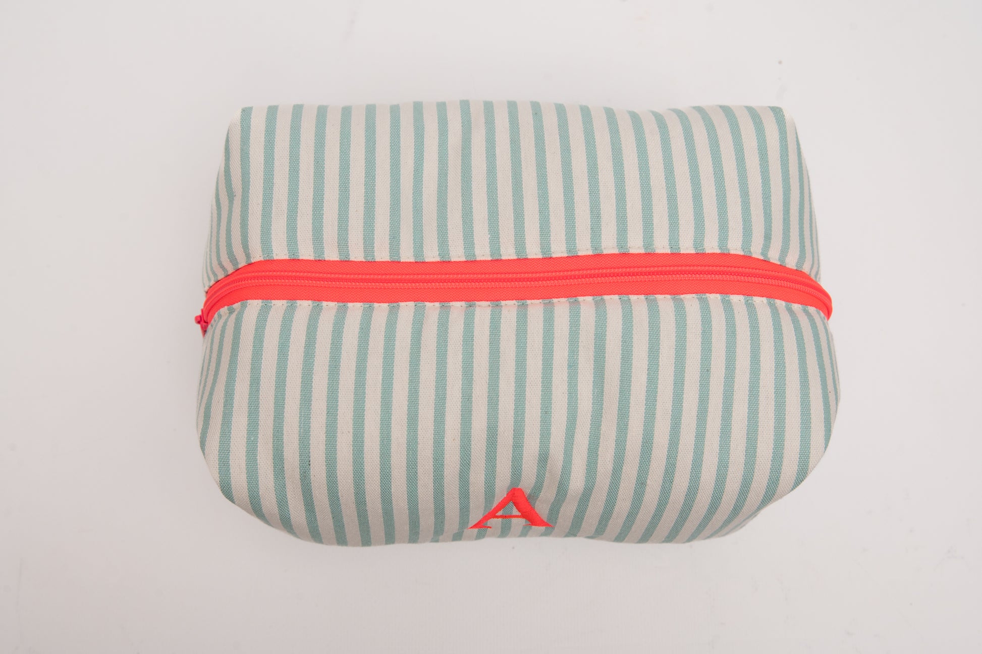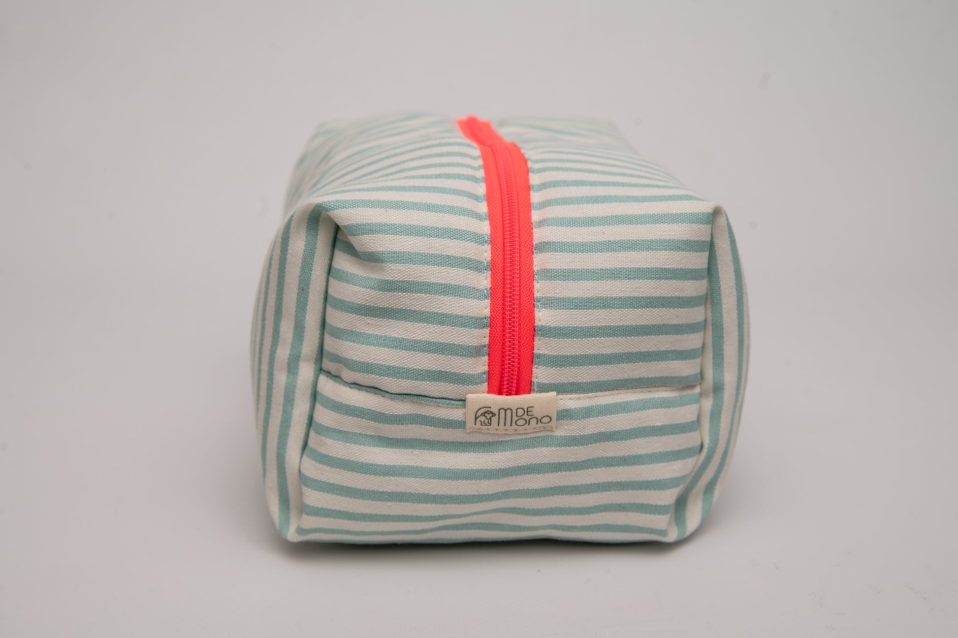 Este neceser de tamaño mediano es el accesorio ideal para llevar tus esenciales de belleza y viaje con estilo. Su diseño encantador combina un exterior de algodón con estampado de rayas en tonos turquesa y crudo.