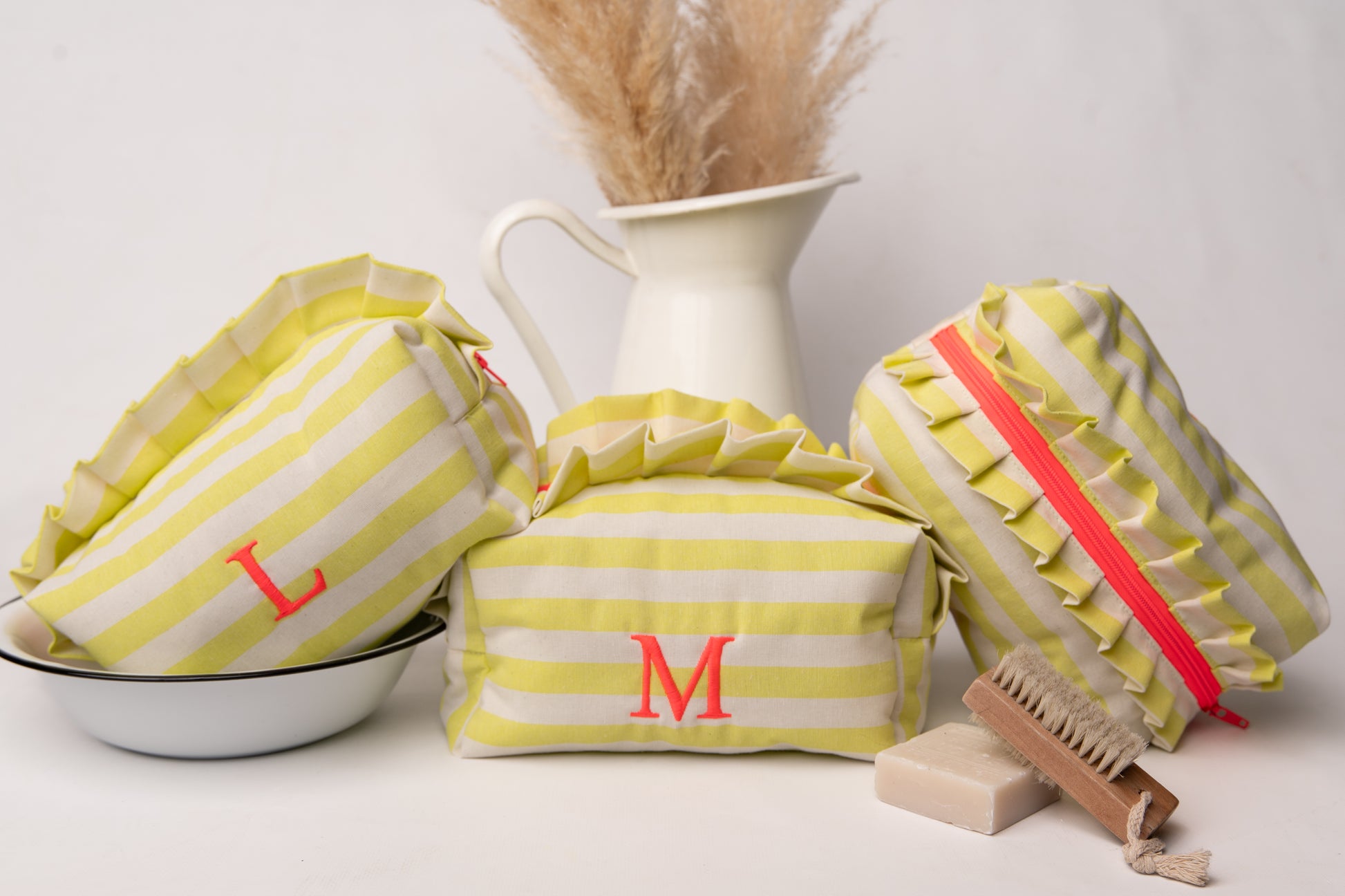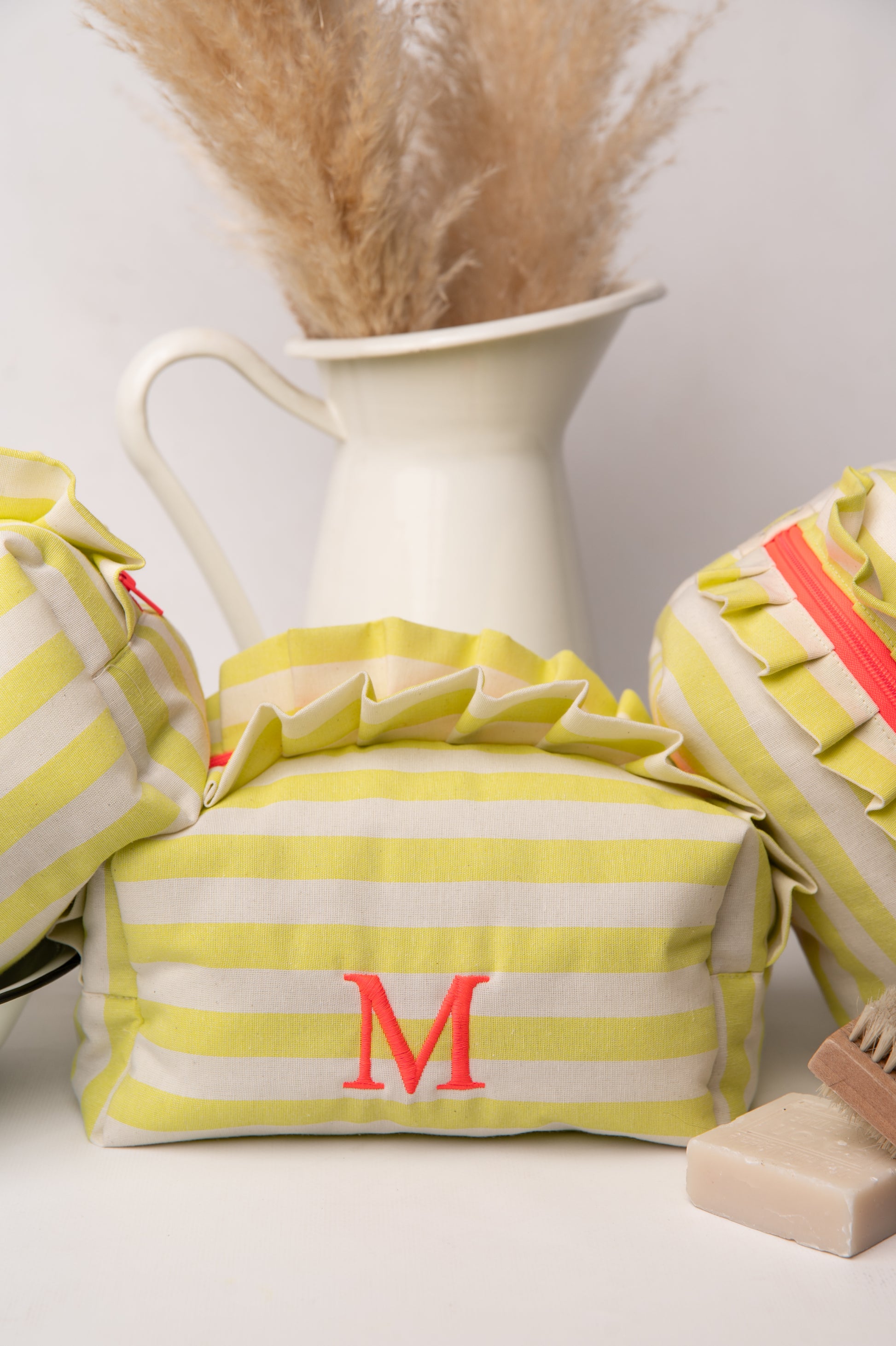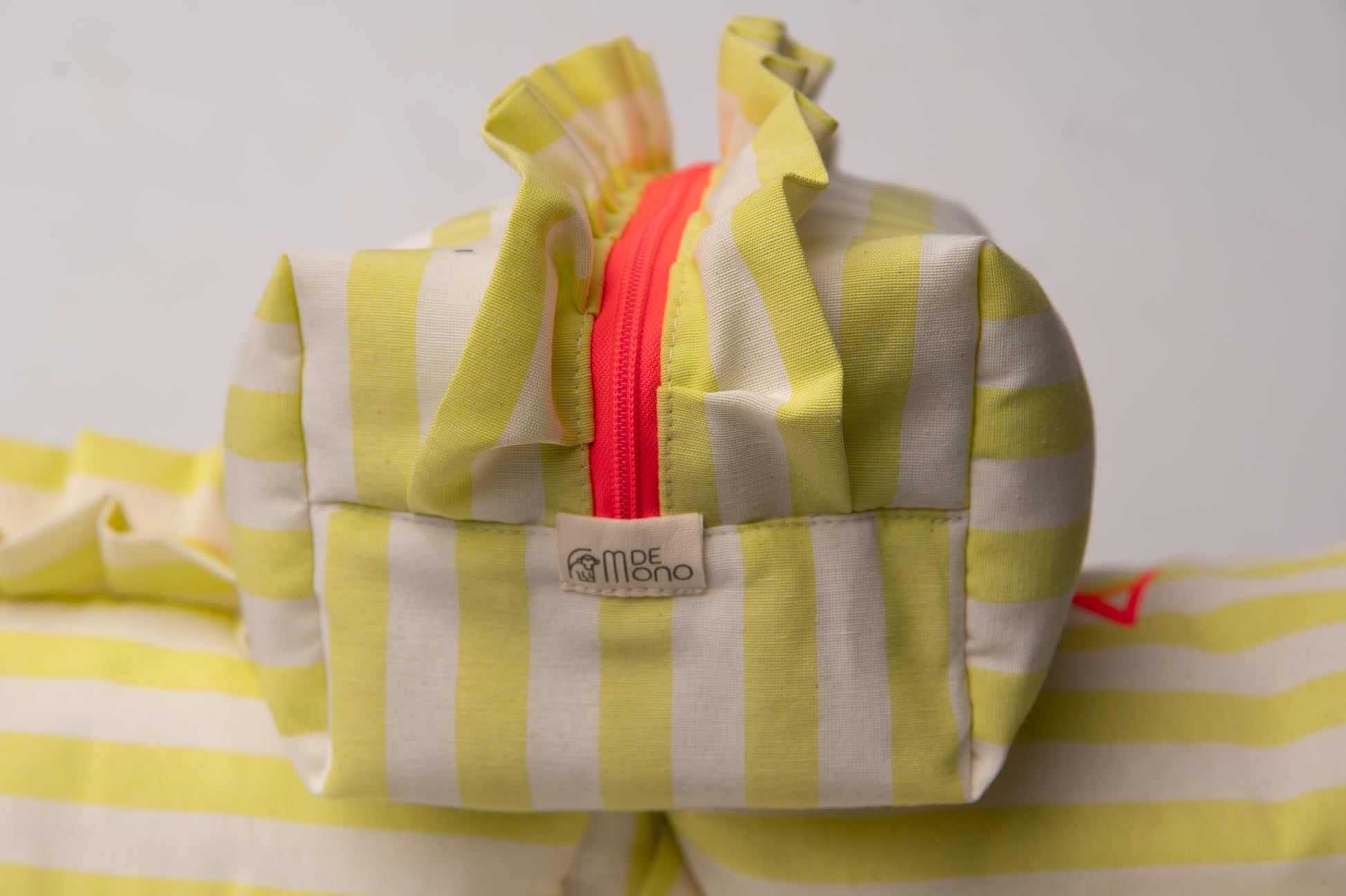 Este neceser de tamaño mediano es el accesorio ideal para llevar tus esenciales de belleza y viaje con estilo. Su diseño fresco y luminoso combina un exterior de rayas anchas blancas y amarillas, aportando un aire vibrante y veraniego. Los volantes decorativos añaden un toque romántico y femenino, convirtiéndolo en un complemento especial.