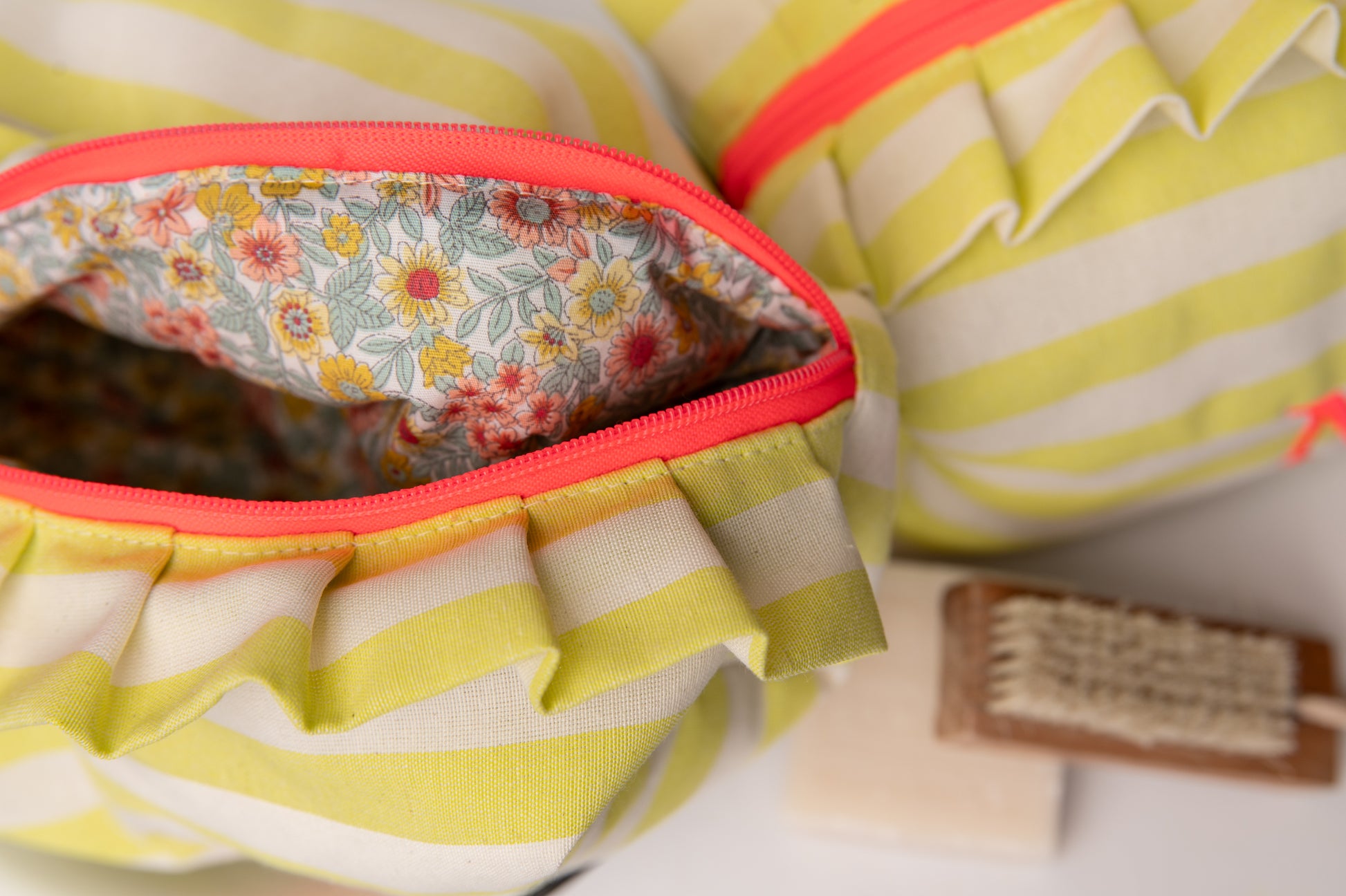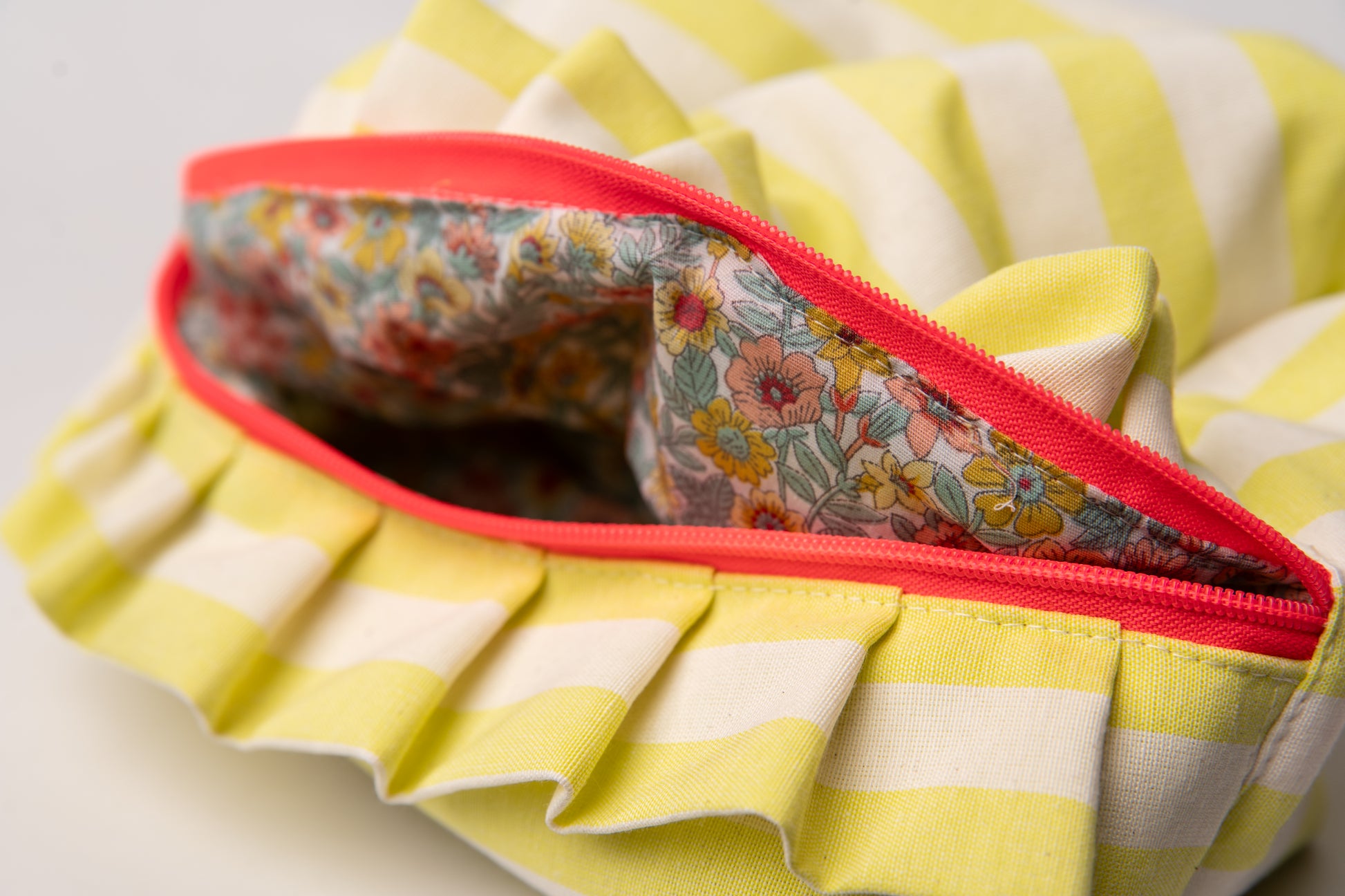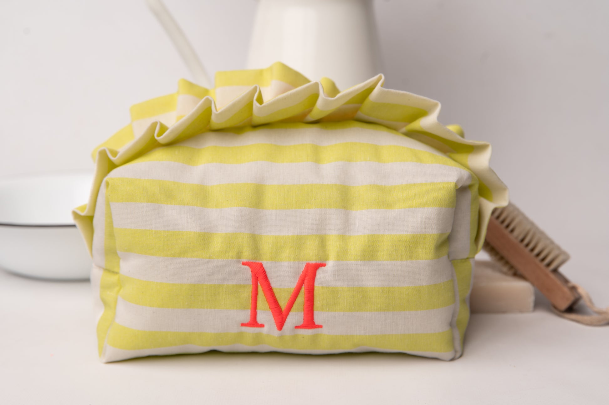 Este neceser de tamaño mediano es el accesorio ideal para llevar tus esenciales de belleza y viaje con estilo. Su diseño fresco y luminoso combina un exterior de rayas anchas blancas y amarillas, aportando un aire vibrante y veraniego. Los volantes decorativos añaden un toque romántico y femenino, convirtiéndolo en un complemento especial.