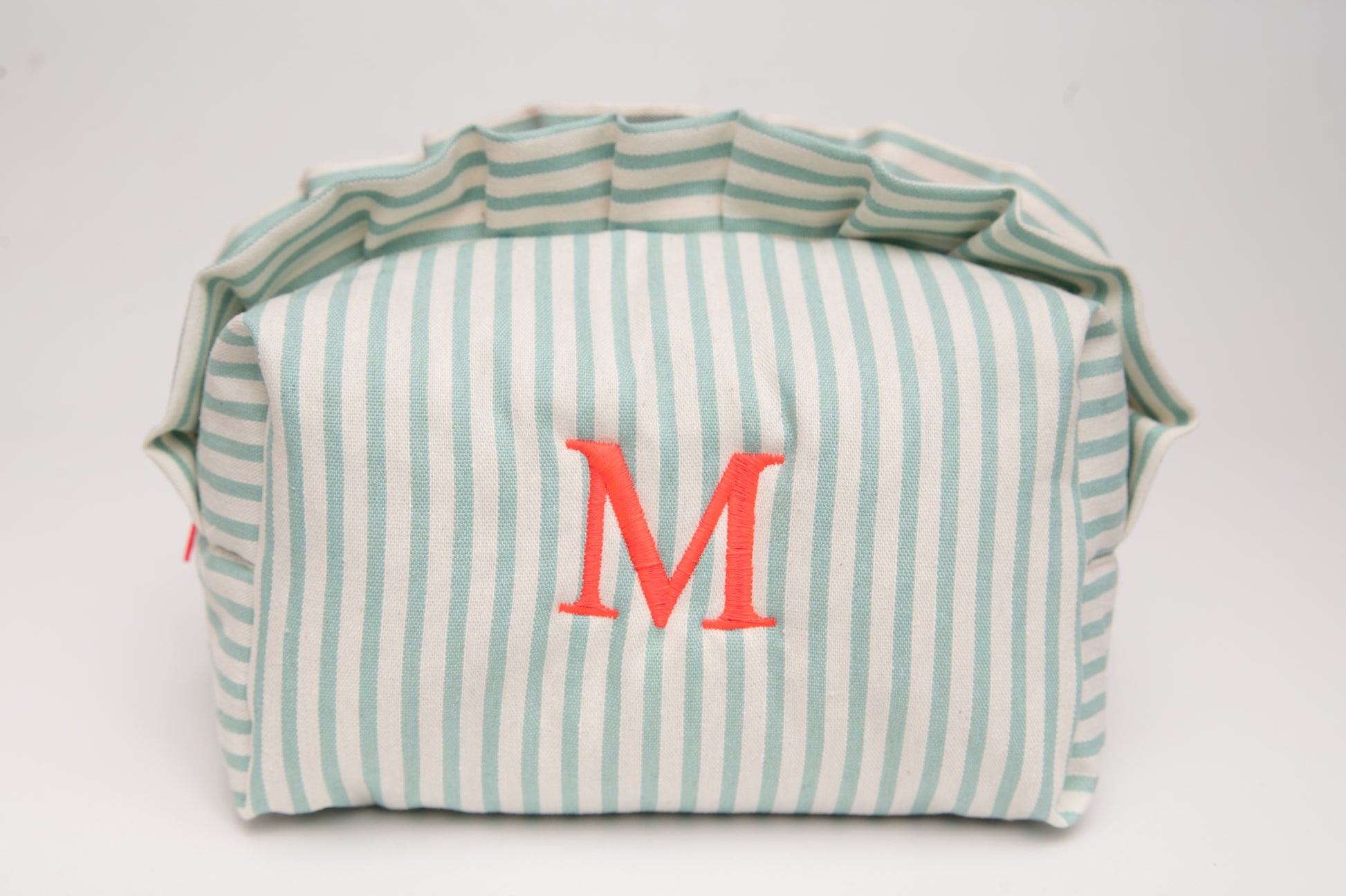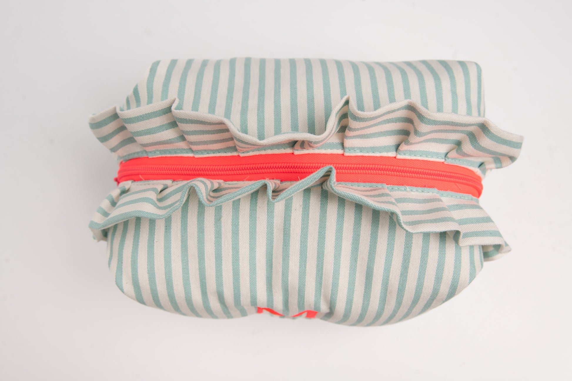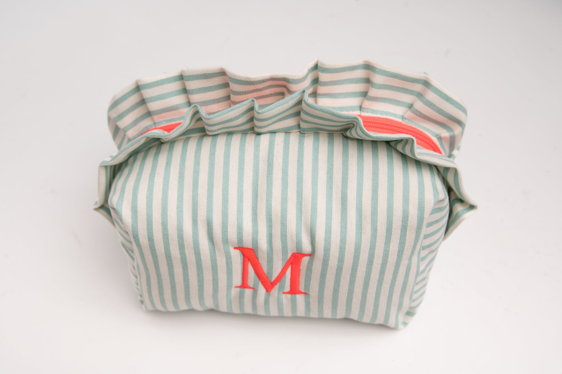 Este neceser de tamaño mediano es el accesorio ideal para llevar tus esenciales de belleza y viaje con estilo. Su diseño encantador combina un exterior de algodón con estampado de rayas en tonos turquesas. Además los volantes le proporciona un toque sofisticado.