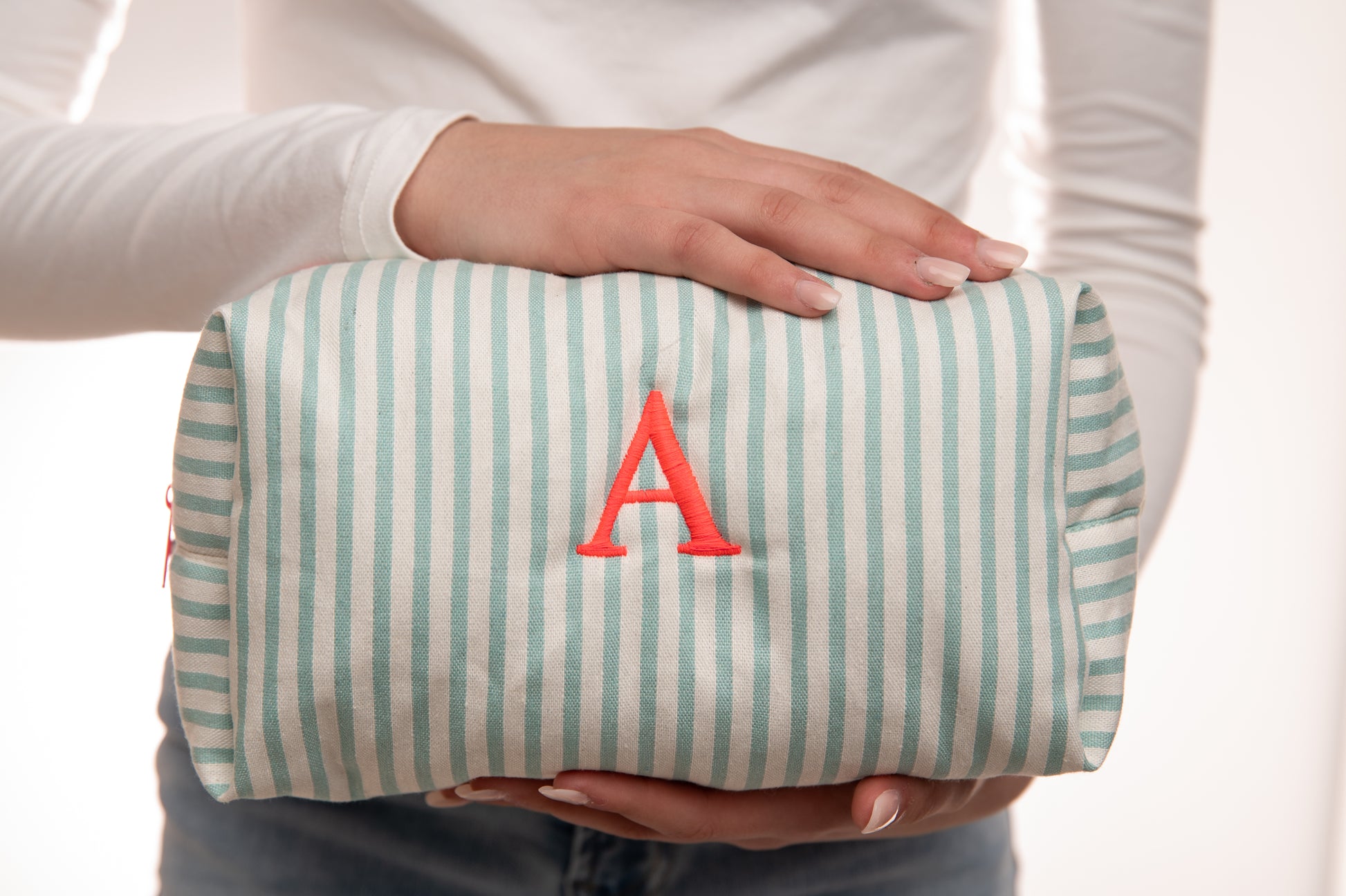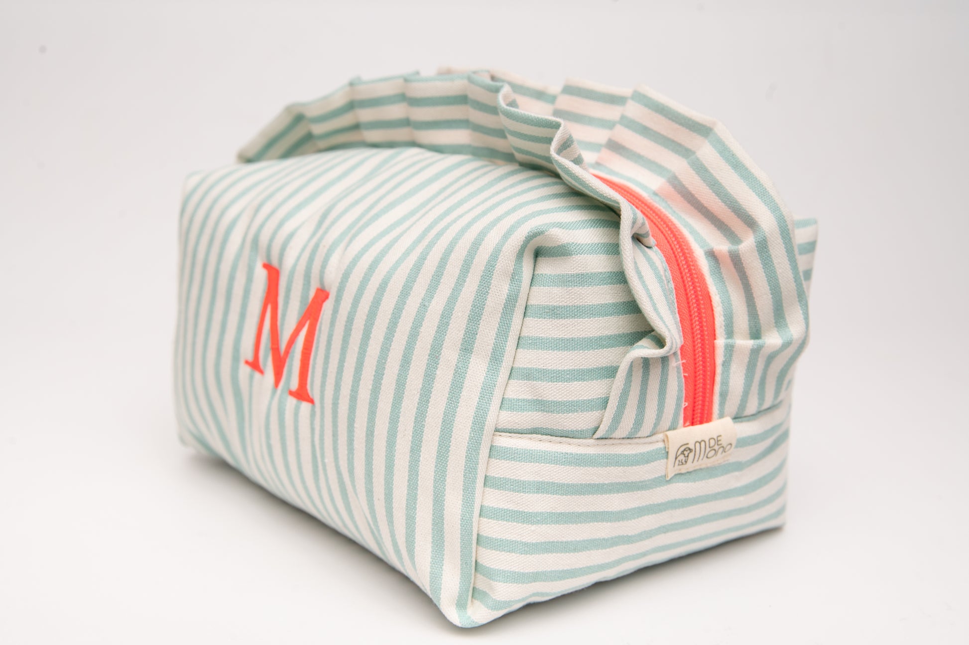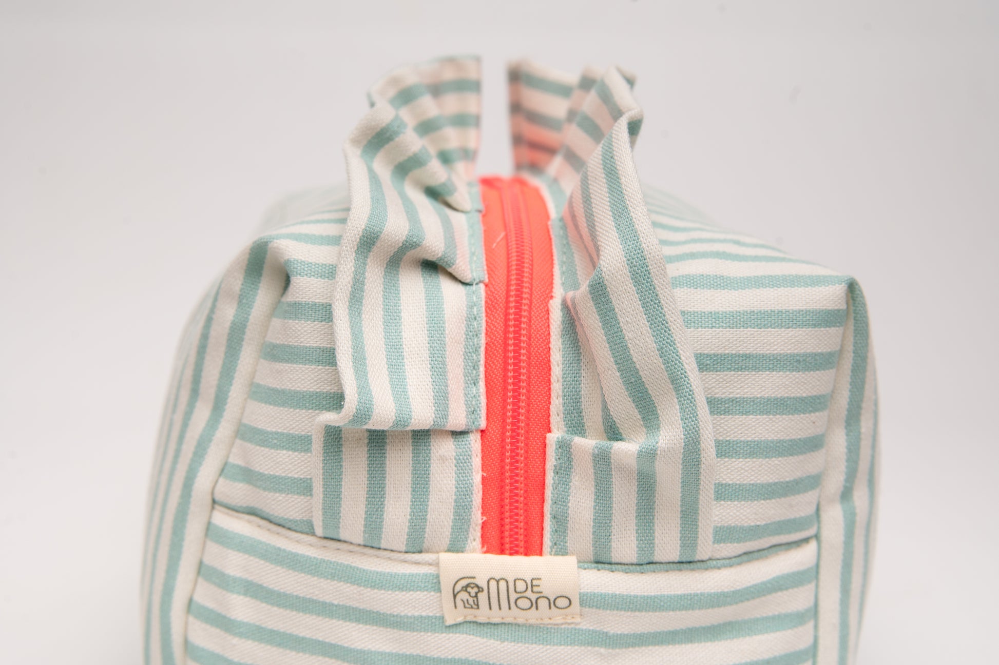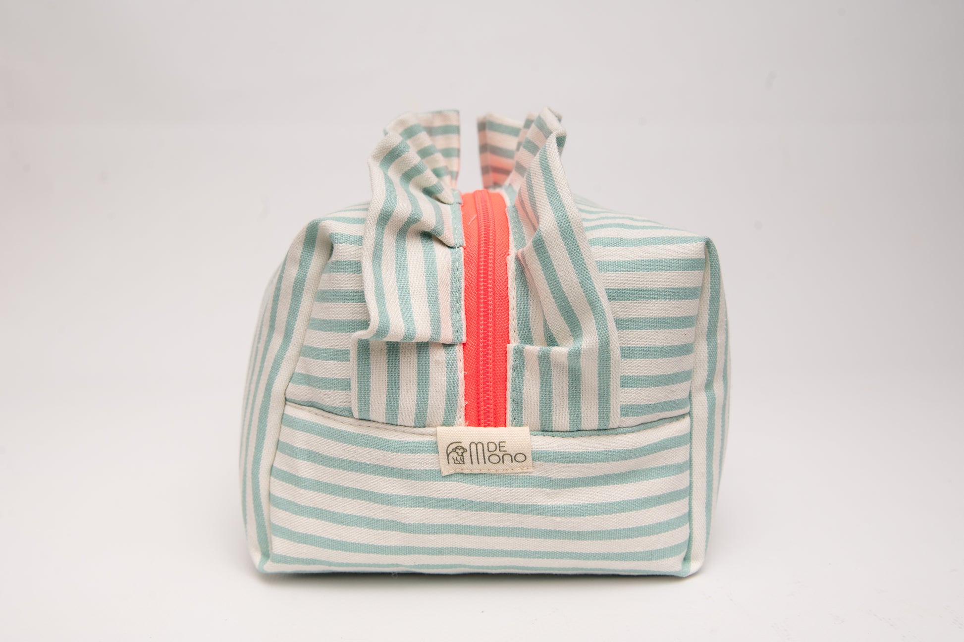Este neceser de tamaño mediano es el accesorio ideal para llevar tus esenciales de belleza y viaje con estilo. Su diseño encantador combina un exterior de algodón con estampado de rayas en tonos turquesas. Además los volantes le proporciona un toque sofisticado.