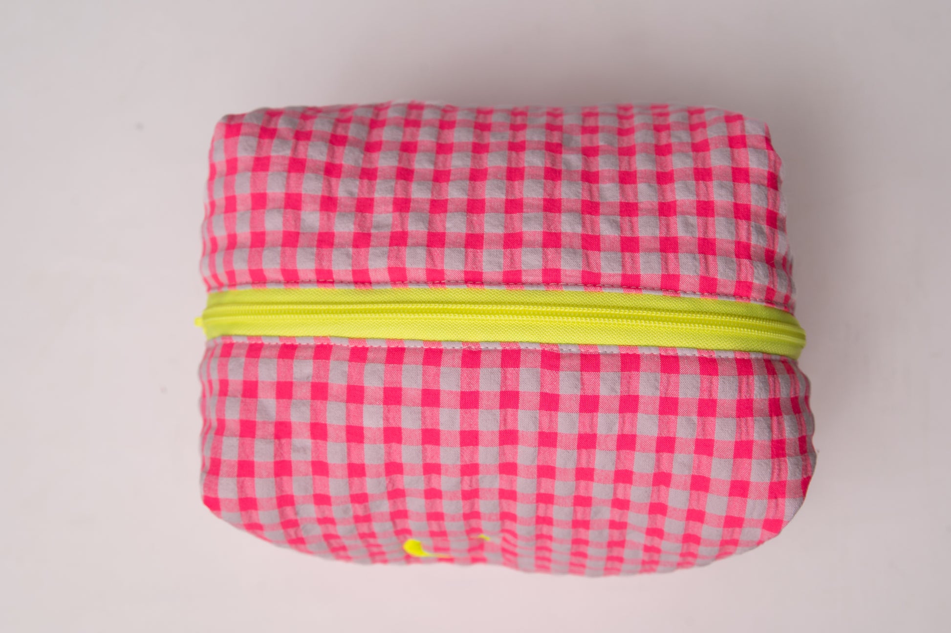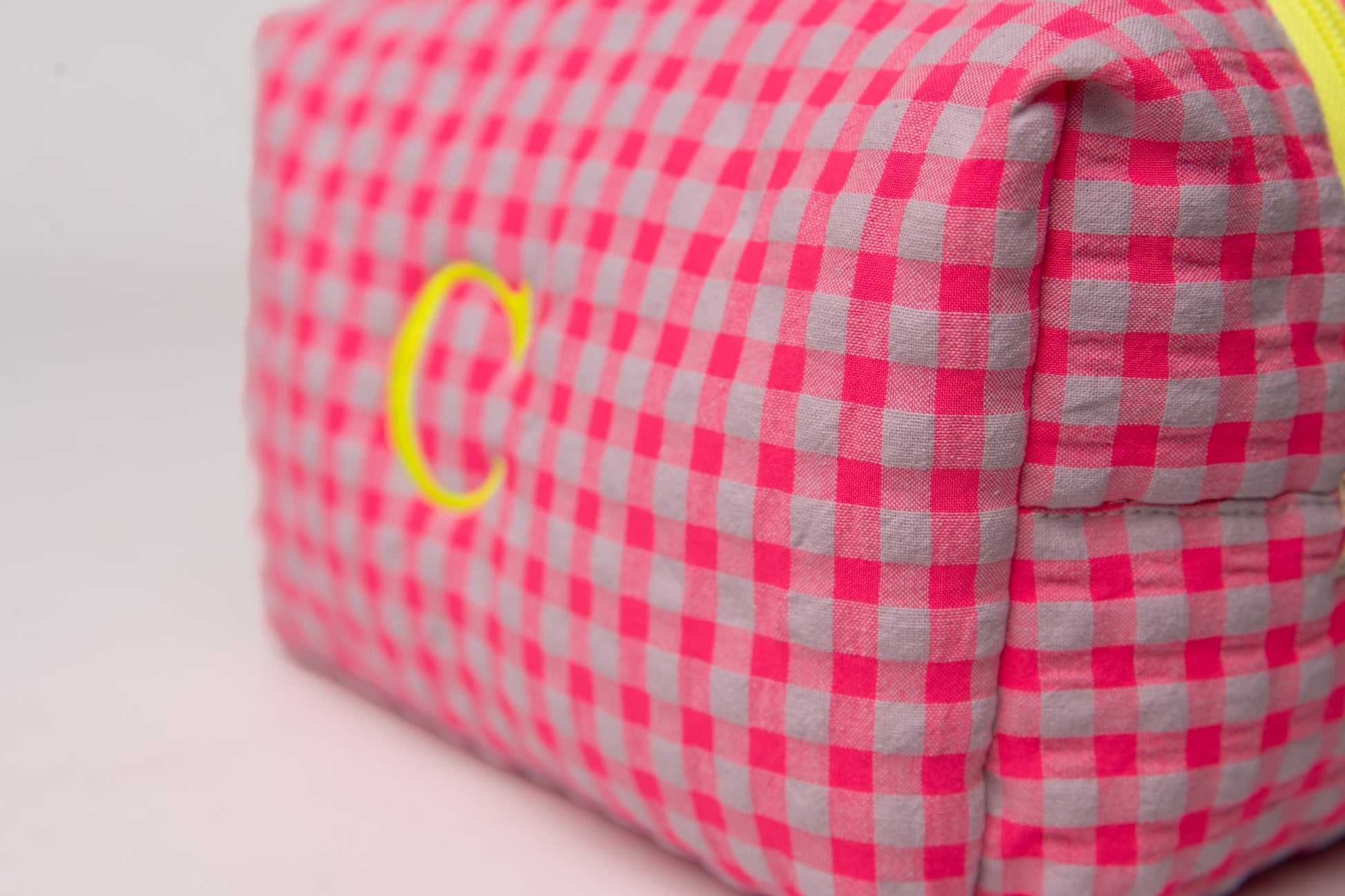 Este neceser de tamaño mediano es el accesorio ideal para llevar tus esenciales de belleza y viaje con estilo. Su diseño encantador combina un exterior de vichy seersucker en tonos fluor pink, con un acabado vibrante y llamativo. Su estética clásica y minimalista lo convierte en un complemento imprescindible para el día a día.