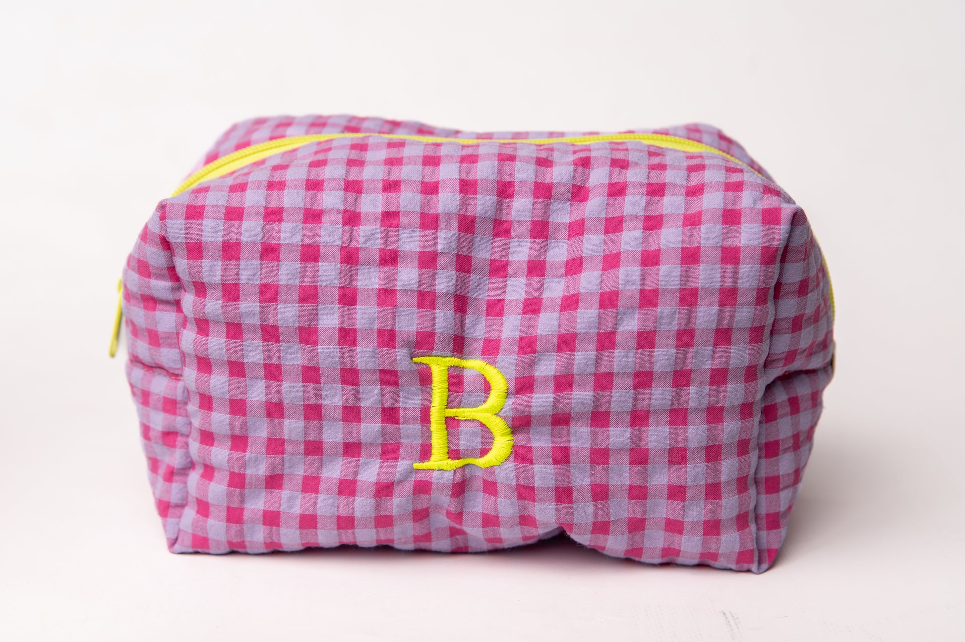Este neceser de tamaño mediano es el accesorio ideal para llevar tus esenciales de belleza y viaje con estilo. Su diseño encantador combina un exterior de vichy seersucker en lavender, con un toque delicado y moderno. Su estética clásica y minimalista lo convierte en un complemento imprescindible para el día a día.