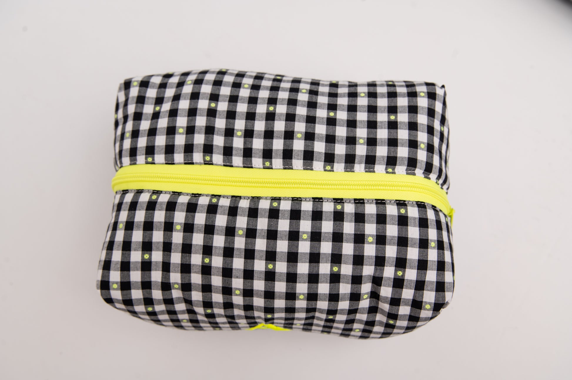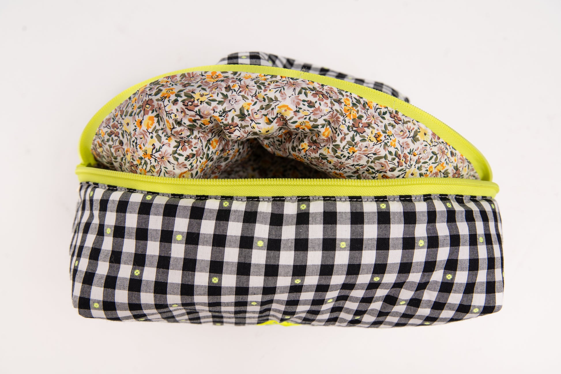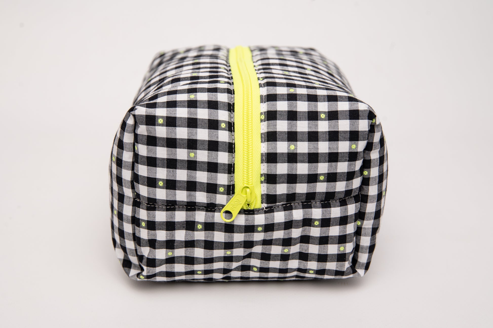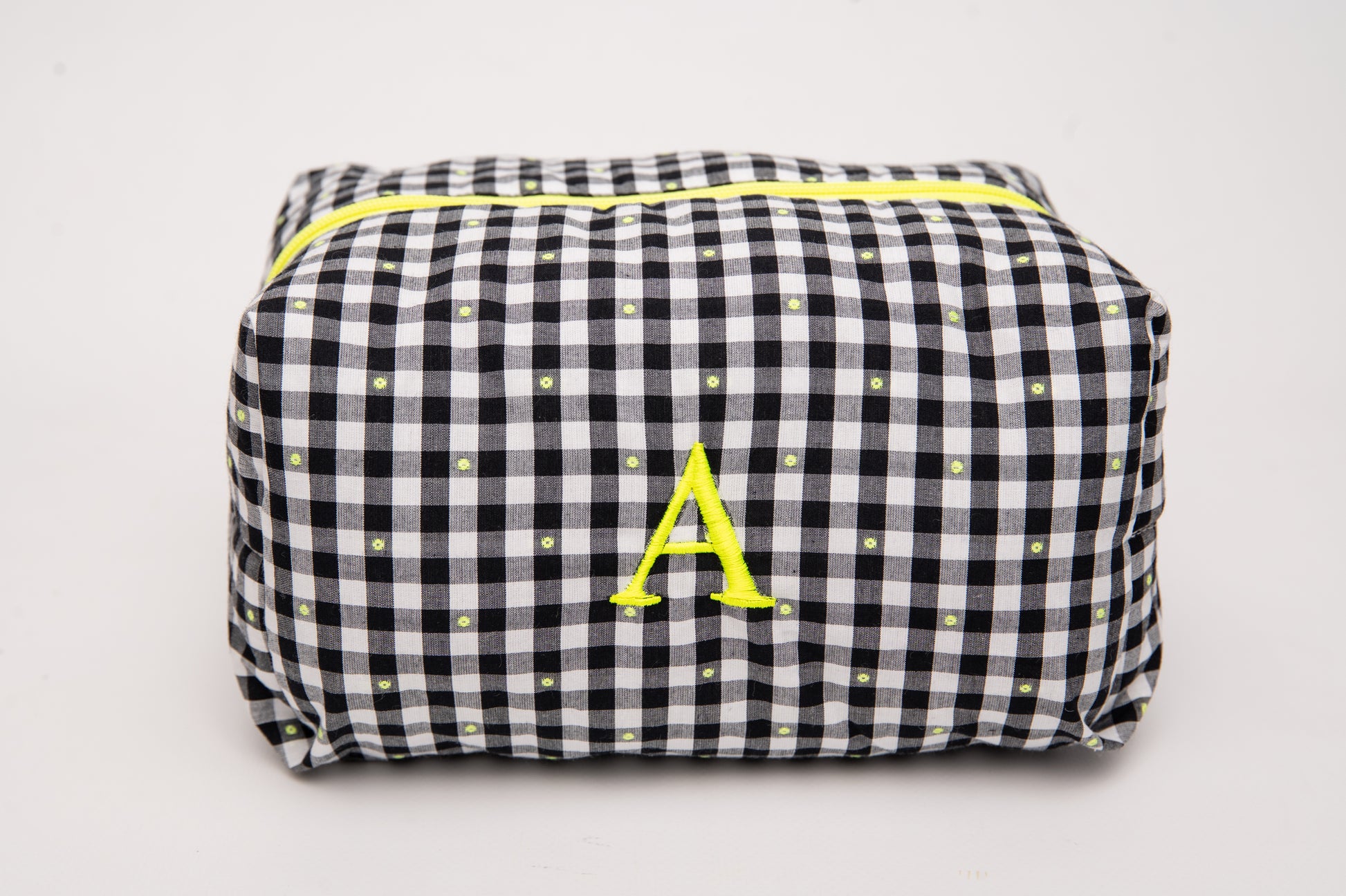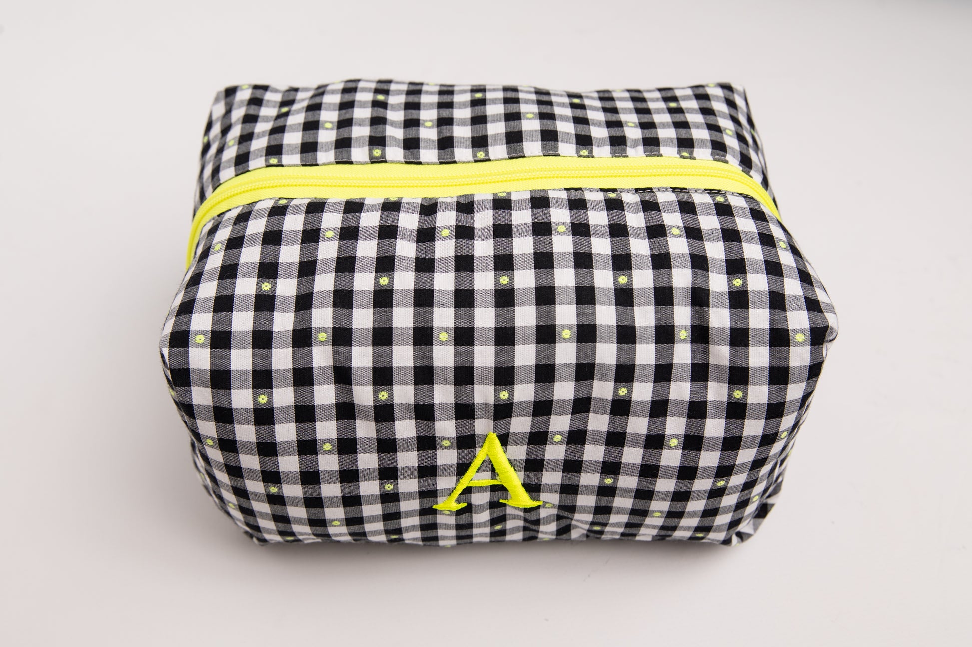 Este neceser de tamaño mediano es el accesorio ideal para llevar tus esenciales de belleza y viaje con estilo. Su diseño encantador combina un exterior de vichy seersucker en color black, con un toque vibrante y cálido. Su estética clásica y minimalista lo convierte en un complemento imprescindible para el día a día.