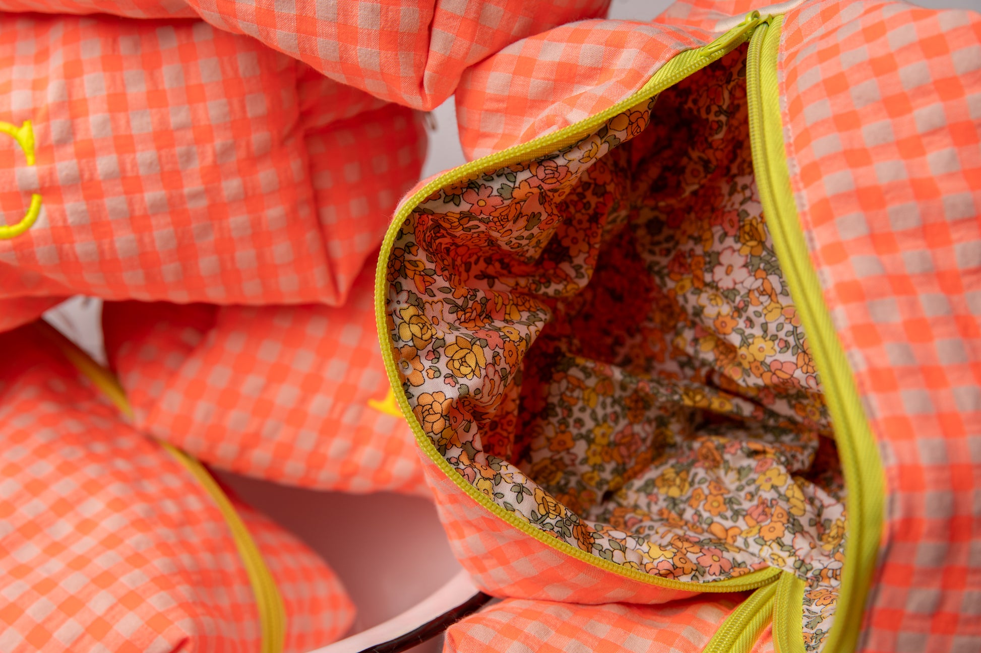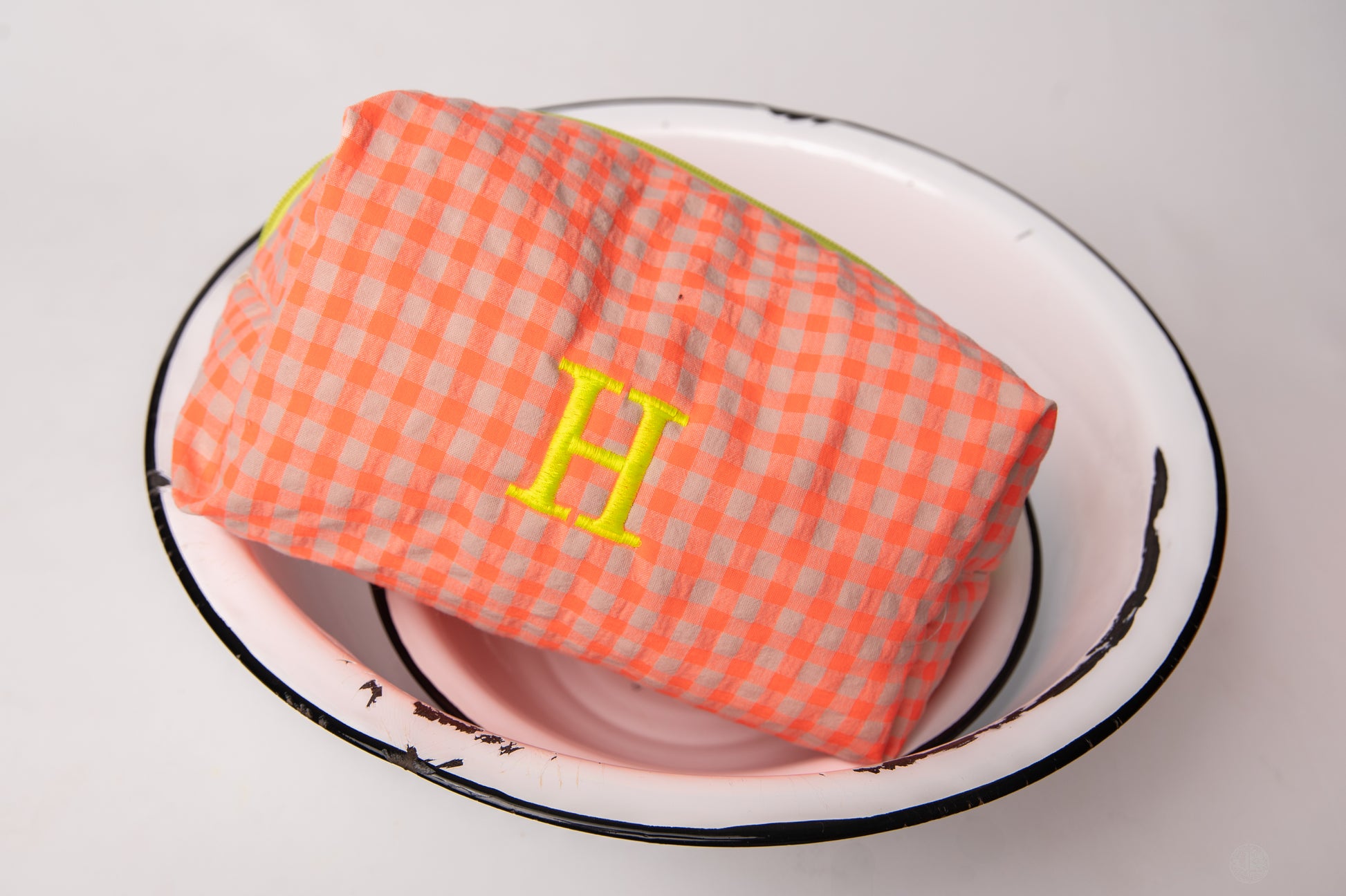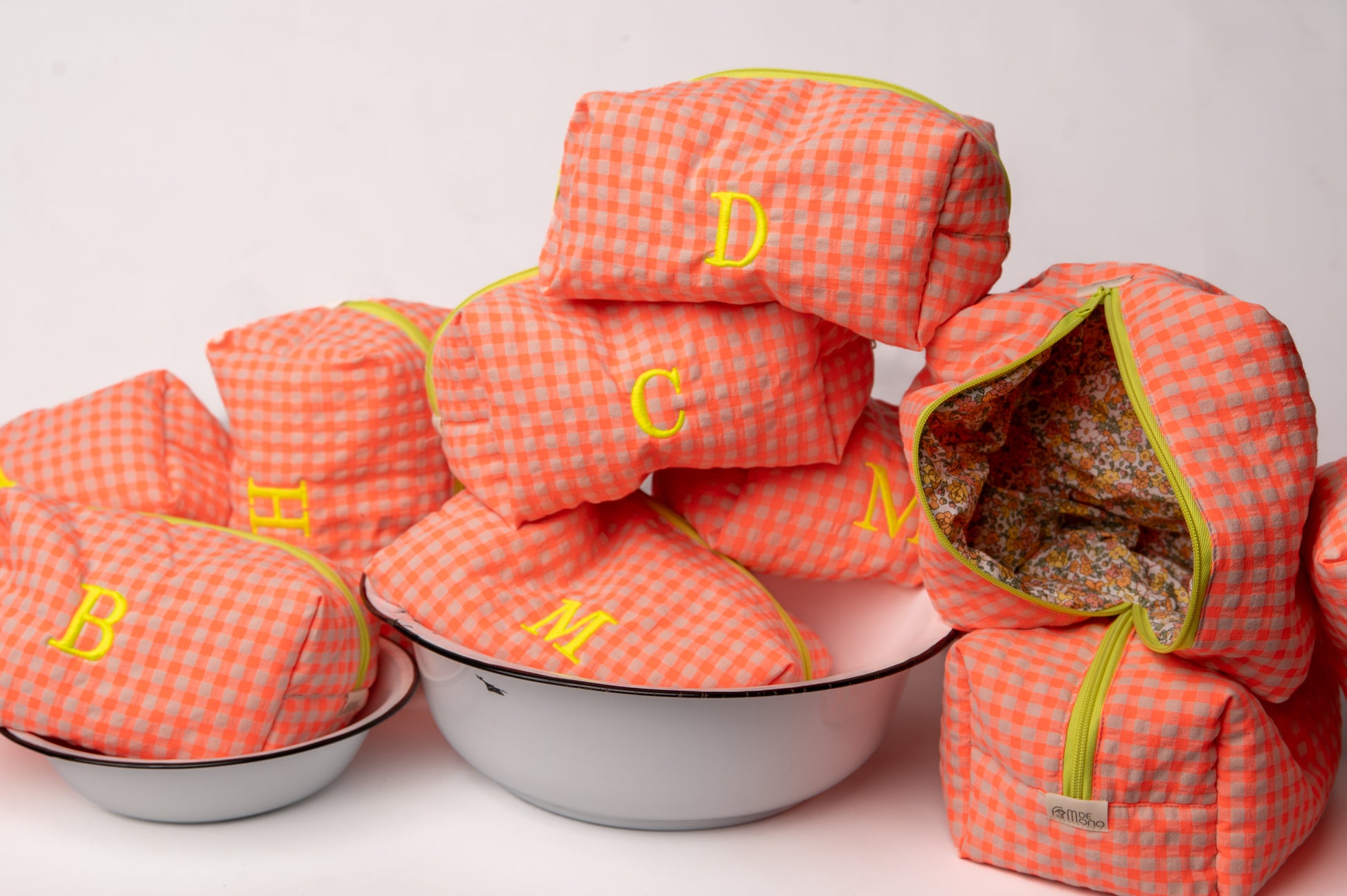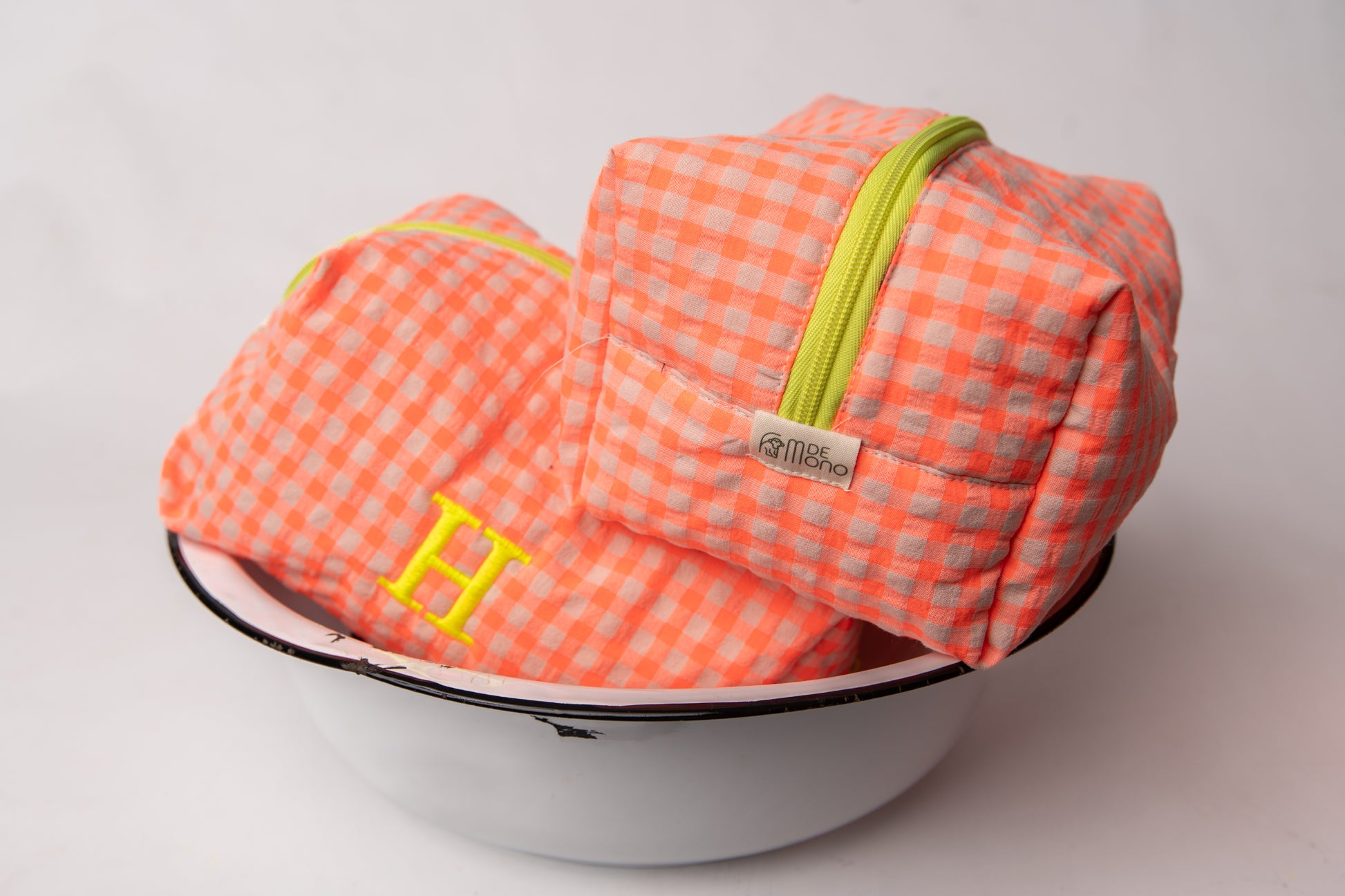 Este neceser de tamaño mediano es el accesorio ideal para llevar tus esenciales de belleza y viaje con estilo. Su diseño encantador combina un exterior de vichy seersucker en orange fluor, con un toque cálido y vibrante. Su estética clásica y minimalista lo convierte en un complemento imprescindible para el día a día.