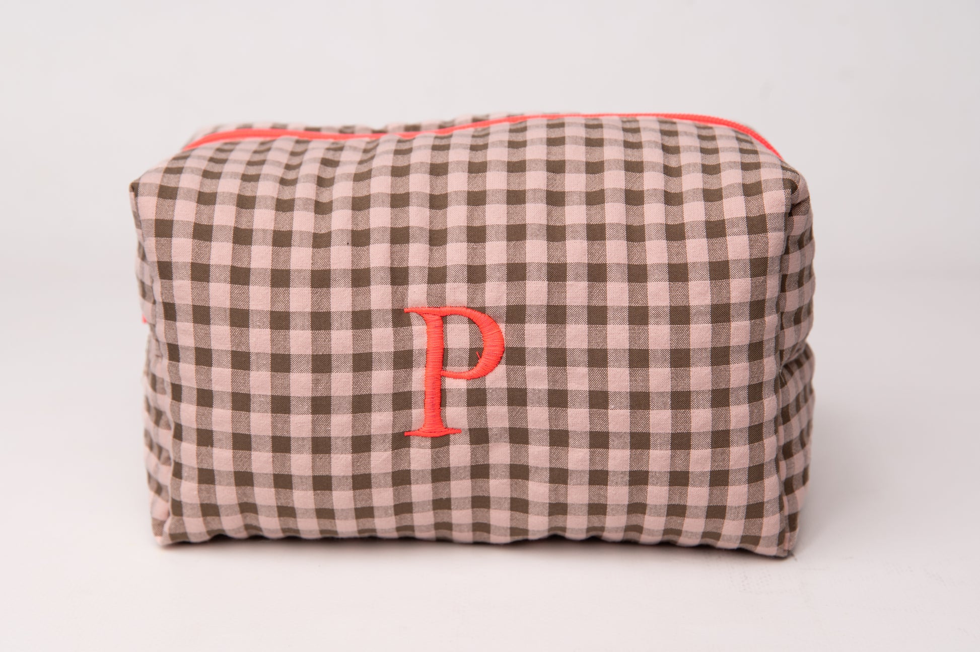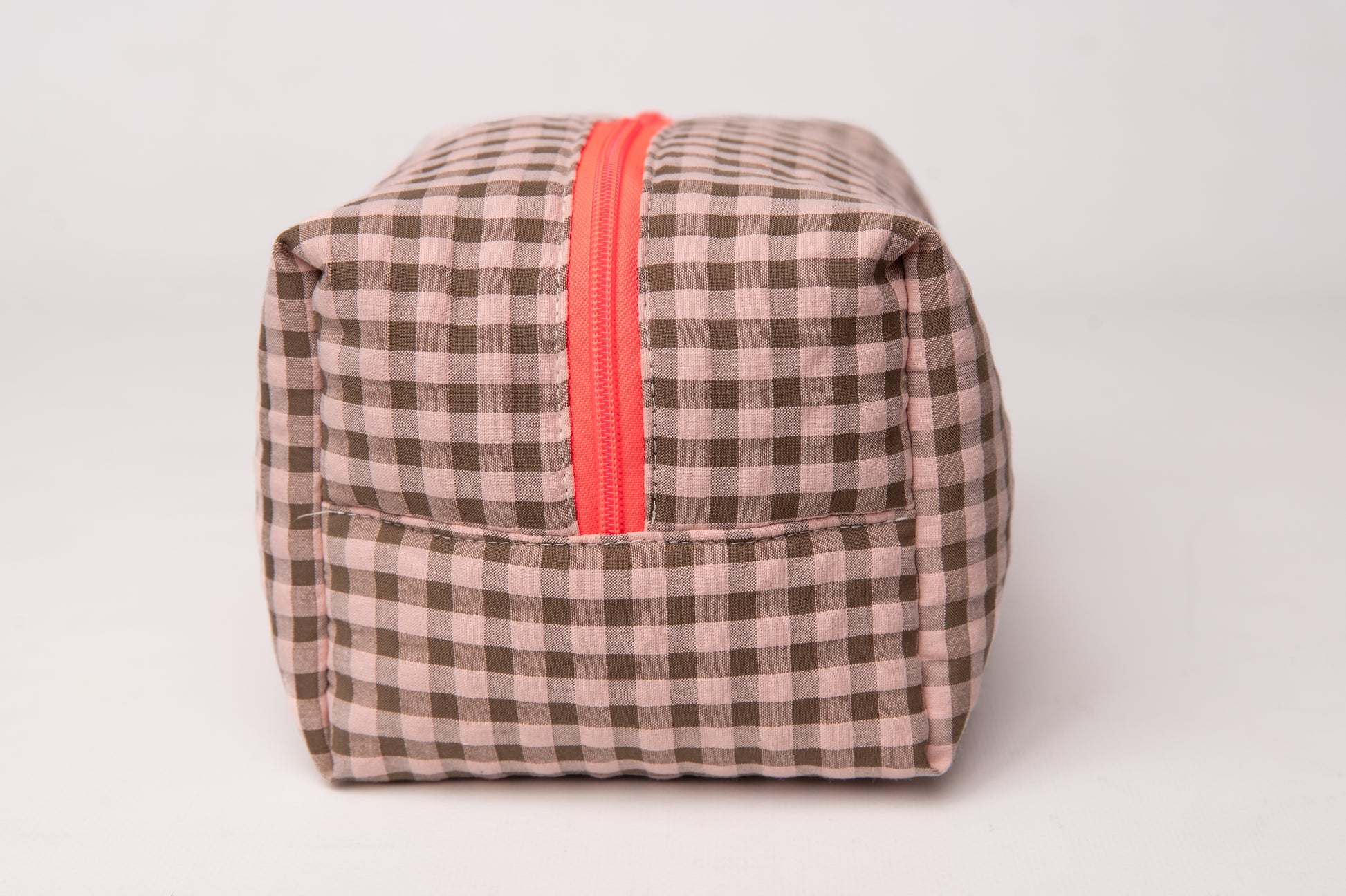 Este neceser de tamaño mediano es el accesorio ideal para llevar tus esenciales de belleza y viaje con estilo. Su diseño encantador combina un exterior de vichy seersucker en rosé, con un toque cálido y sofisticado. Su estética clásica y minimalista lo convierte en un complemento imprescindible para el día a día.