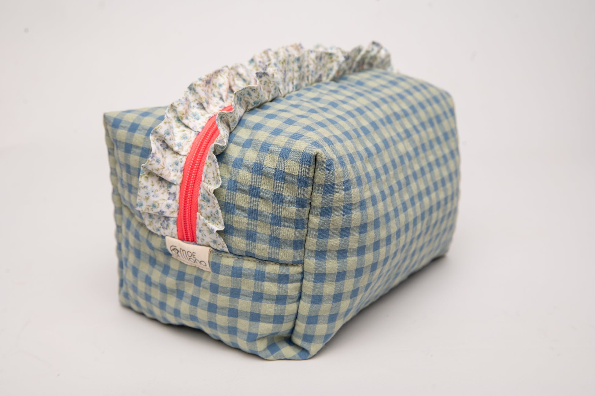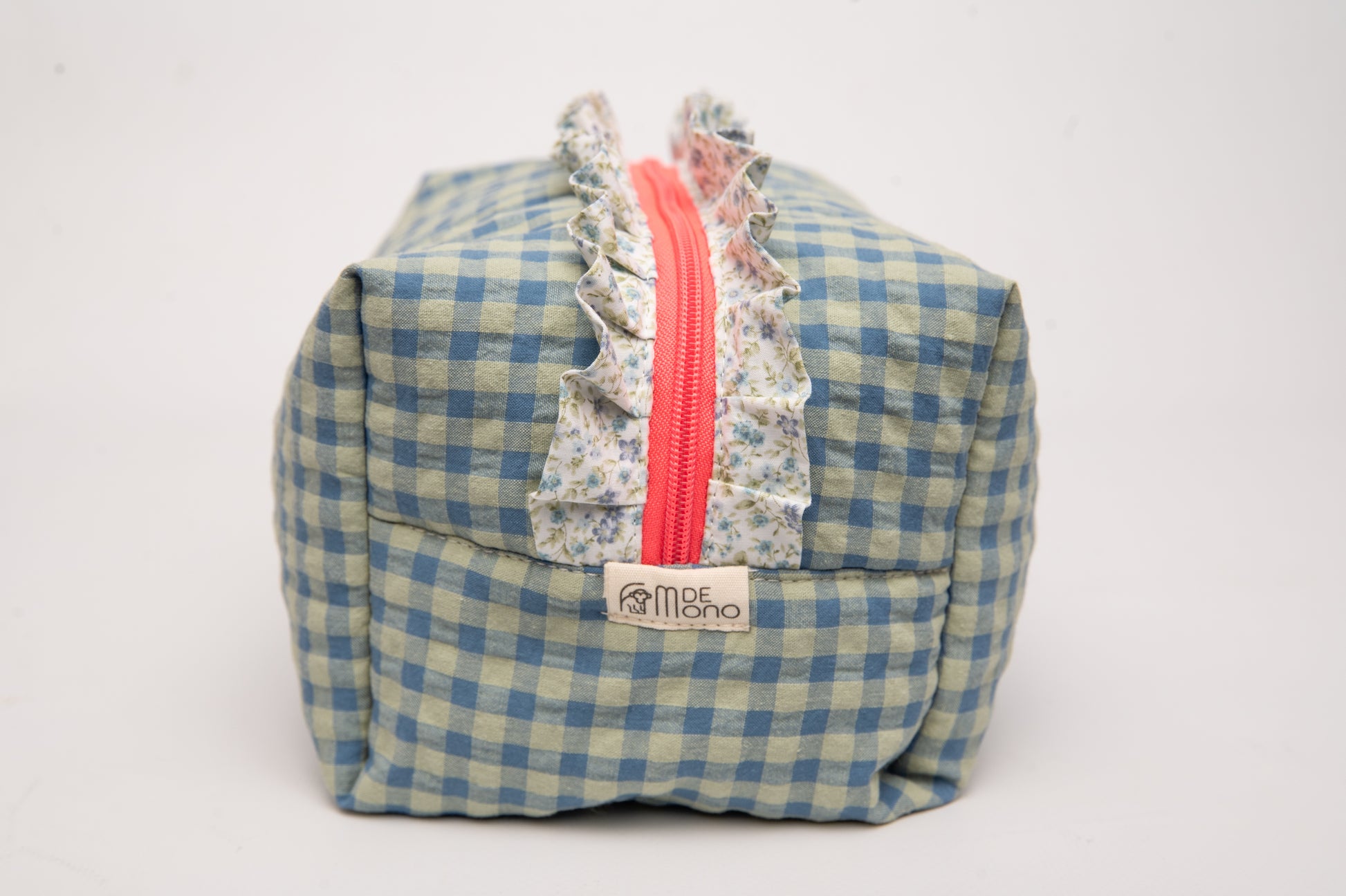 Este neceser de tamaño mediano es el accesorio ideal para llevar tus esenciales de belleza y viaje con estilo. Su diseño encantador combina un exterior de vichy seersucker en tono blue, con un toque sofisticado y atemporal. Los volantes decorativos aportan un aire romántico y femenino, haciendo de este neceser una pieza única.