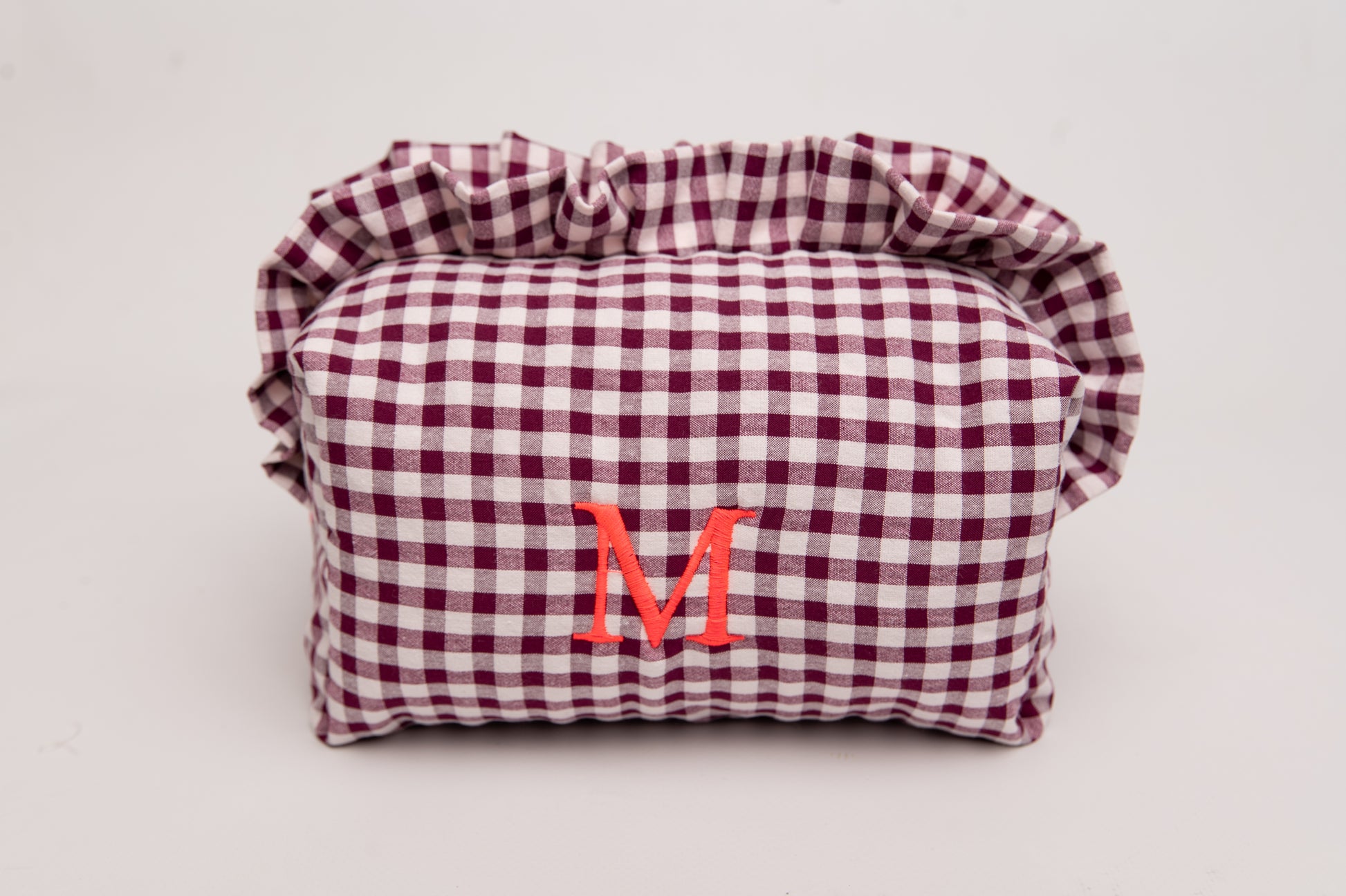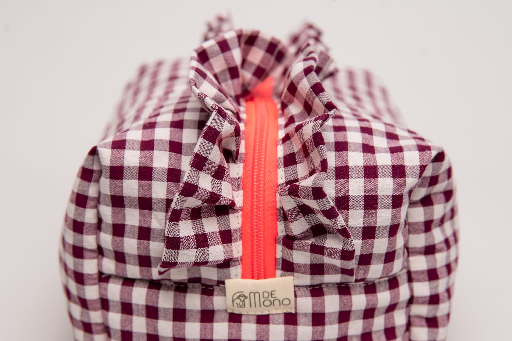 Este neceser de tamaño mediano es el accesorio ideal para llevar tus esenciales de belleza y viaje con estilo. Su diseño encantador combina un exterior de vichy seersucker en tono pink wood, con un toque sofisticado y atemporal. Los volantes decorativos aportan un aire romántico y femenino, haciendo de este neceser una pieza única.