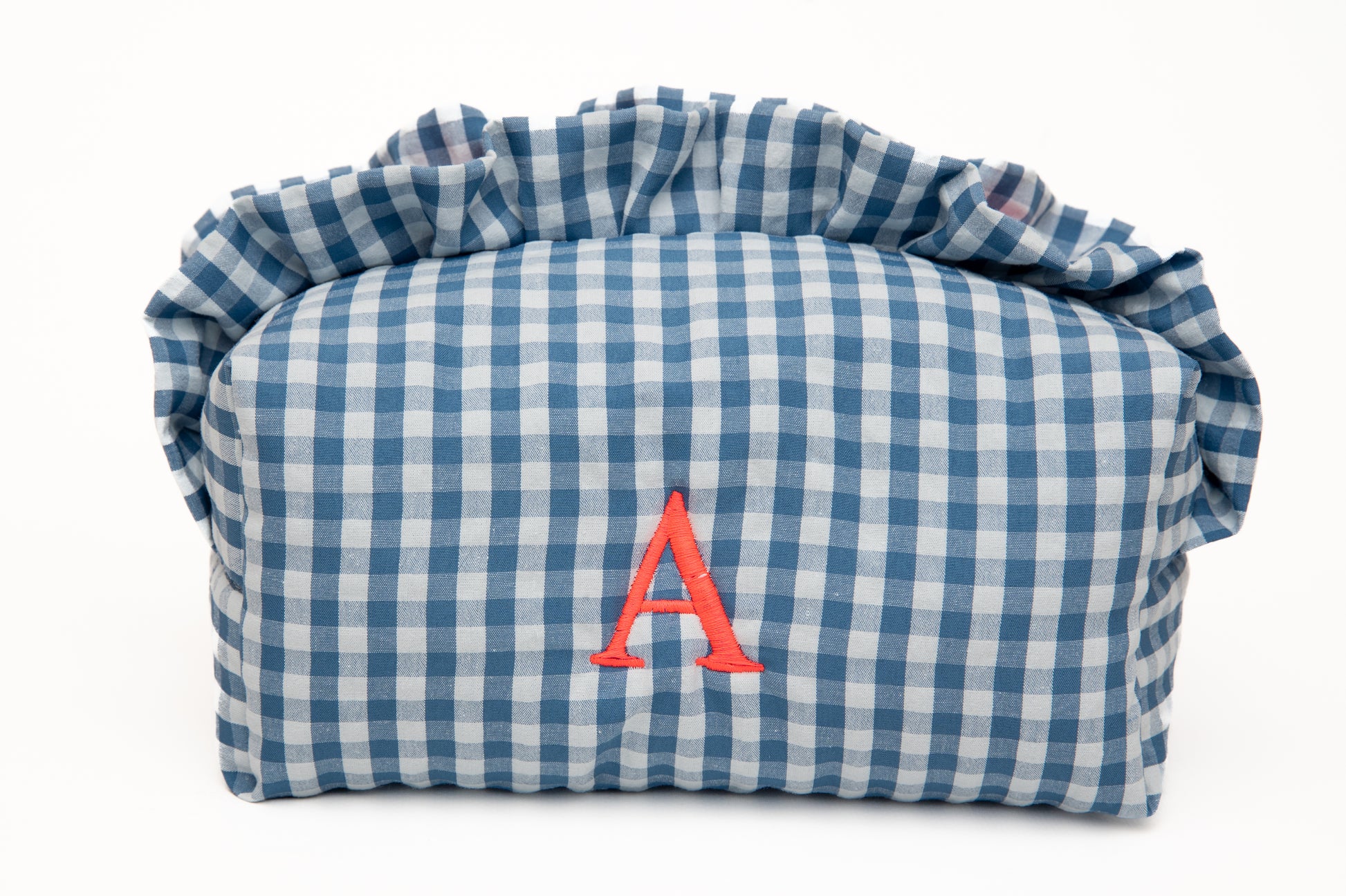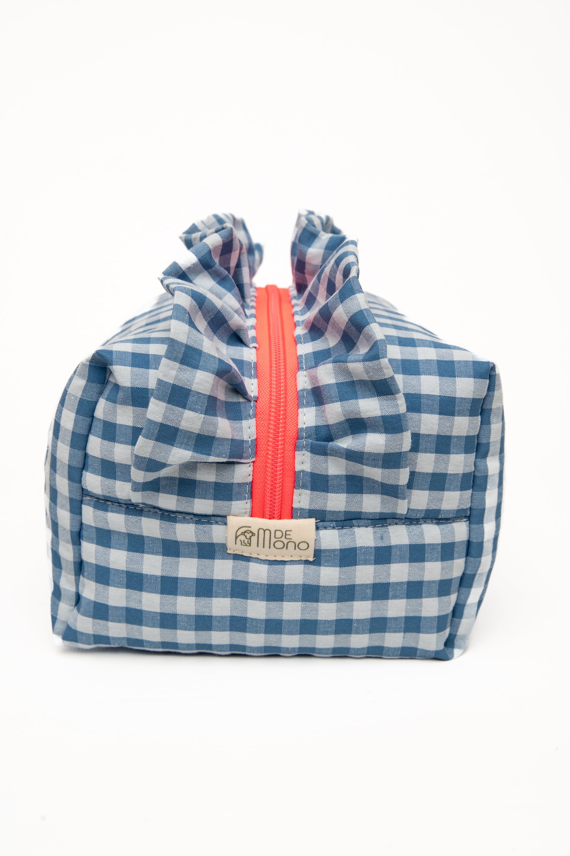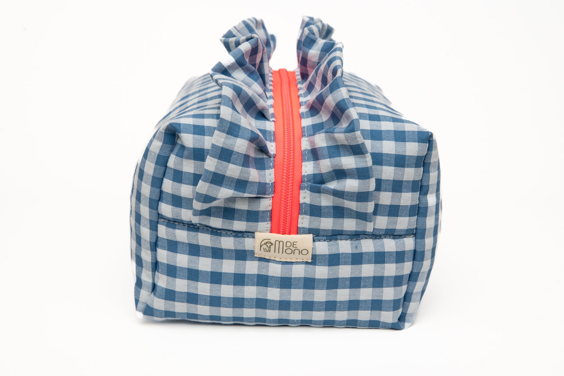 Este neceser de tamaño mediano es el accesorio ideal para llevar tus esenciales de belleza y viaje con estilo. Su diseño encantador combina un exterior de vichy seersucker en azul, con un contraste llamativo y elegante. Su estética clásica y minimalista lo convierte en un complemento imprescindible para el día a día. Los volantes decorativos aportan un aire romántico y femenino, haciendo de este neceser una pieza única.