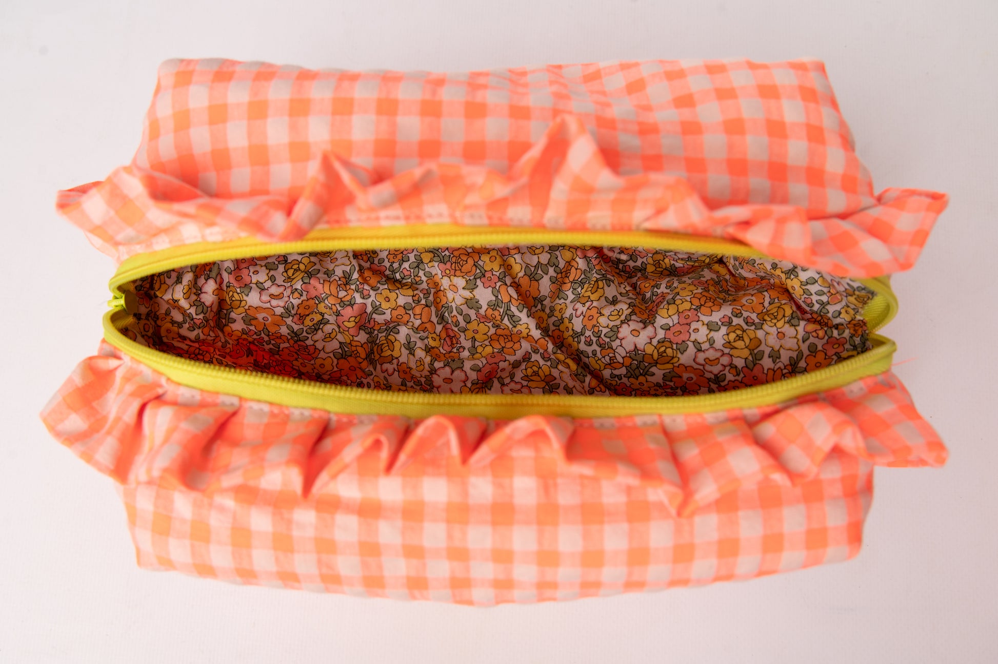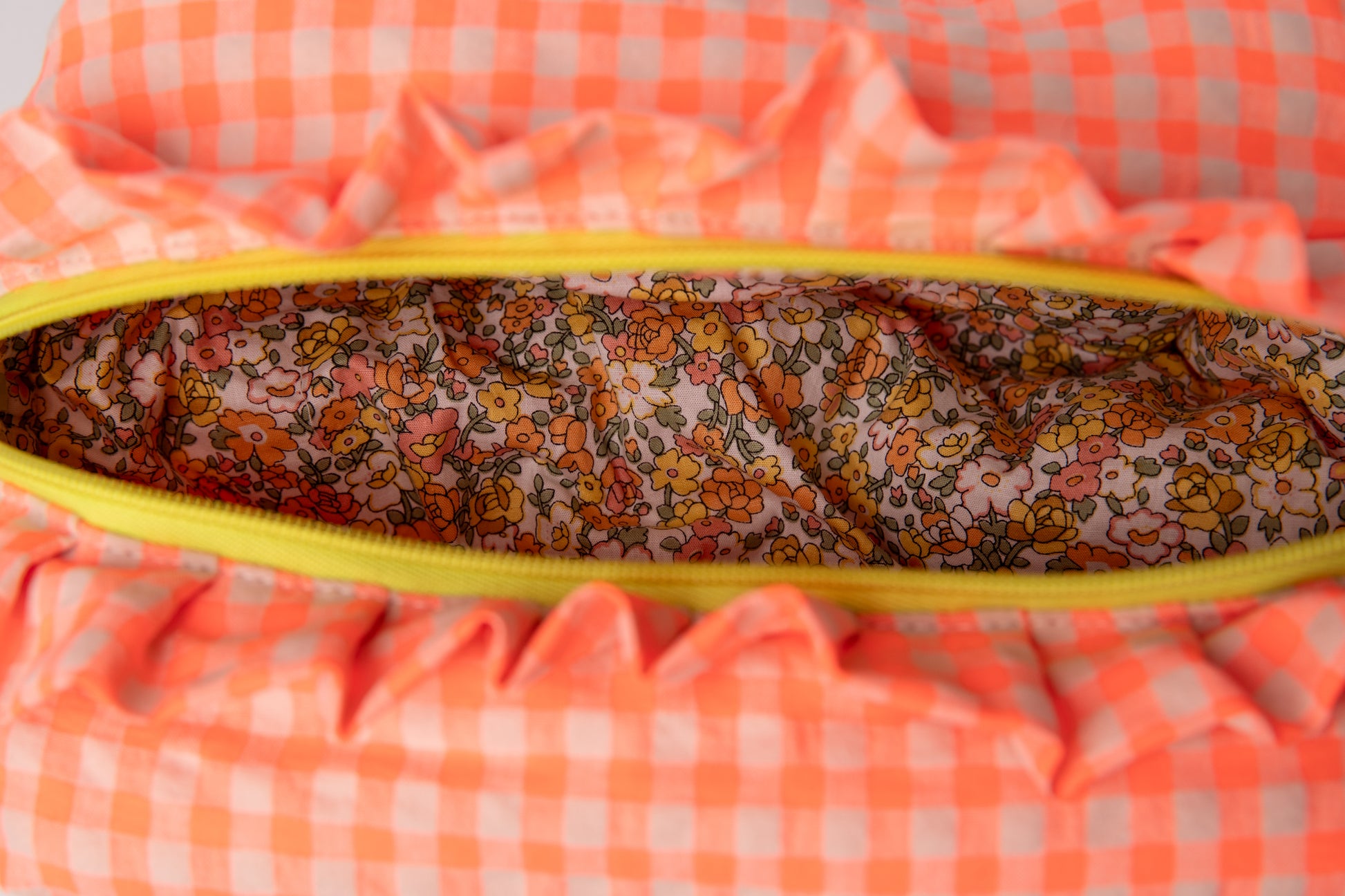 Este neceser de tamaño mediano es el accesorio ideal para llevar tus esenciales de belleza y viaje con estilo. Su diseño encantador combina un exterior de vichy seersucker en orange fluor, con un toque cálido y vibrante. Los volantes decorativos aportan un aire romántico y femenino, convirtiéndolo en una pieza única.