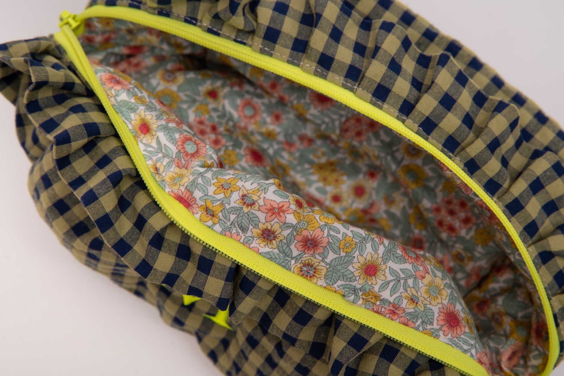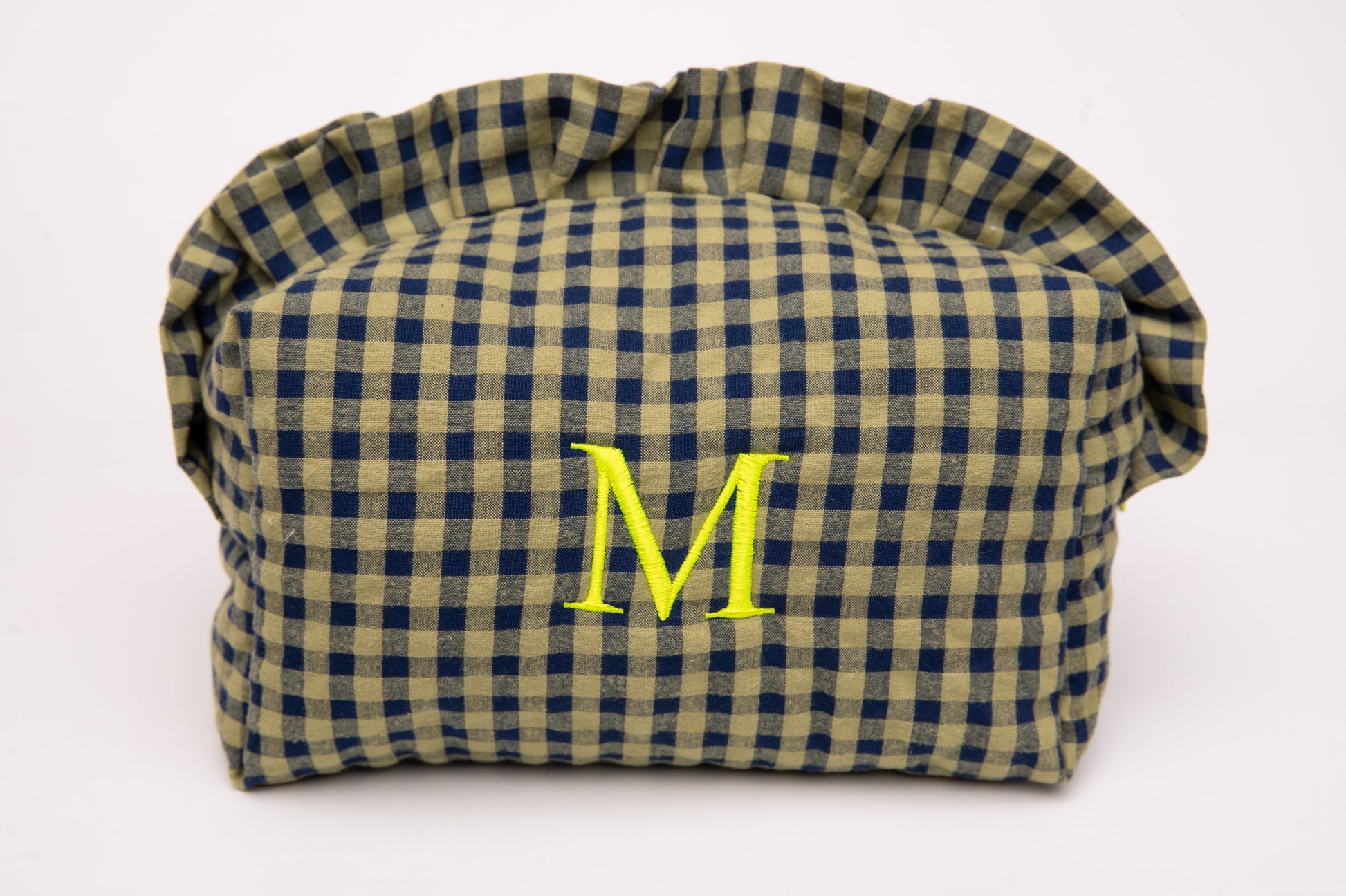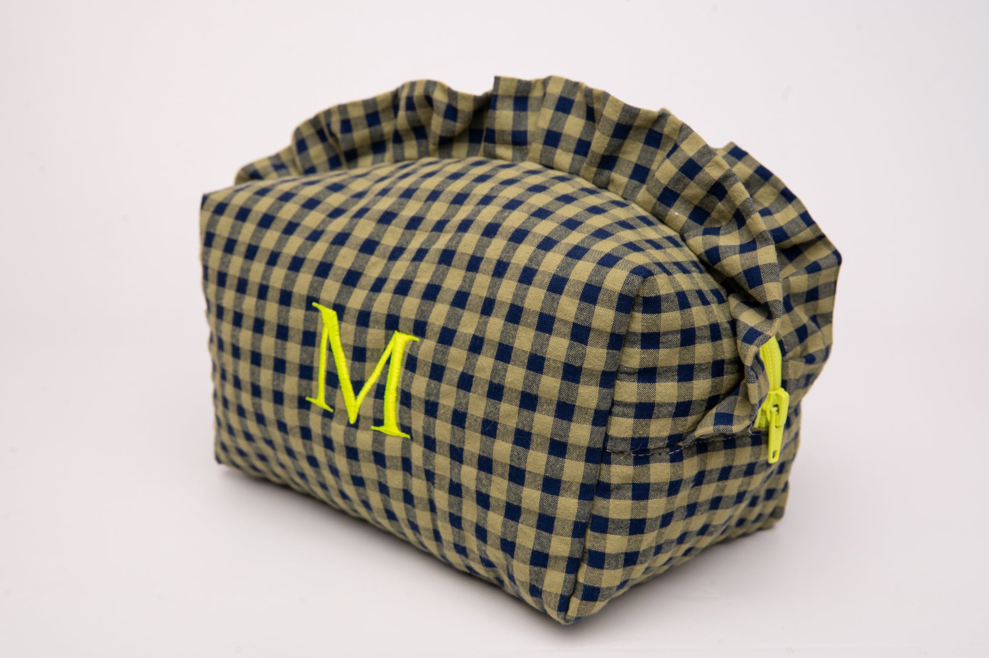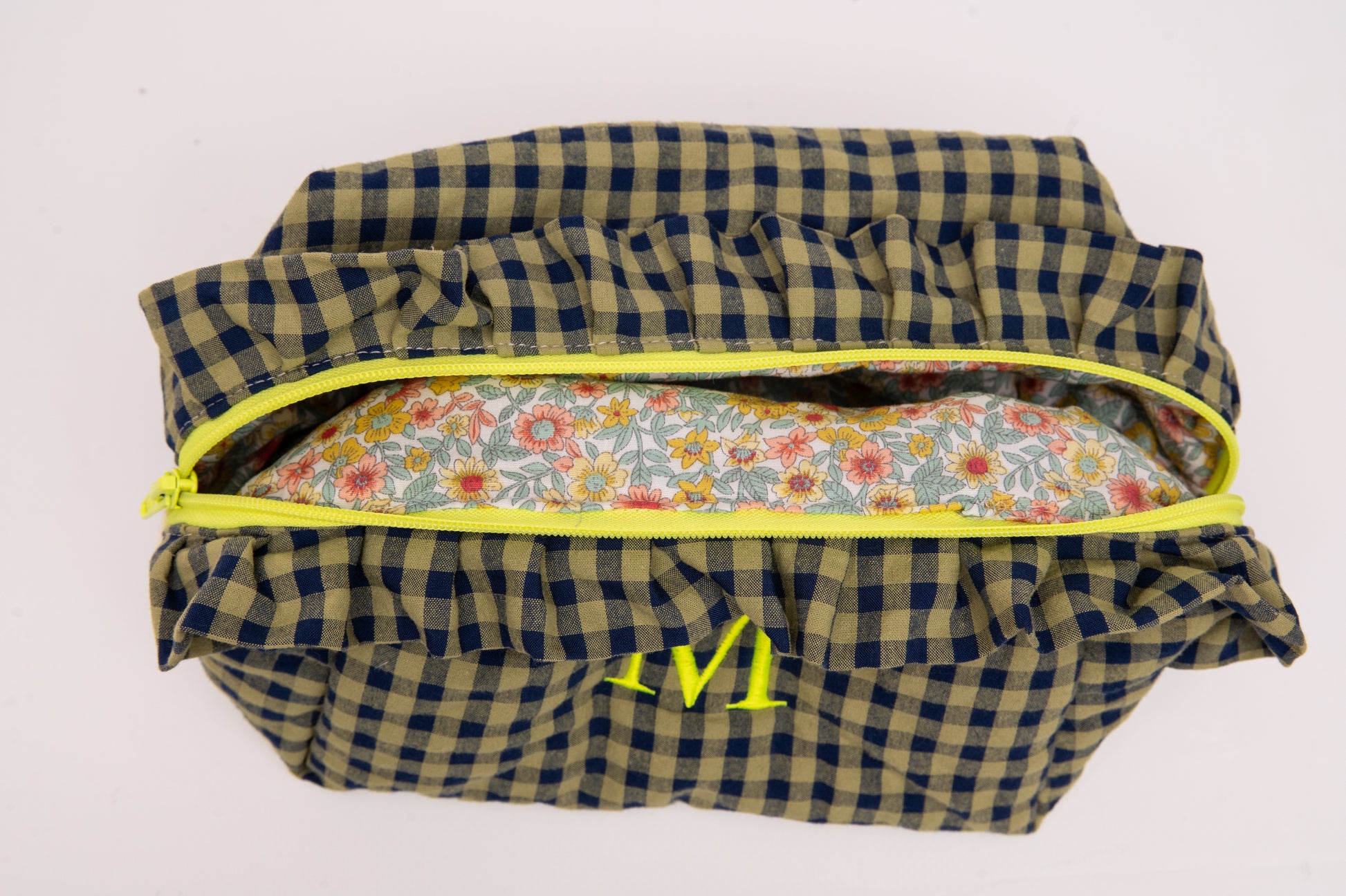 Este neceser de tamaño mediano es el accesorio ideal para llevar tus esenciales de belleza y viaje con estilo. Su diseño encantador combina un exterior de vichy seersucker en tono olive, con un toque sofisticado y atemporal. Los volantes decorativos aportan un aire romántico y femenino, haciendo de este neceser una pieza única.
