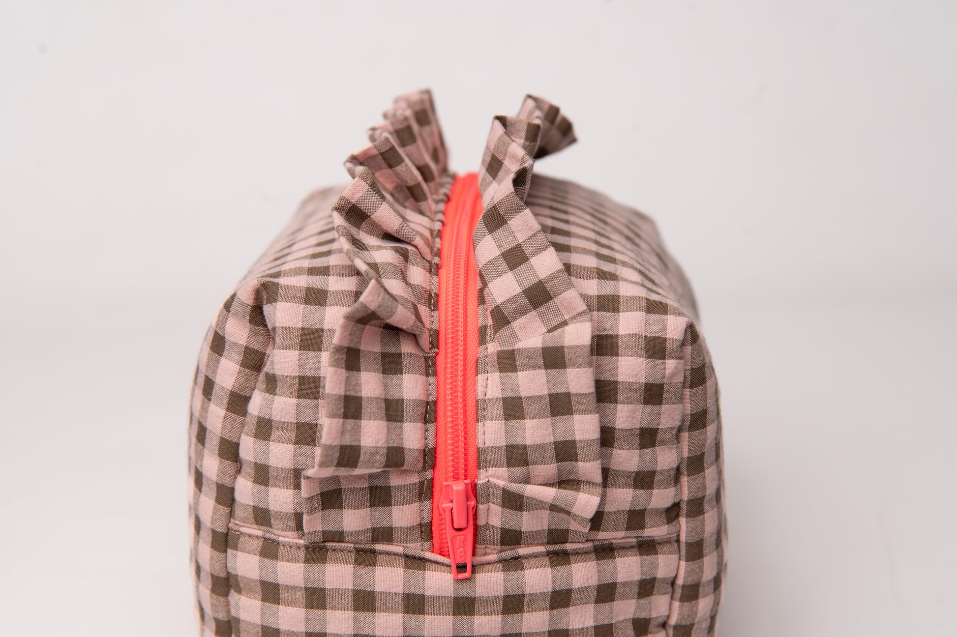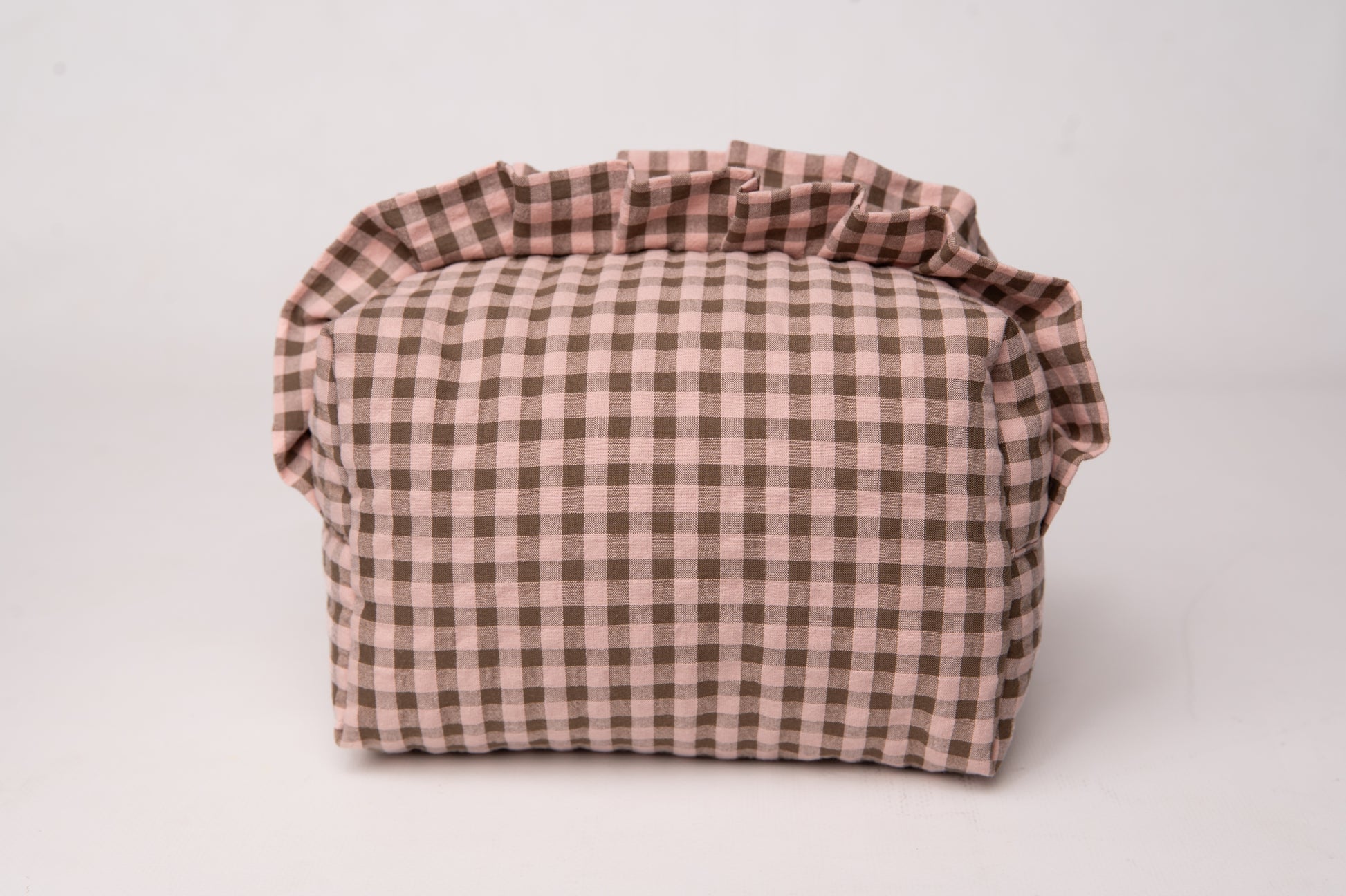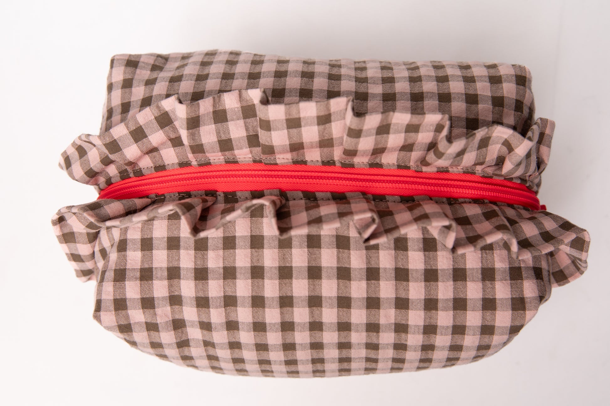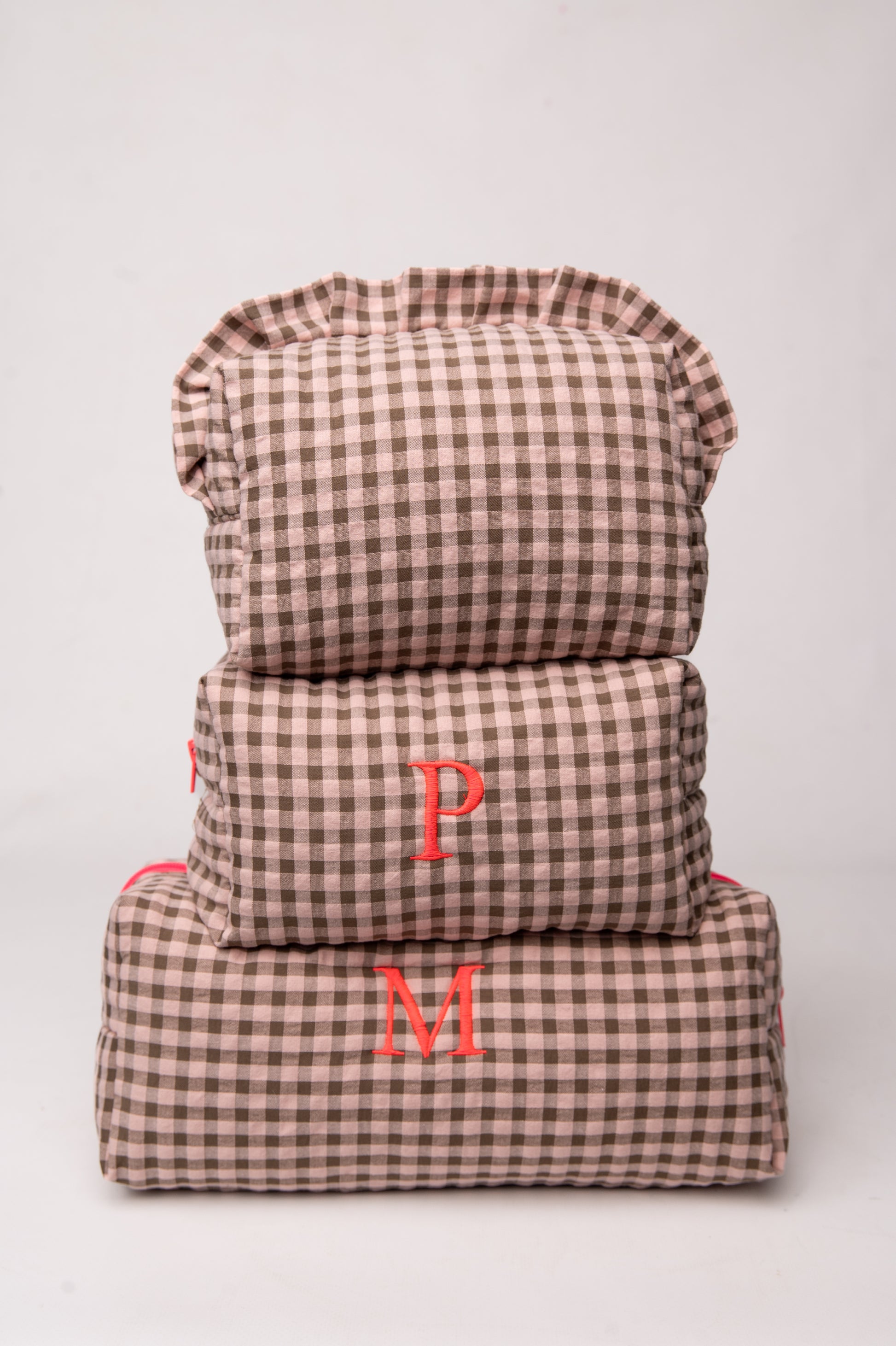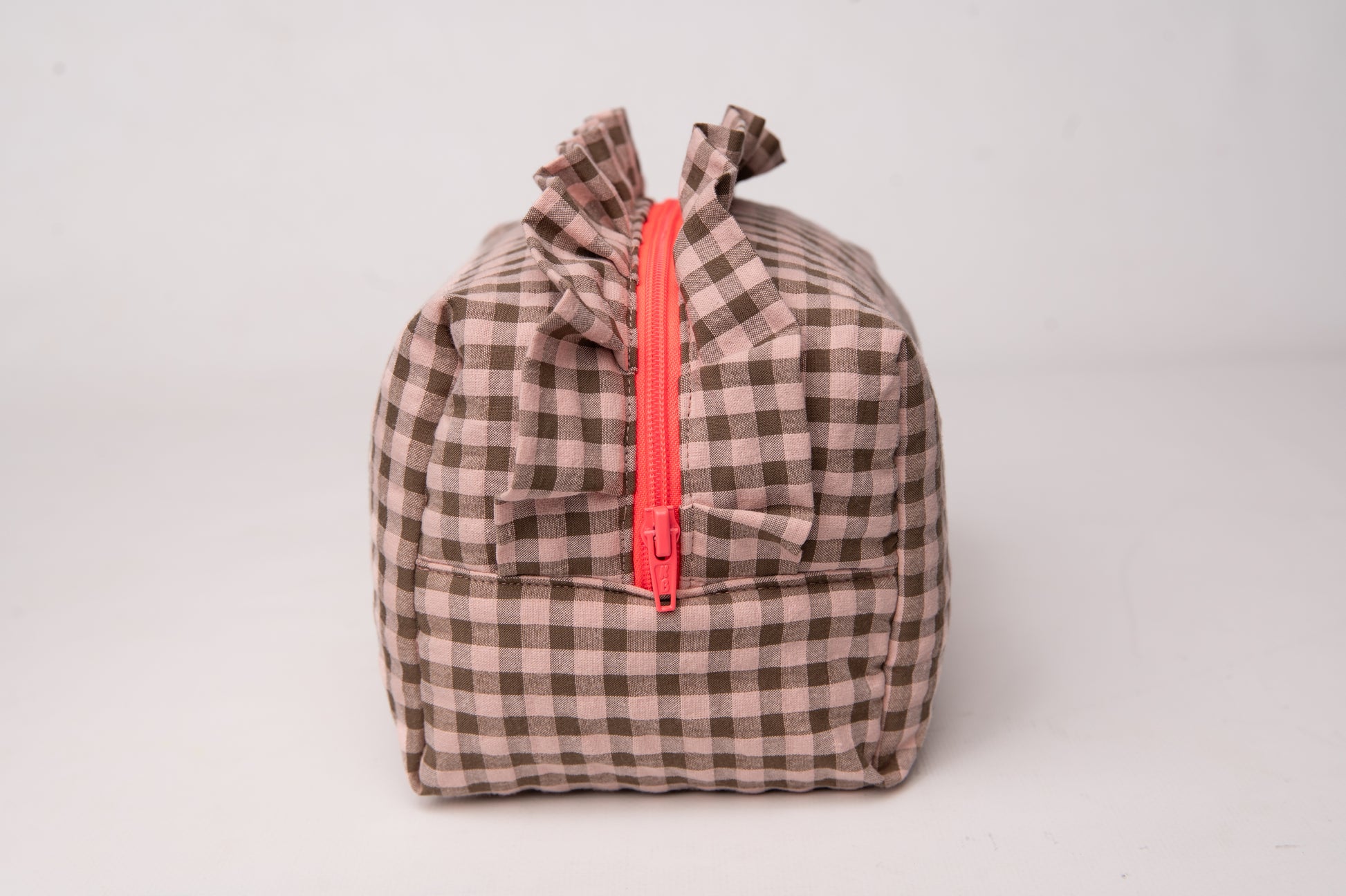 Este neceser de tamaño mediano es el accesorio ideal para llevar tus esenciales de belleza y viaje con estilo. Su diseño encantador combina un exterior de vichy seersucker en rosé, con un toque sofisticado y atemporal. Los volantes decorativos aportan un aire romántico y femenino, convirtiéndolo en una pieza única.