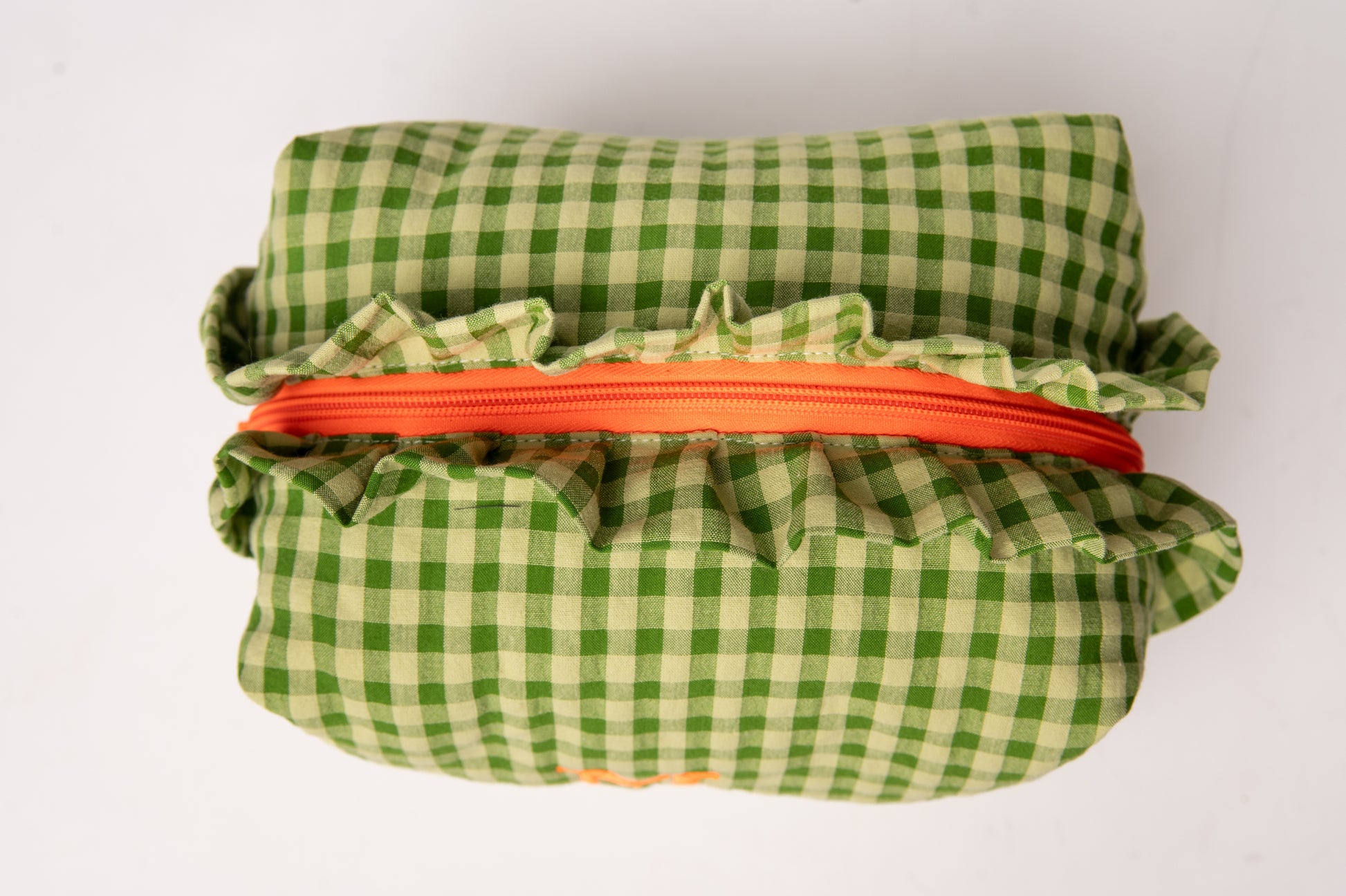 Este neceser de tamaño mediano es el accesorio ideal para llevar tus esenciales de belleza y viaje con estilo. Su diseño vibrante y alegre combina un exterior de vichy seersucker en matcha green, con un contraste llamativo y moderno. Los volantes decorativos aportan un toque romántico y femenino, convirtiéndolo en una pieza especial.