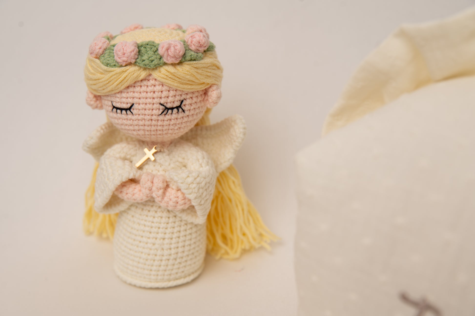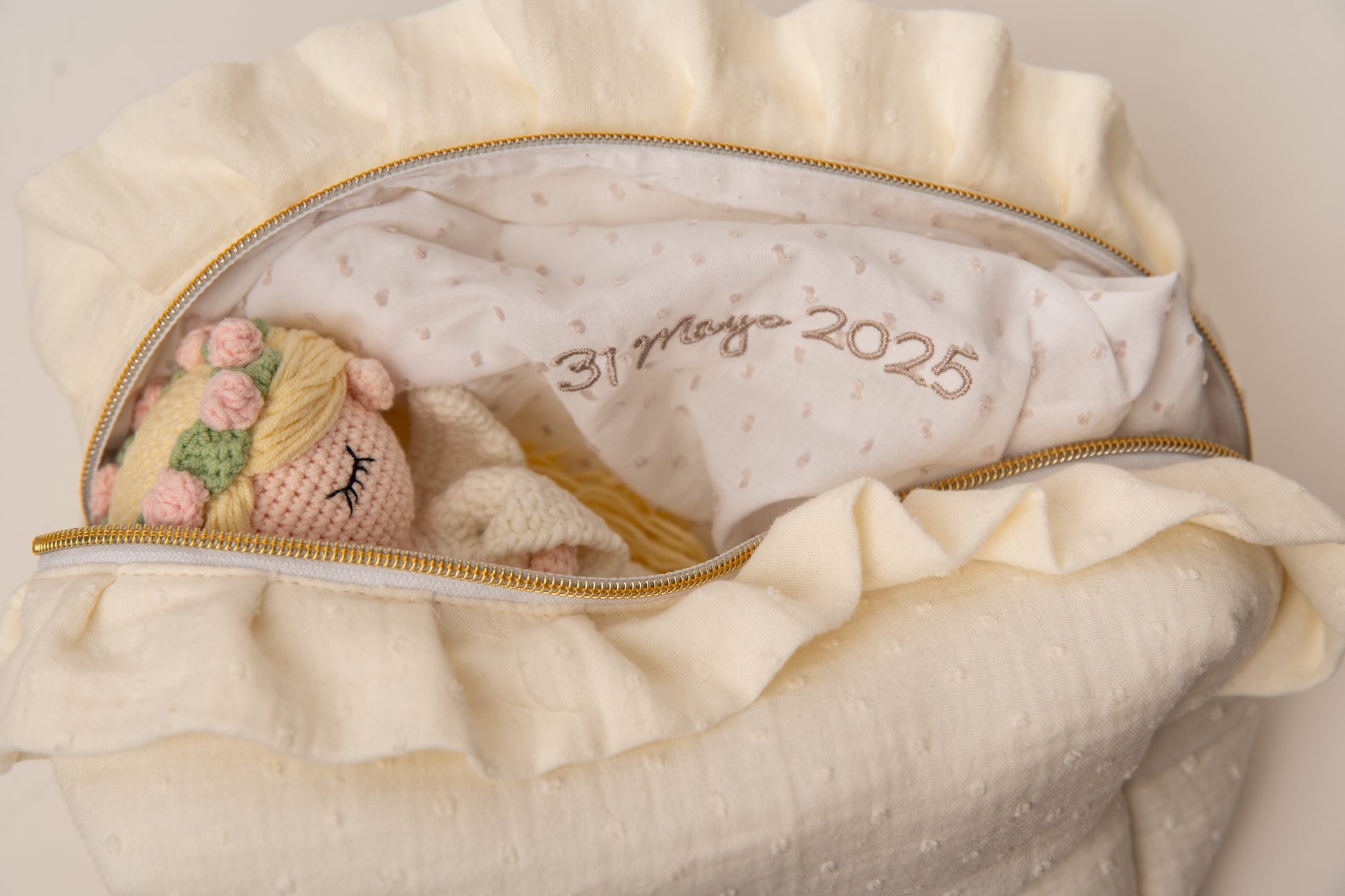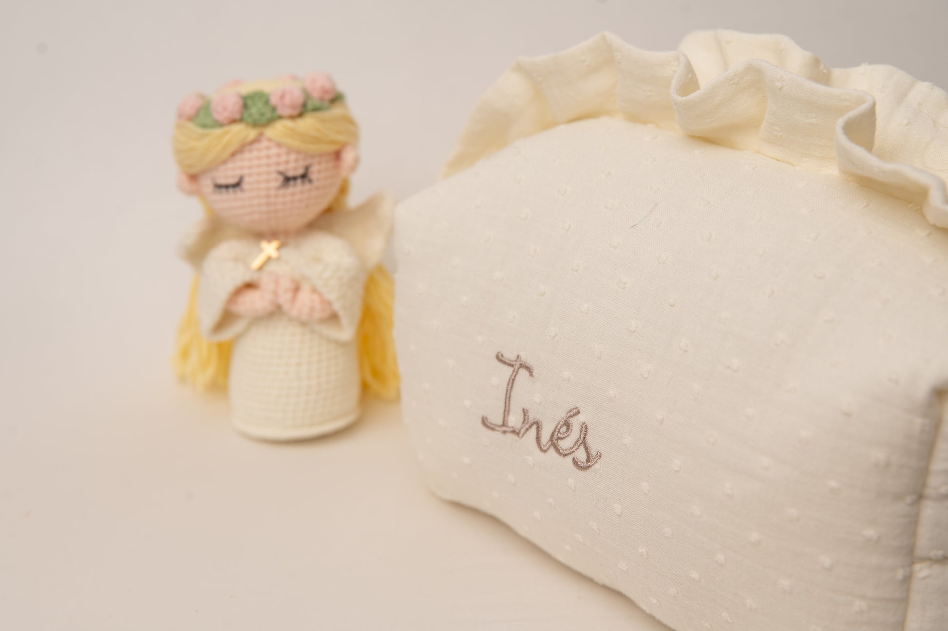 Celebra la Primera Comunión con un detalle lleno de encanto y significado. Este pack incluye un neceser con el nombre bordado, ideal para guardar pequeños tesoros, y una muñeca de comunión tejida artesanalmente, vestida de marfil, con corona de flores y una cruz dorada, que simboliza con ternura este momento tan especial.