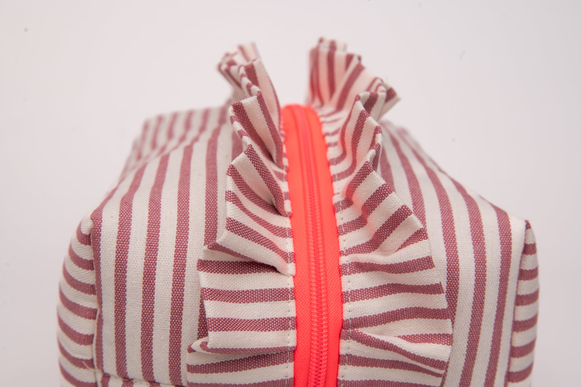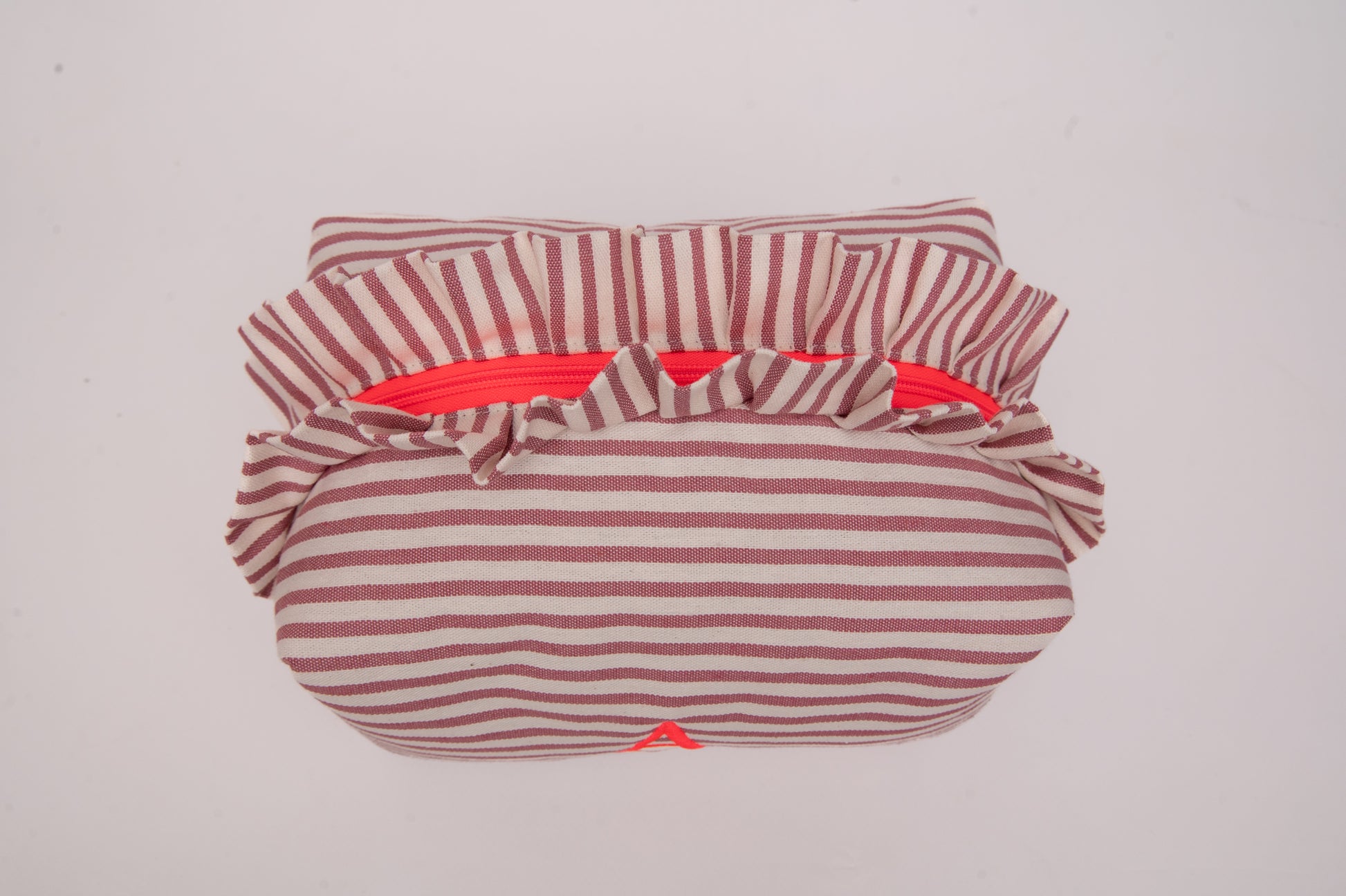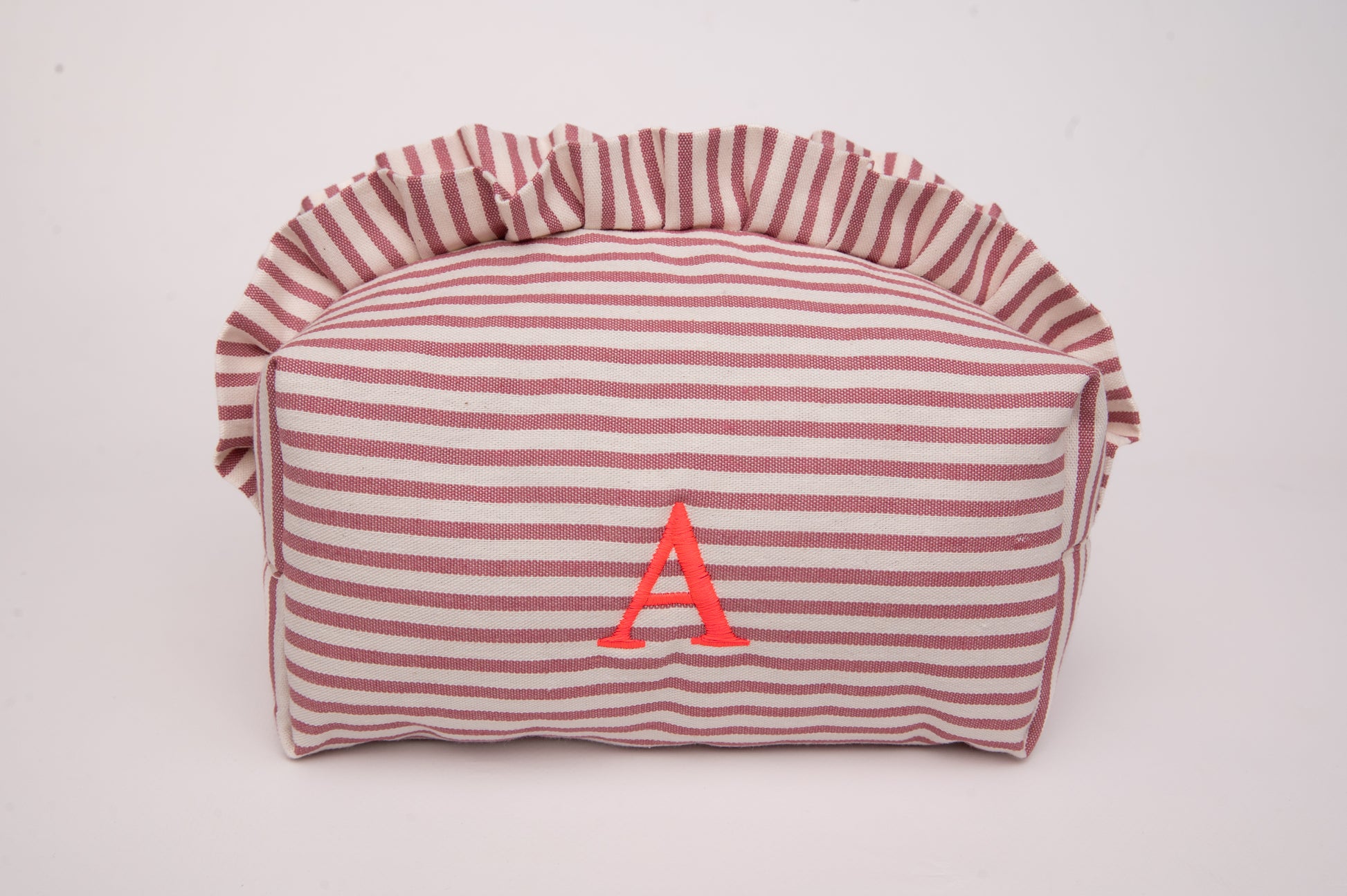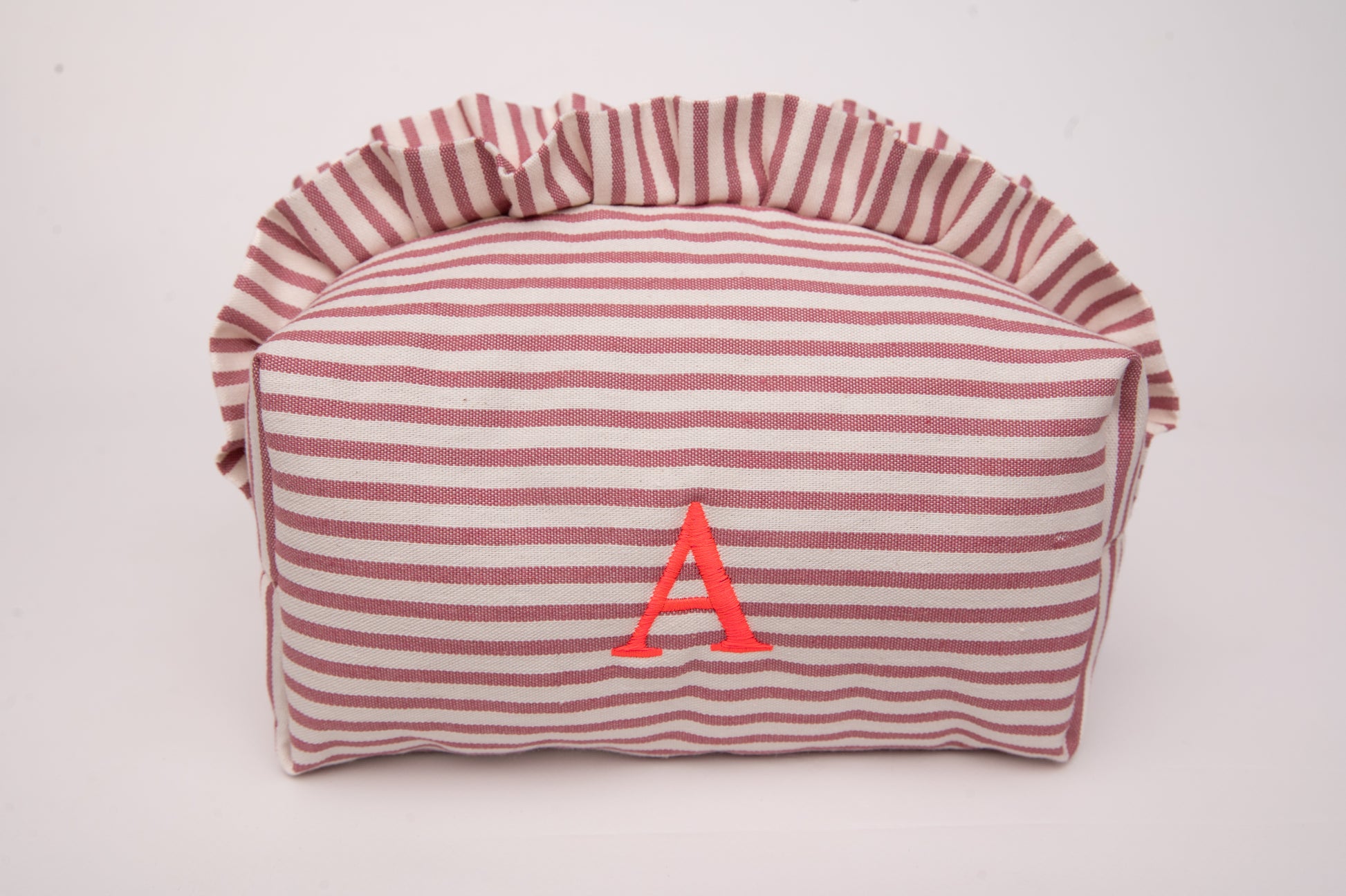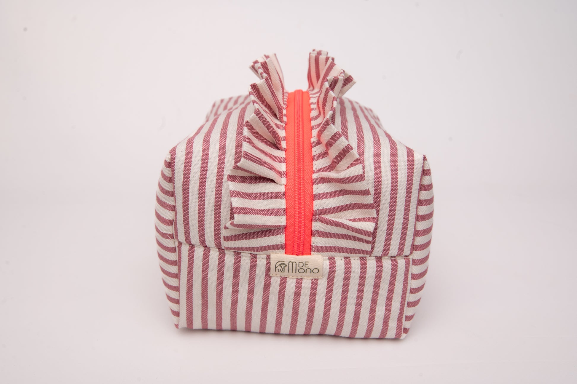 Este neceser de tamaño mediano es el accesorio ideal para llevar tus esenciales de belleza y viaje con estilo. Su diseño encantador combina un exterior de algodón con estampado de rayas en tonos rosa y crudo. Además los volantes le proporciona un toque sofisticado.