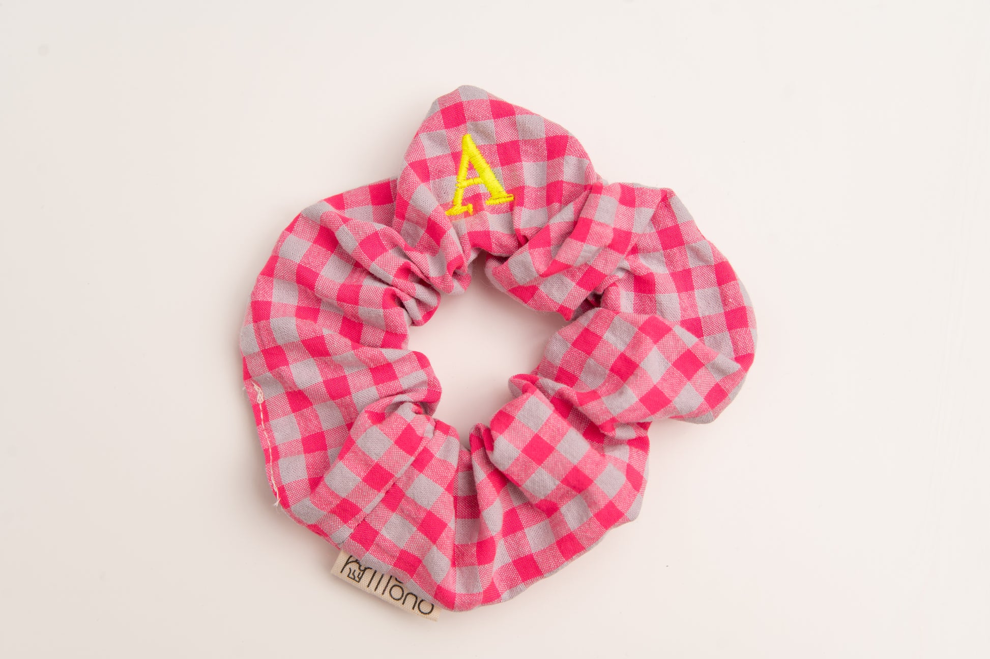 Hecho en seersucker rosa fluor, con su característica textura arrugada y cuadro de 0.60 cm, este scrunchie es alegre y lleno de vida. Personalízalo con una inicial bordada en hilo amarillo neón, perfecta para destacar.