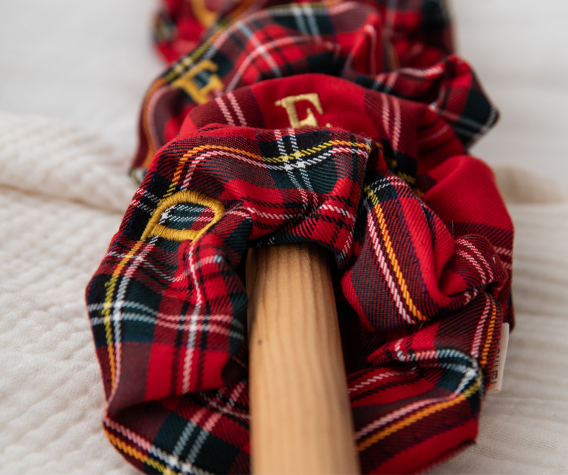 Scrunchie confeccionado en tejido tartán, con su clásico patrón de cuadros que nunca pasa de moda. De tacto suave y con cuerpo, es un accesorio ideal para aportar un toque elegante y atemporal a cualquier peinado. Incluye una inicial personalizada bordada en hilo dorado, que añade un acabado sofisticado y con un toque brillante sutil.